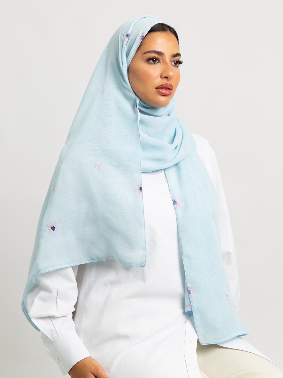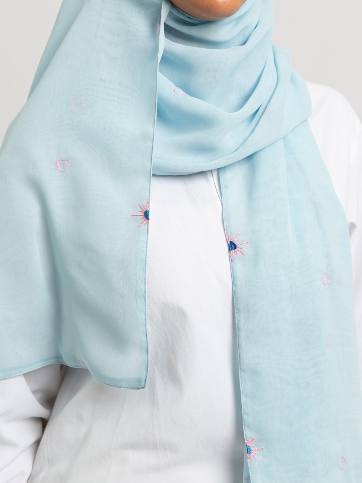 Hijab color: Baby Blue with Shining Hearts Embroidery.