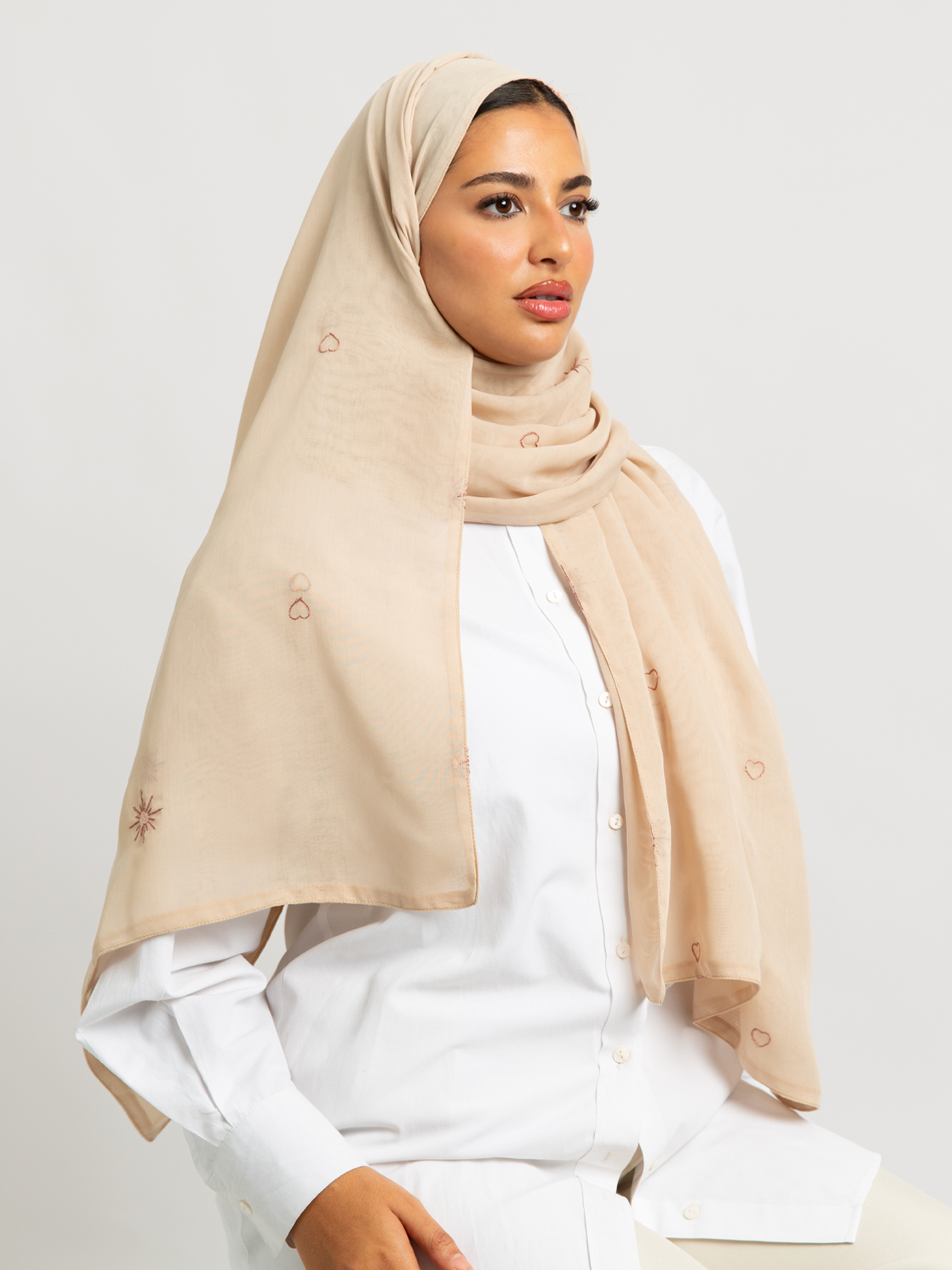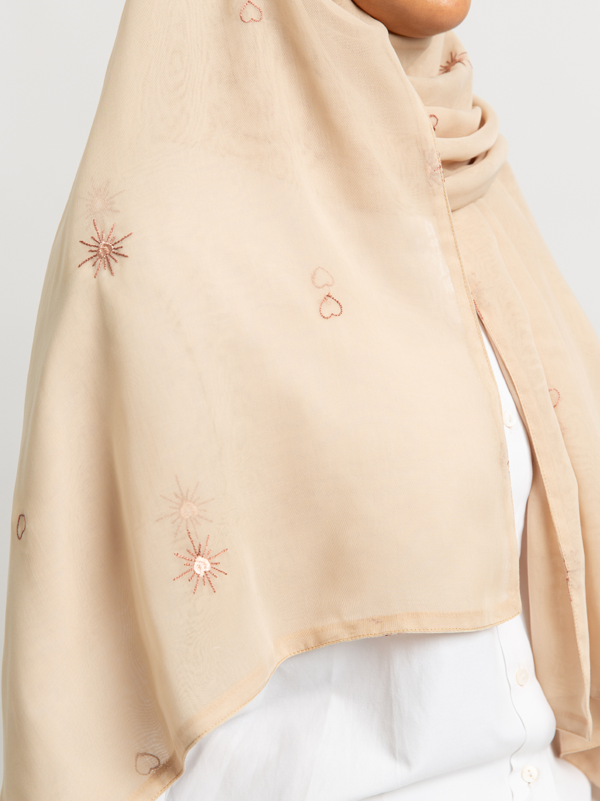 Hijab color: Beige with Shining Hearts Embroidery.
