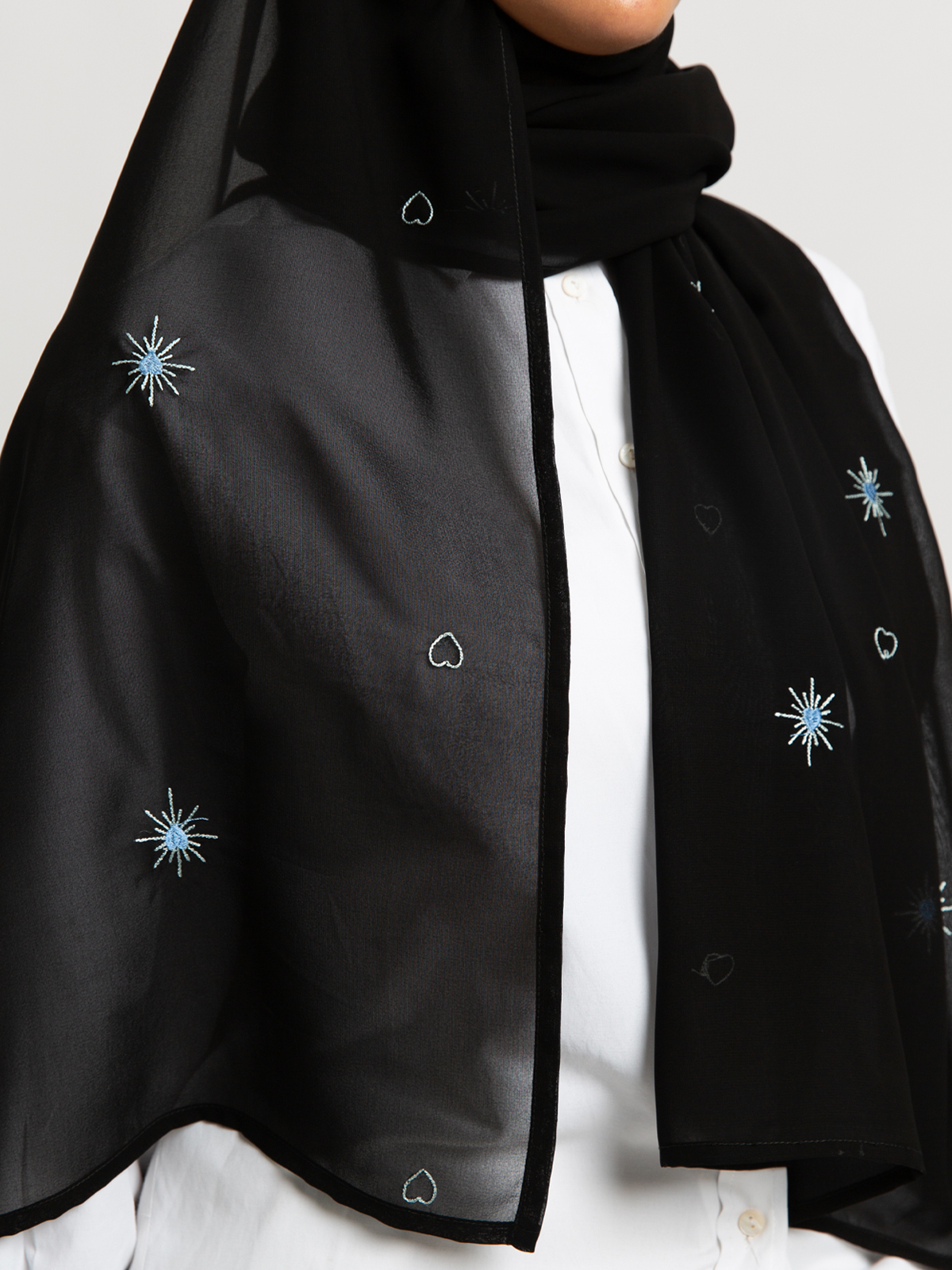 Hijab color: Black Tarha with Blue Shining Hearts Embroidery.