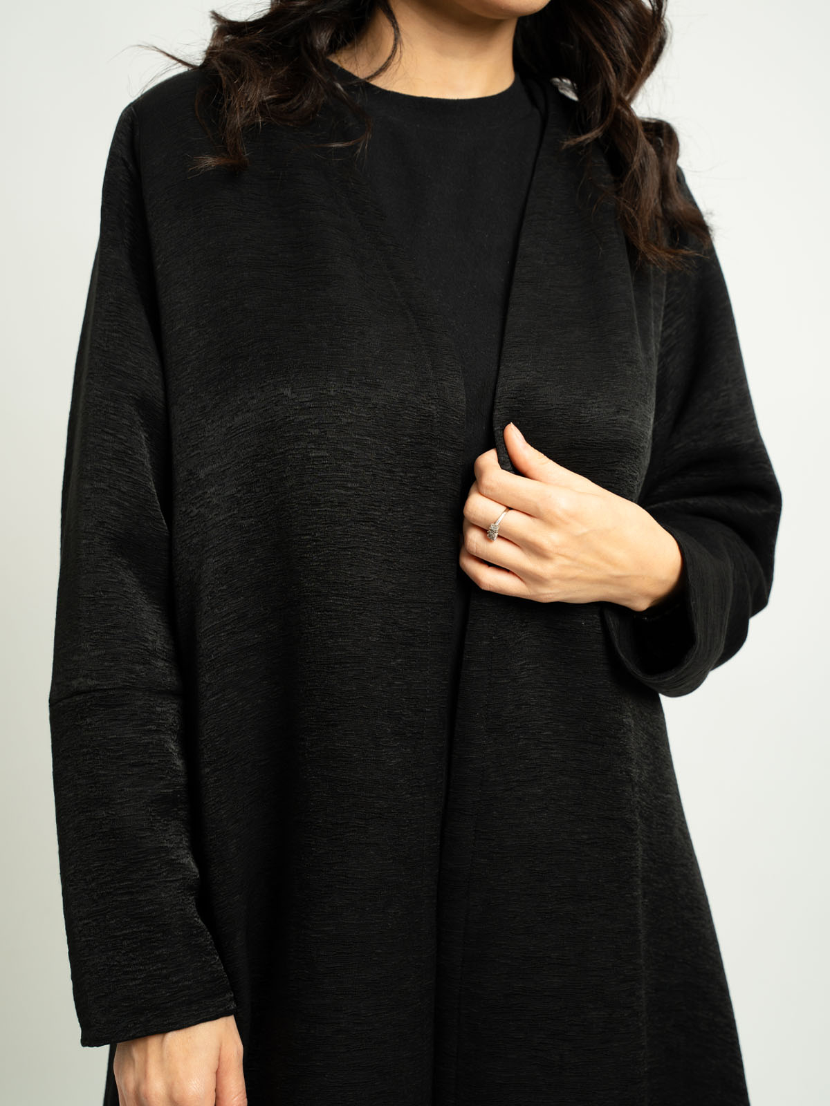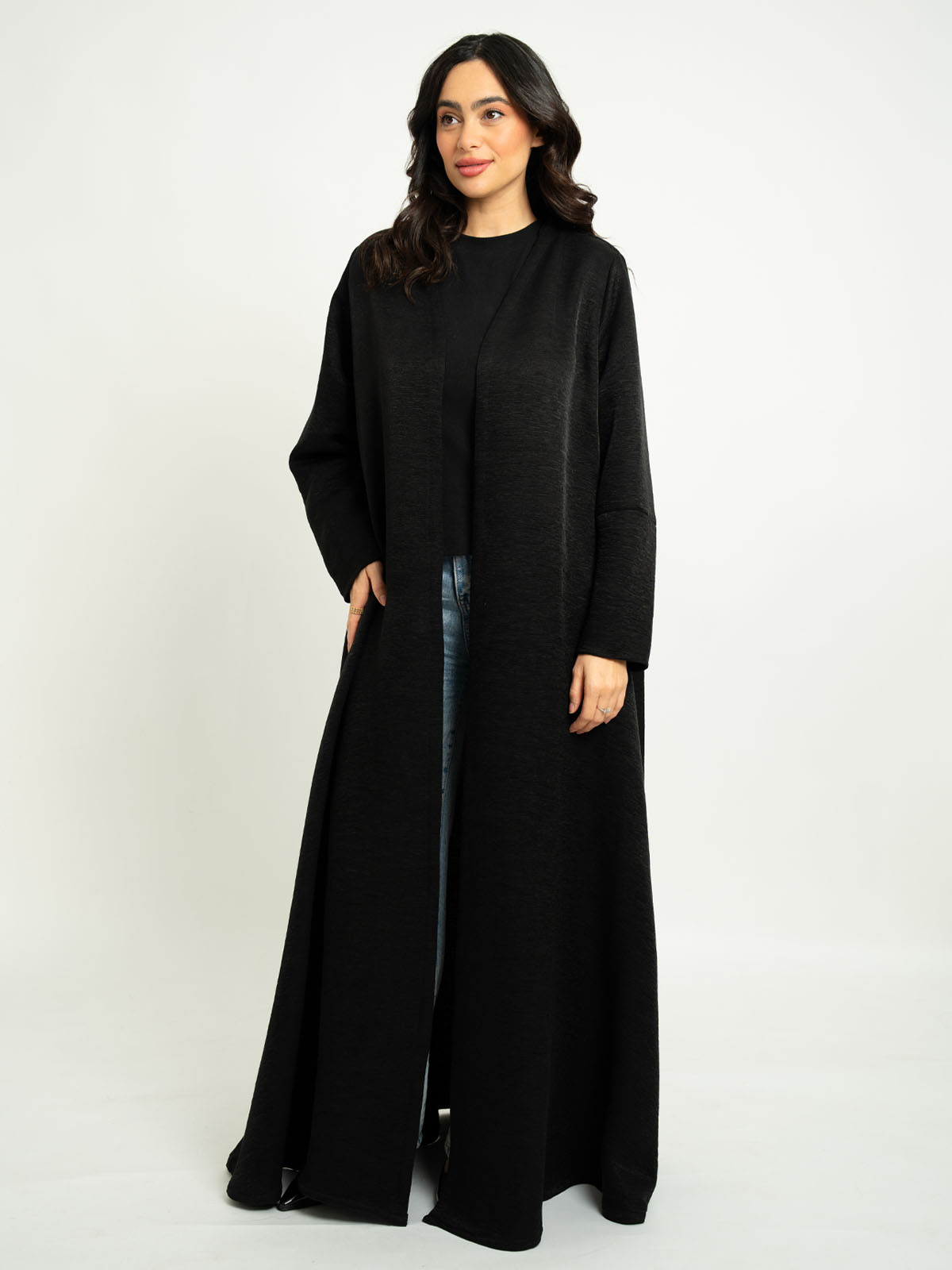 Half Cloche A-Cut Long Open Abaya with Tight Sleeves in Thick Crepe Fabric