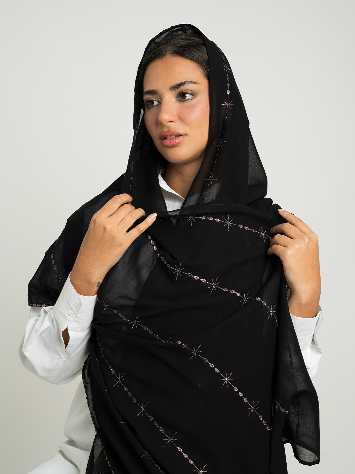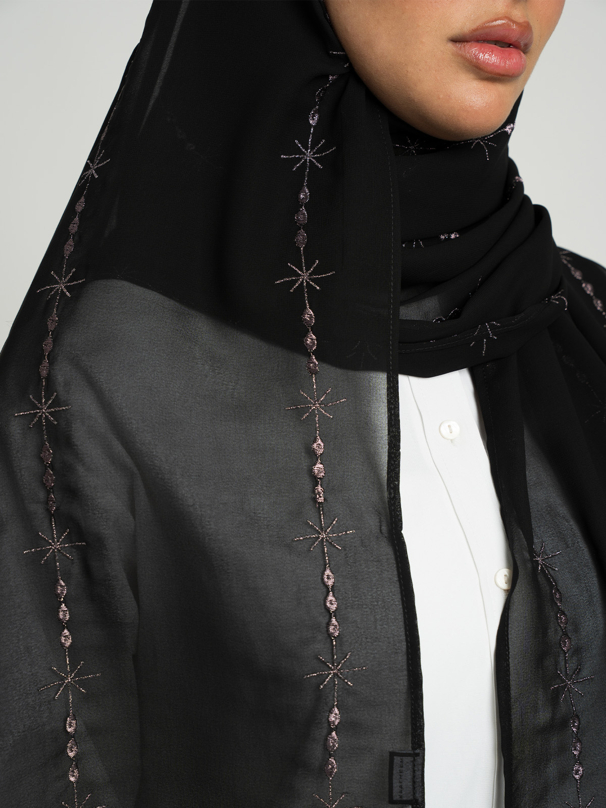 Hijab color: Black Tarha with Galaxy Threads Embroidery.