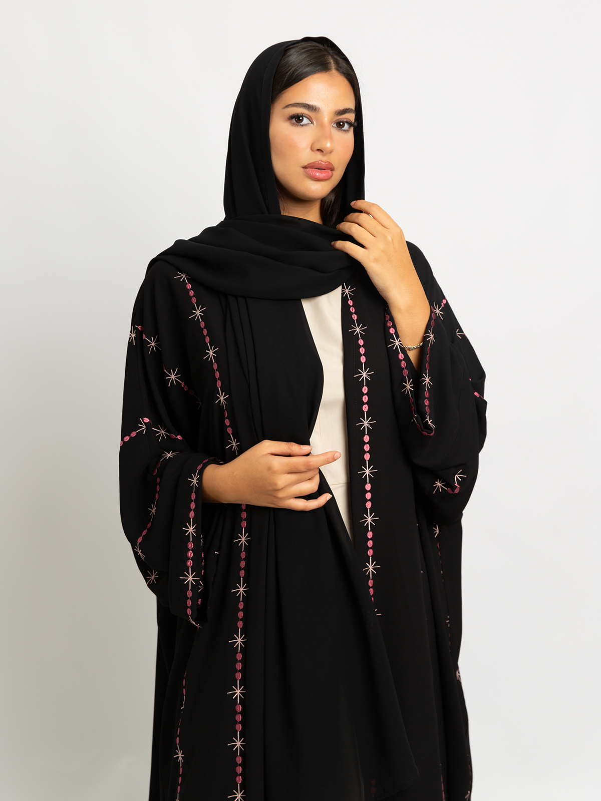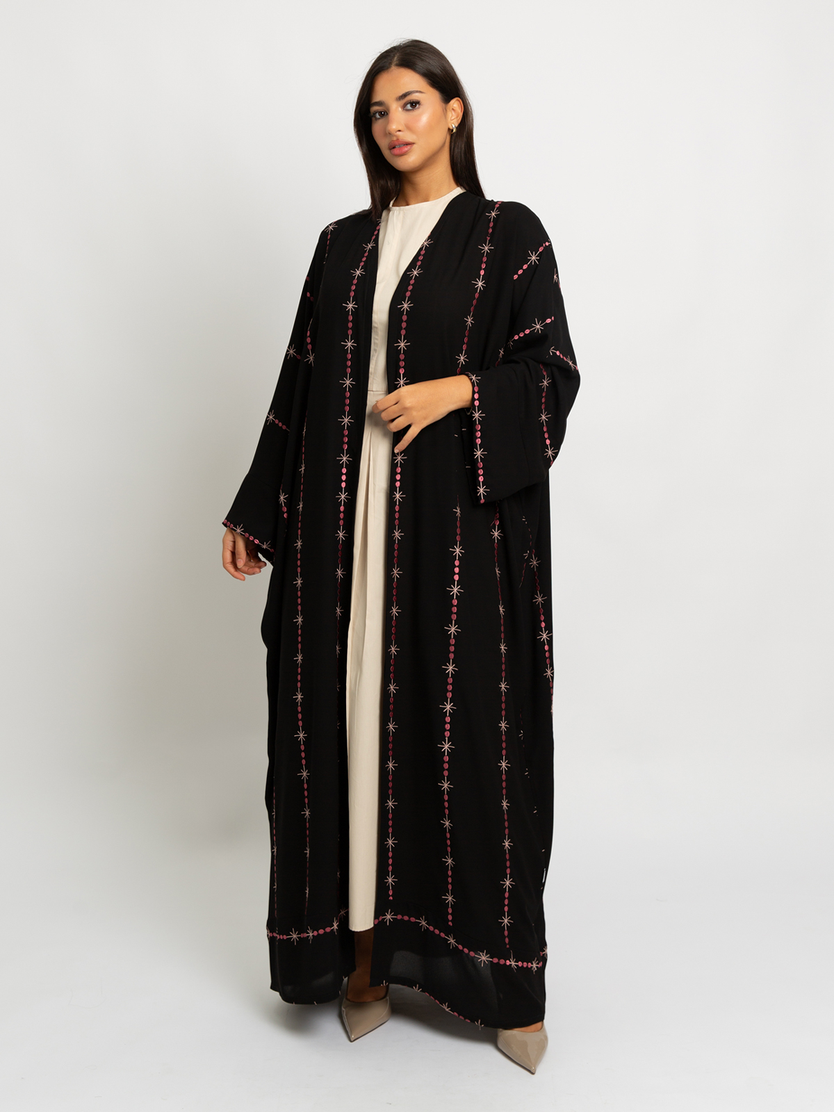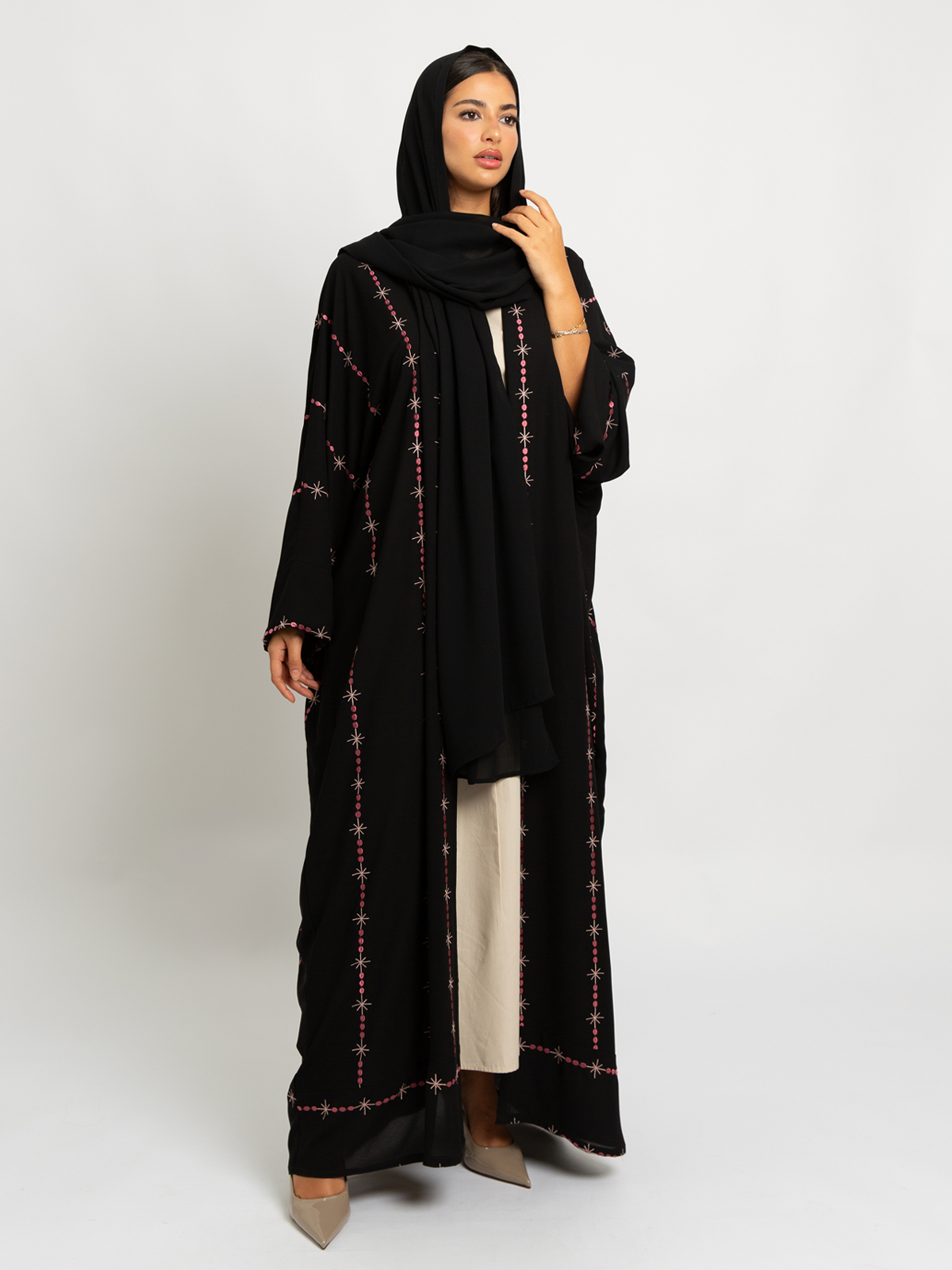 Wide-fit Long Open Abaya in Embroidered Light Crepe Fabric