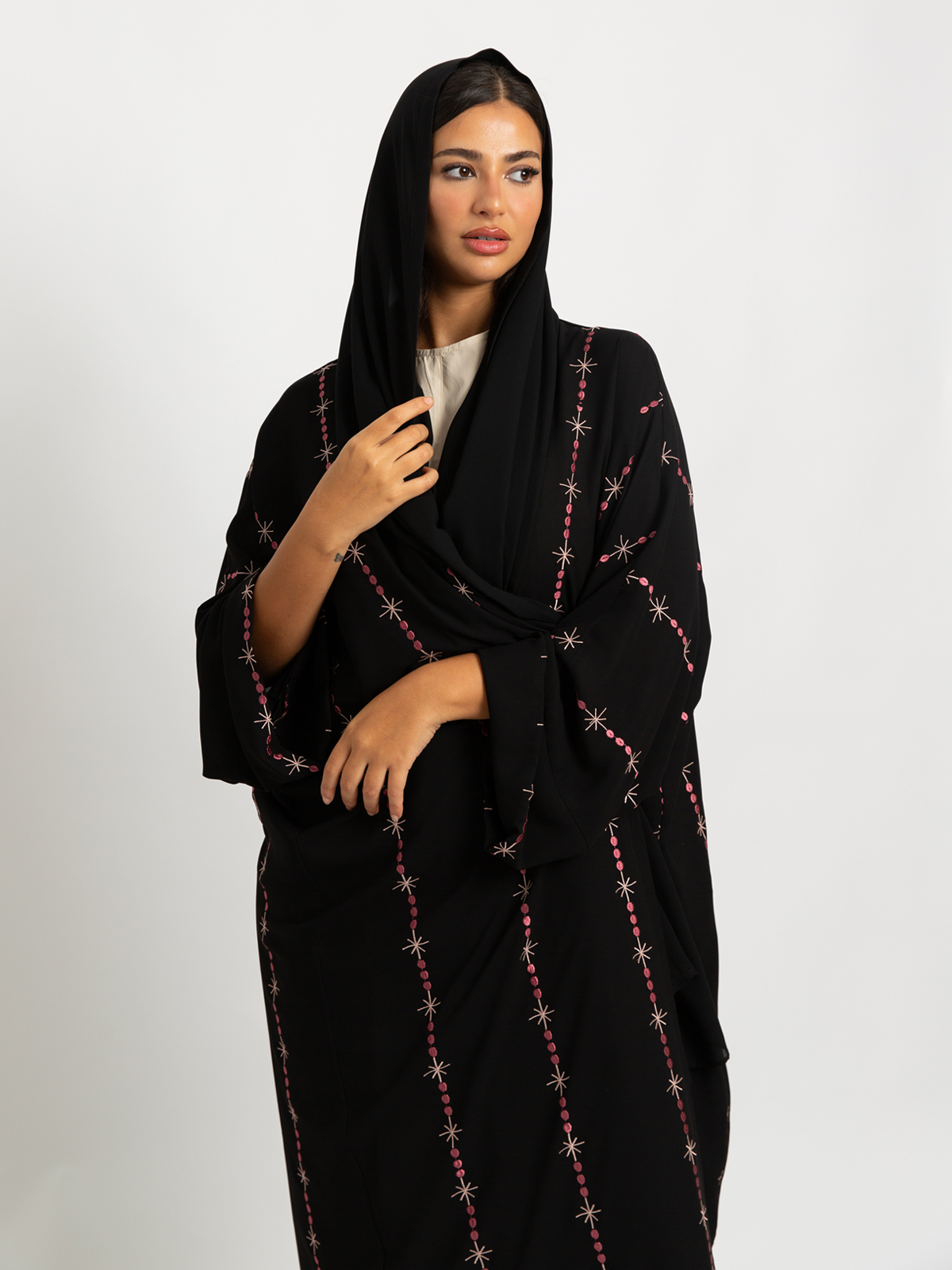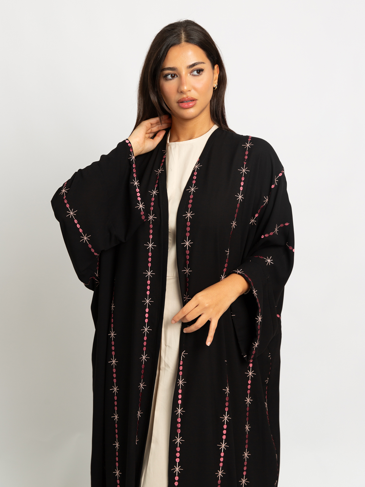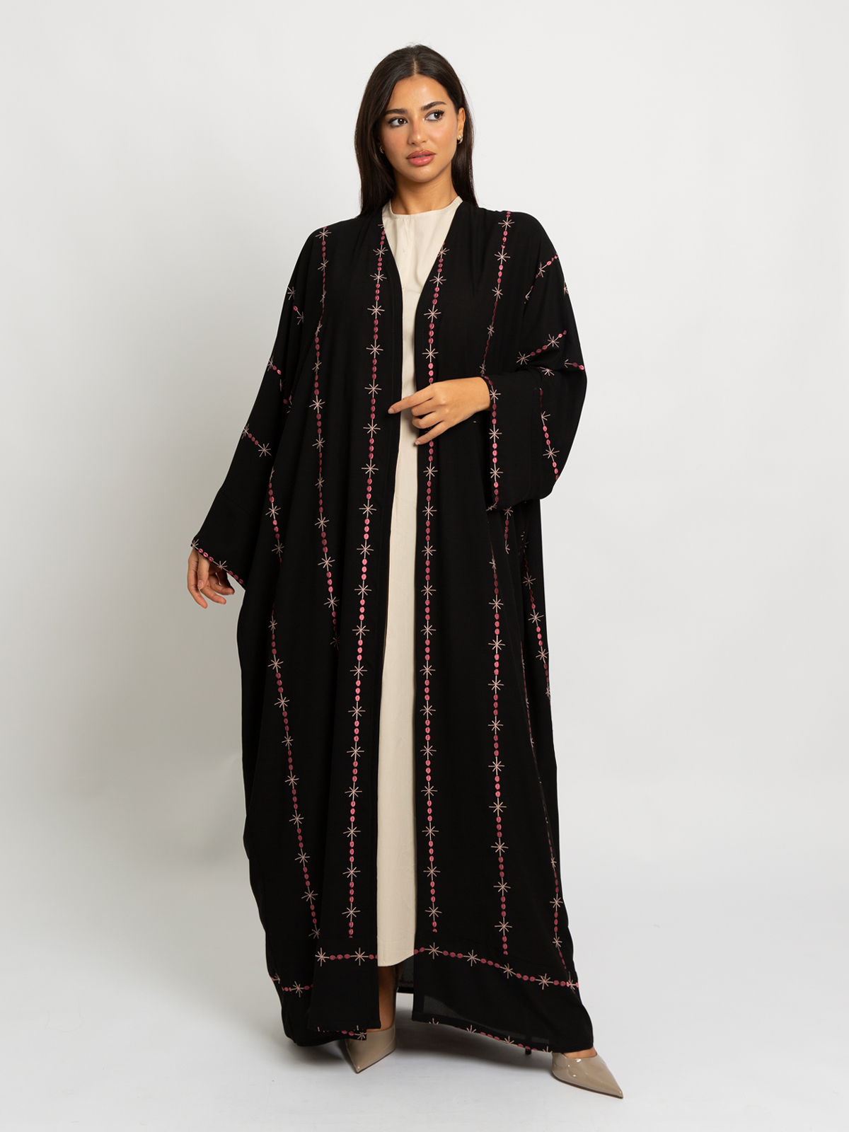 Wide-fit Long Open Abaya in Embroidered Light Crepe Fabric