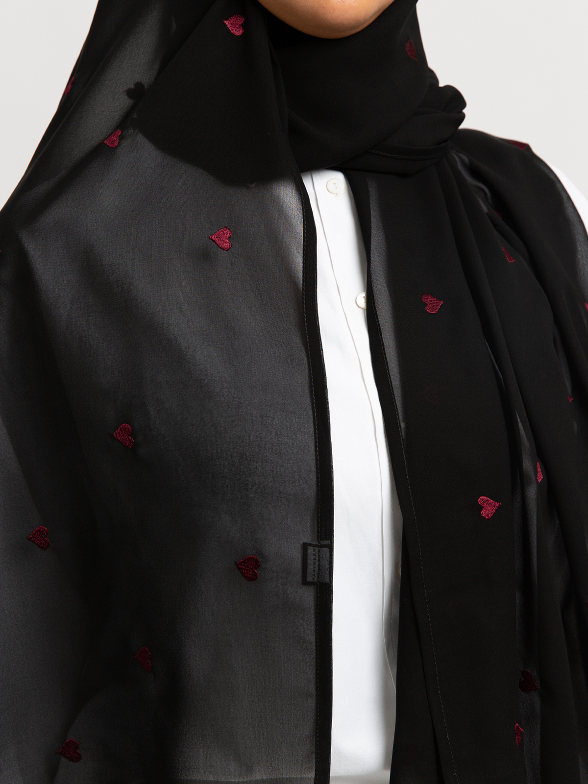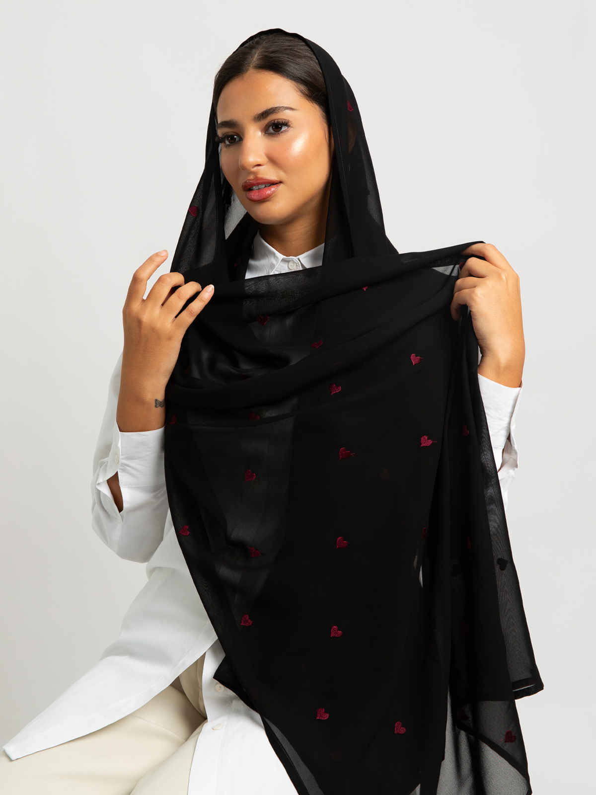 Hijab color: Black Tarha with Maroon Hearts Embroidery.