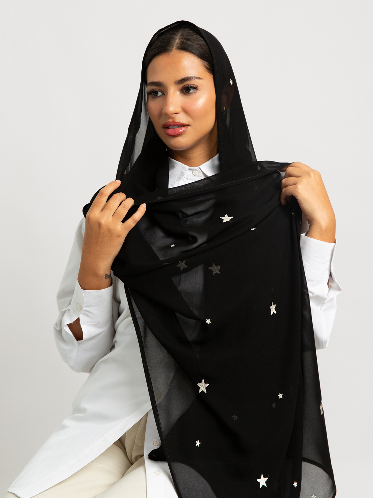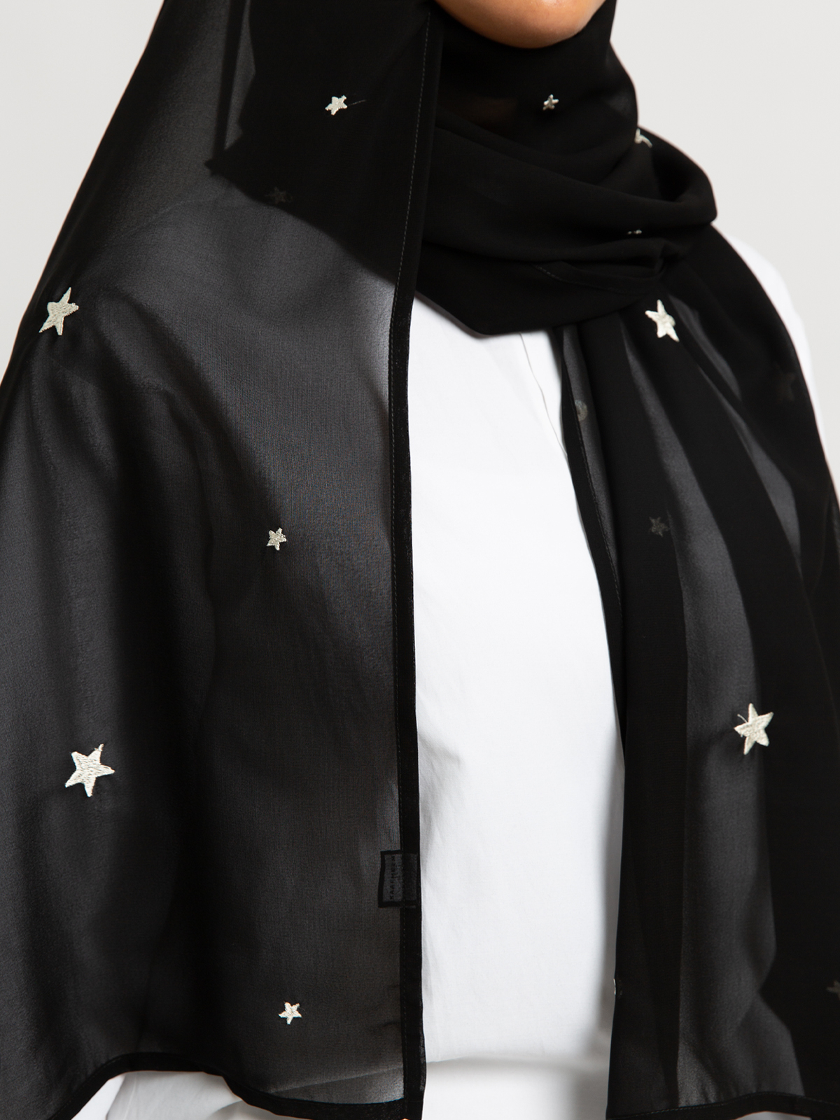 Hijab color: Black Tarha with Stars Embroidery.