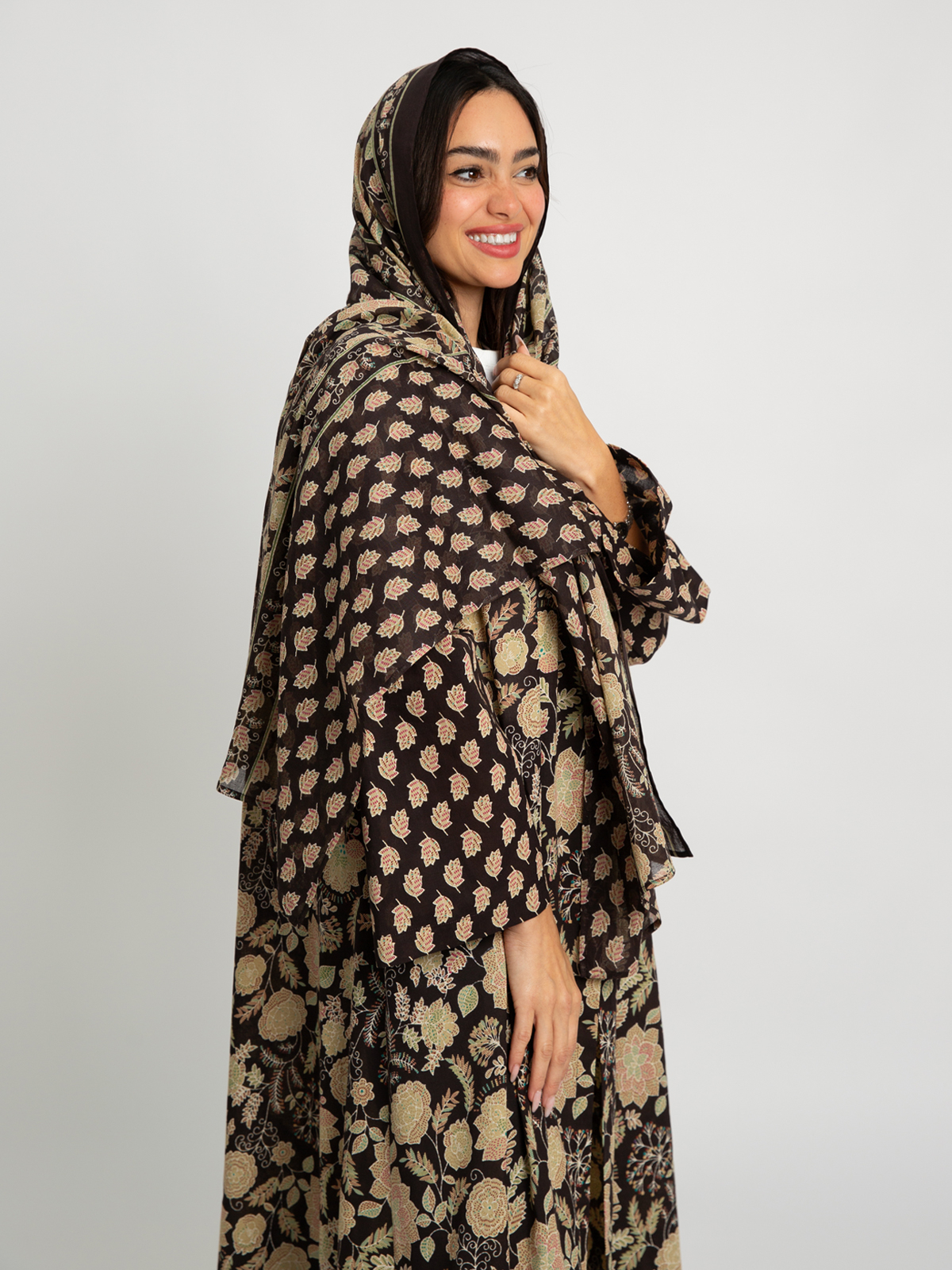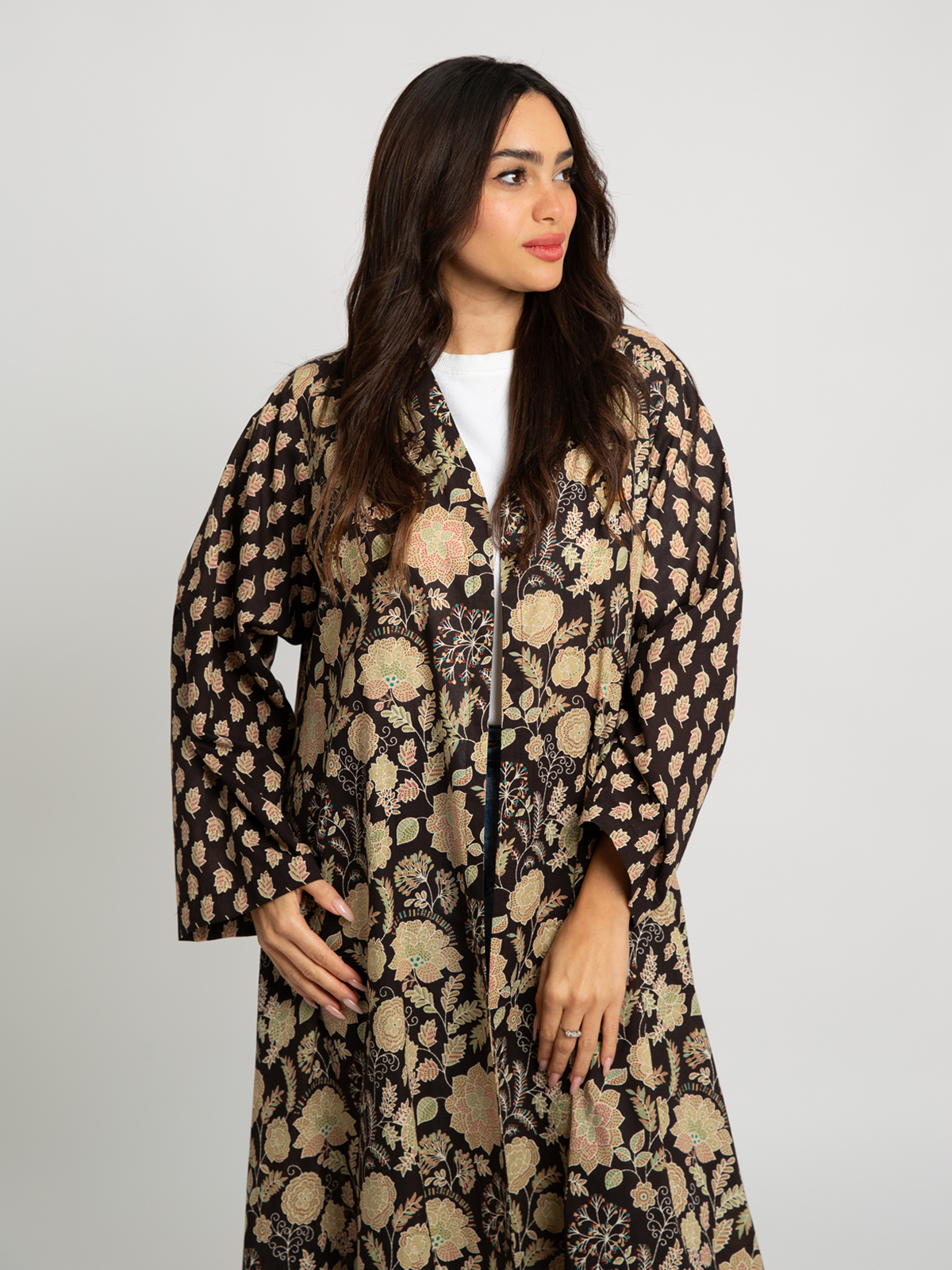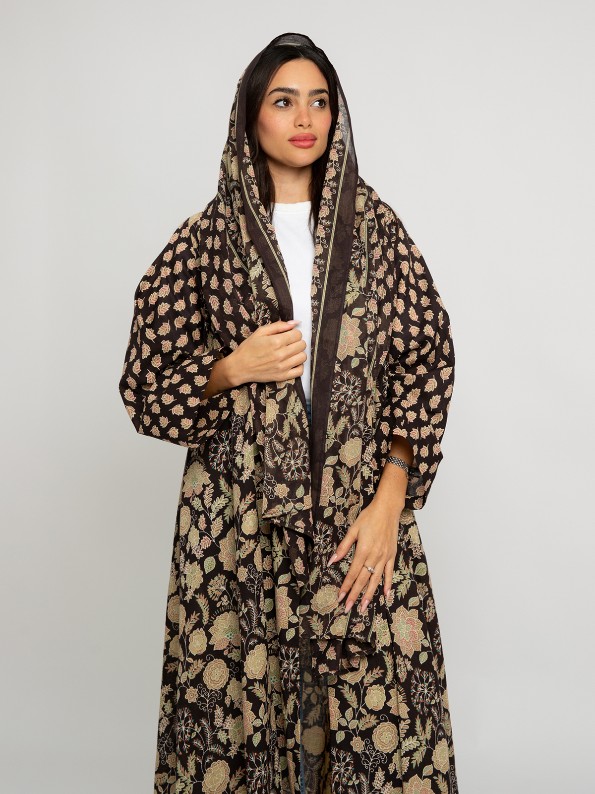 Half Cloche A-Cut Long Open Abaya in Printed Cotton Fabric