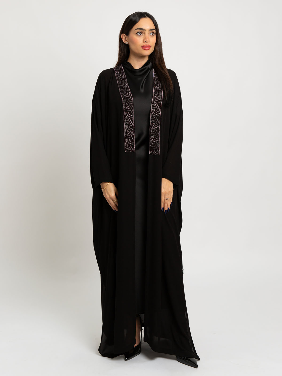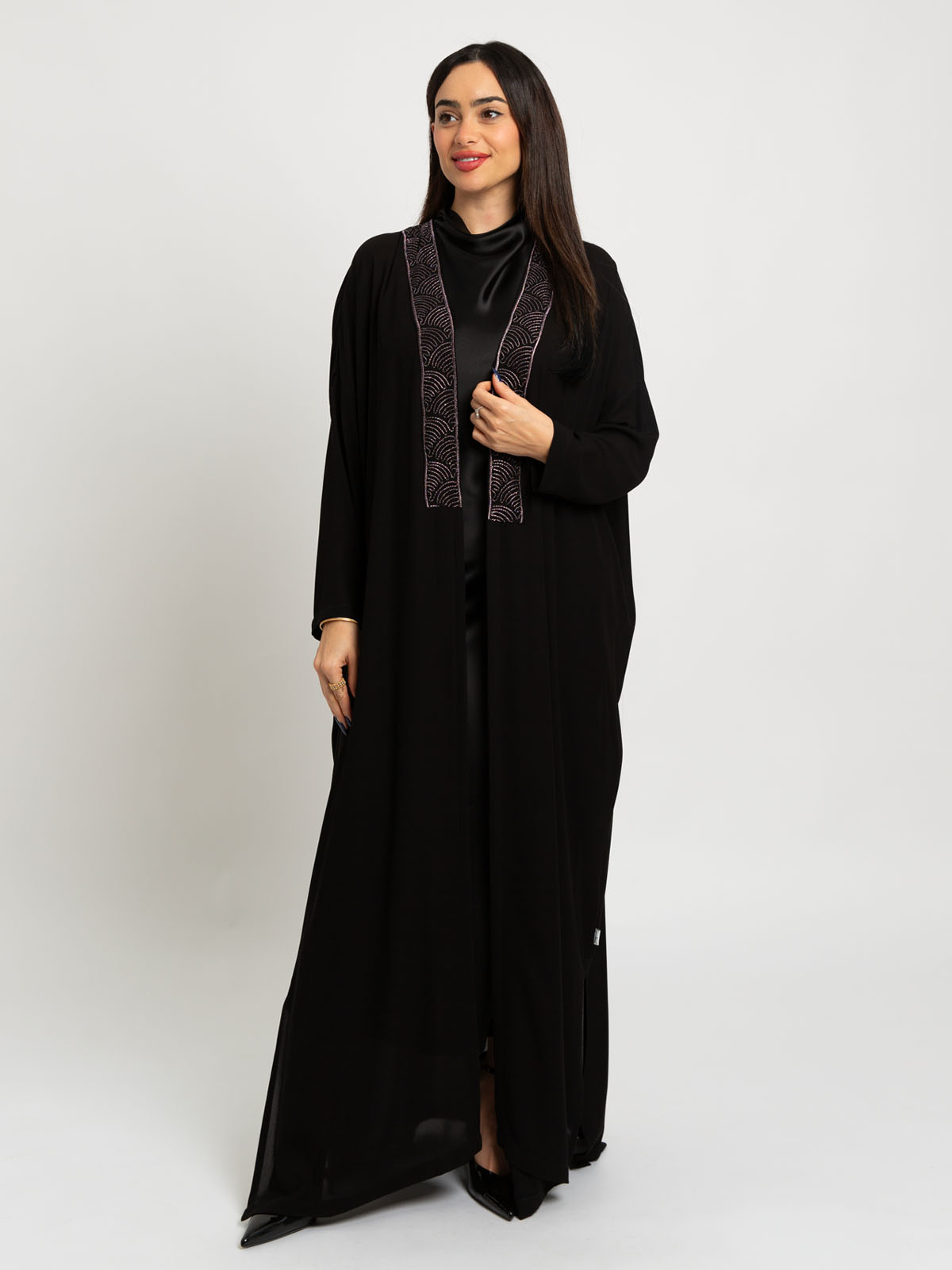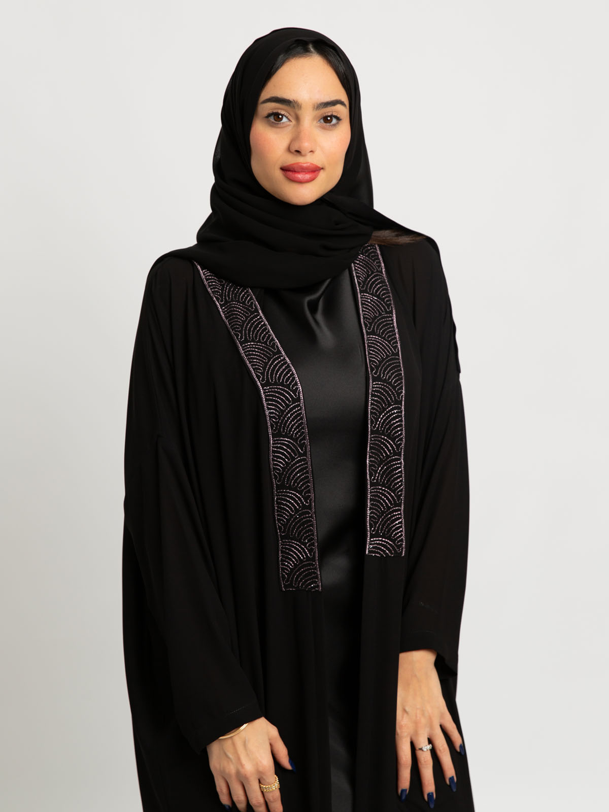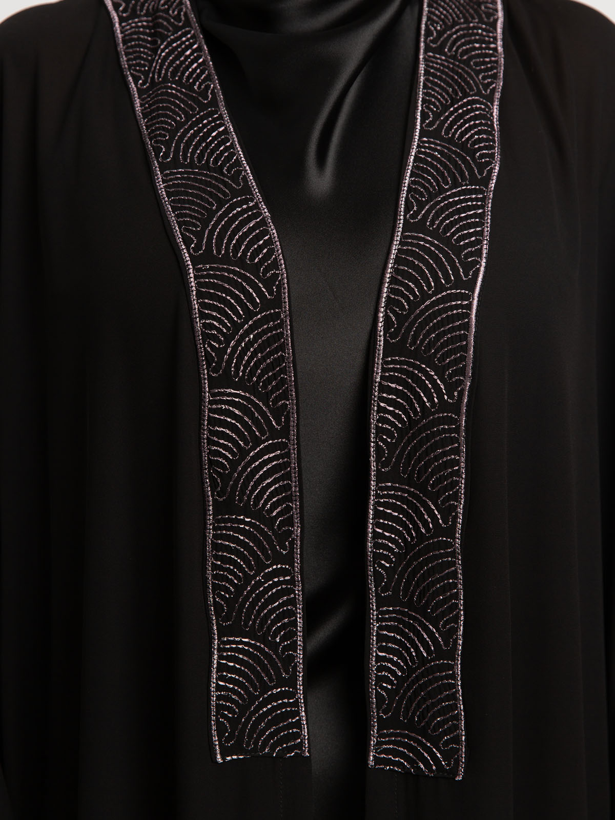 Wide-fit Tight Sleeves Long Open Abaya in Embroidered Light Crepe Fabric