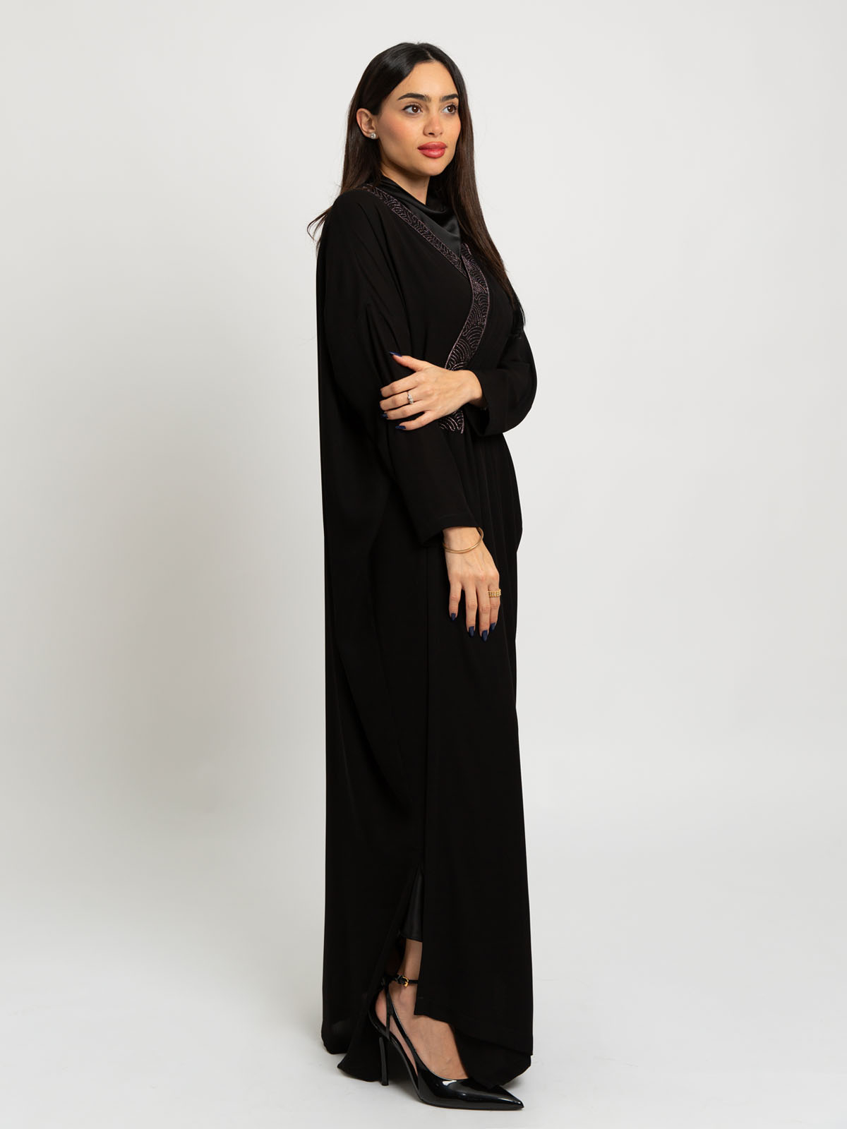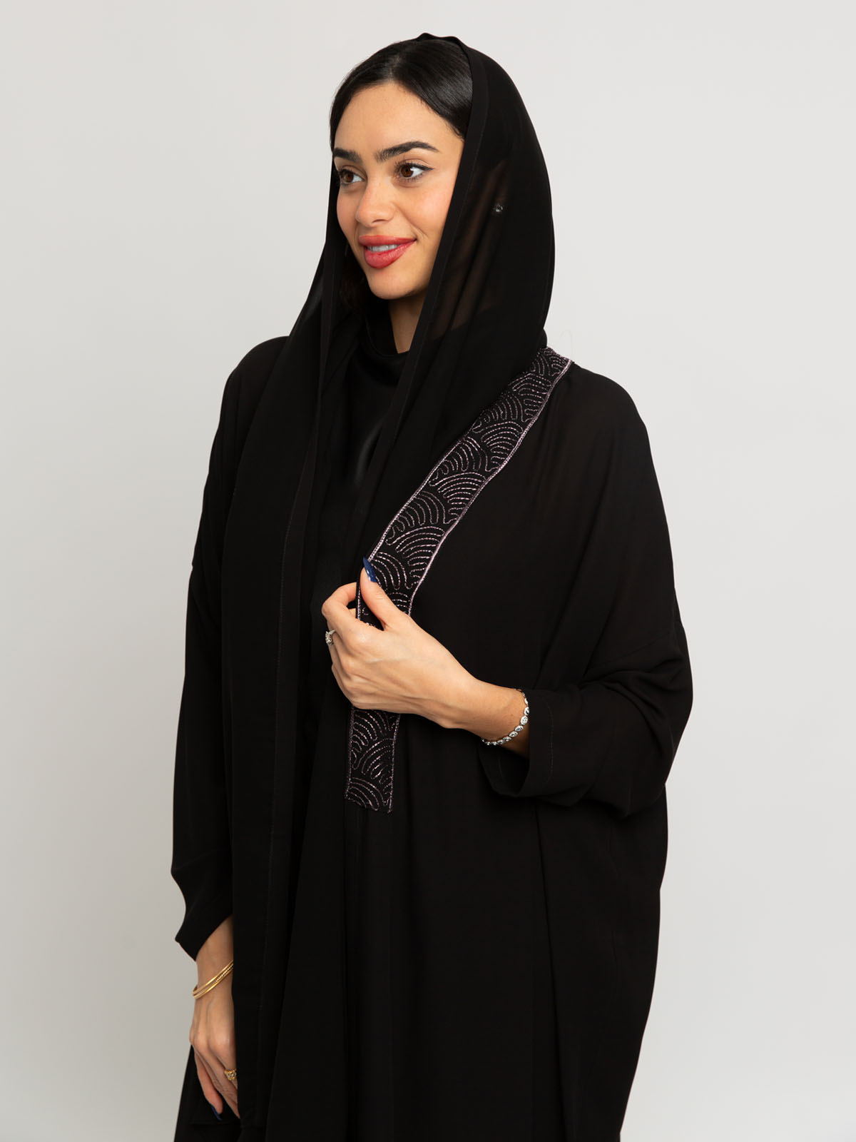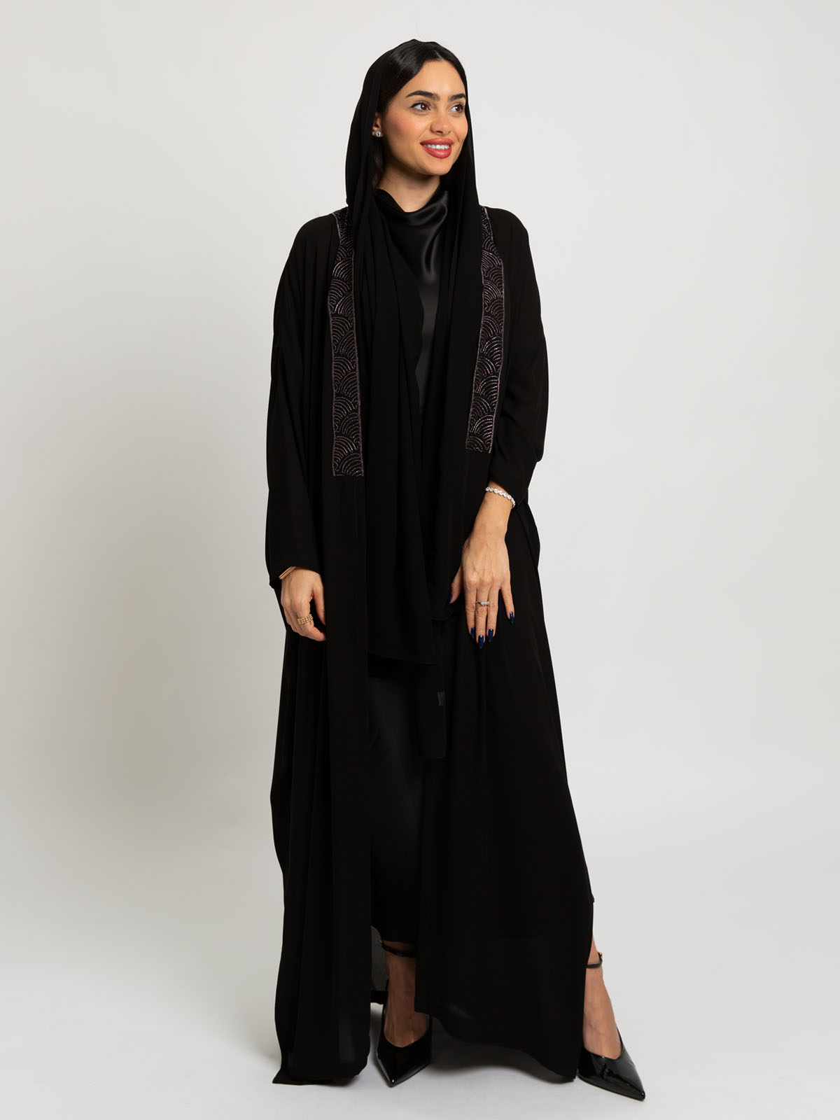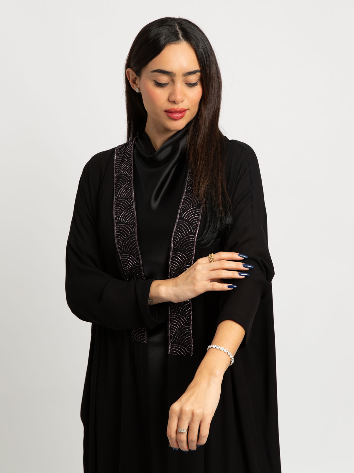 Wide-fit Tight Sleeves Long Open Abaya in Embroidered Light Crepe Fabric