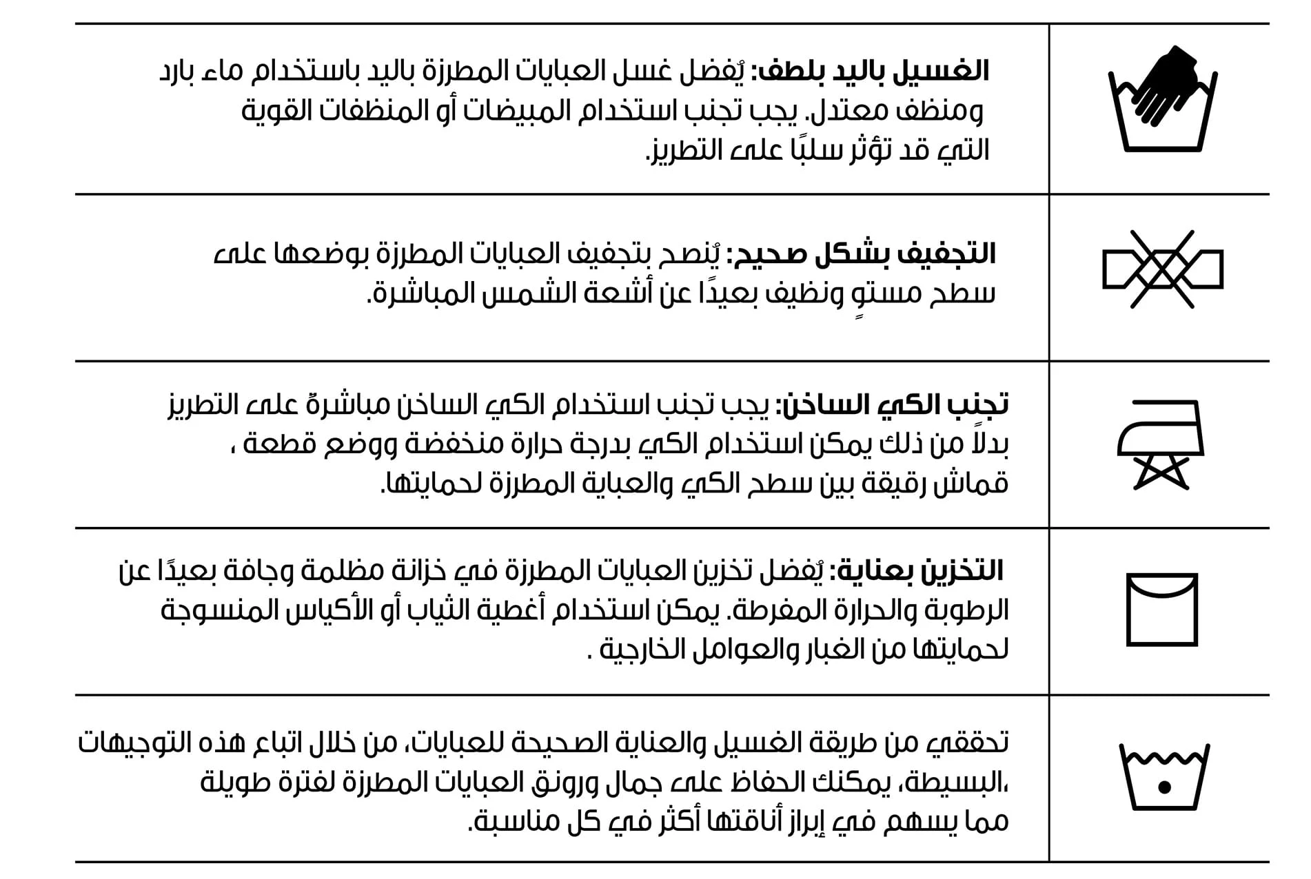 تتطلب العبايات المطرزة رعاية خاصة للحفاظ على رونقها وطول عمرها، حيث يجب الحرص على غسلها بالطريقة الصحيحة وتخزينها بعناية لمنع التلف. إليك بعض التوجيهات العملية للعناية بتلك القطع الفاخرة: