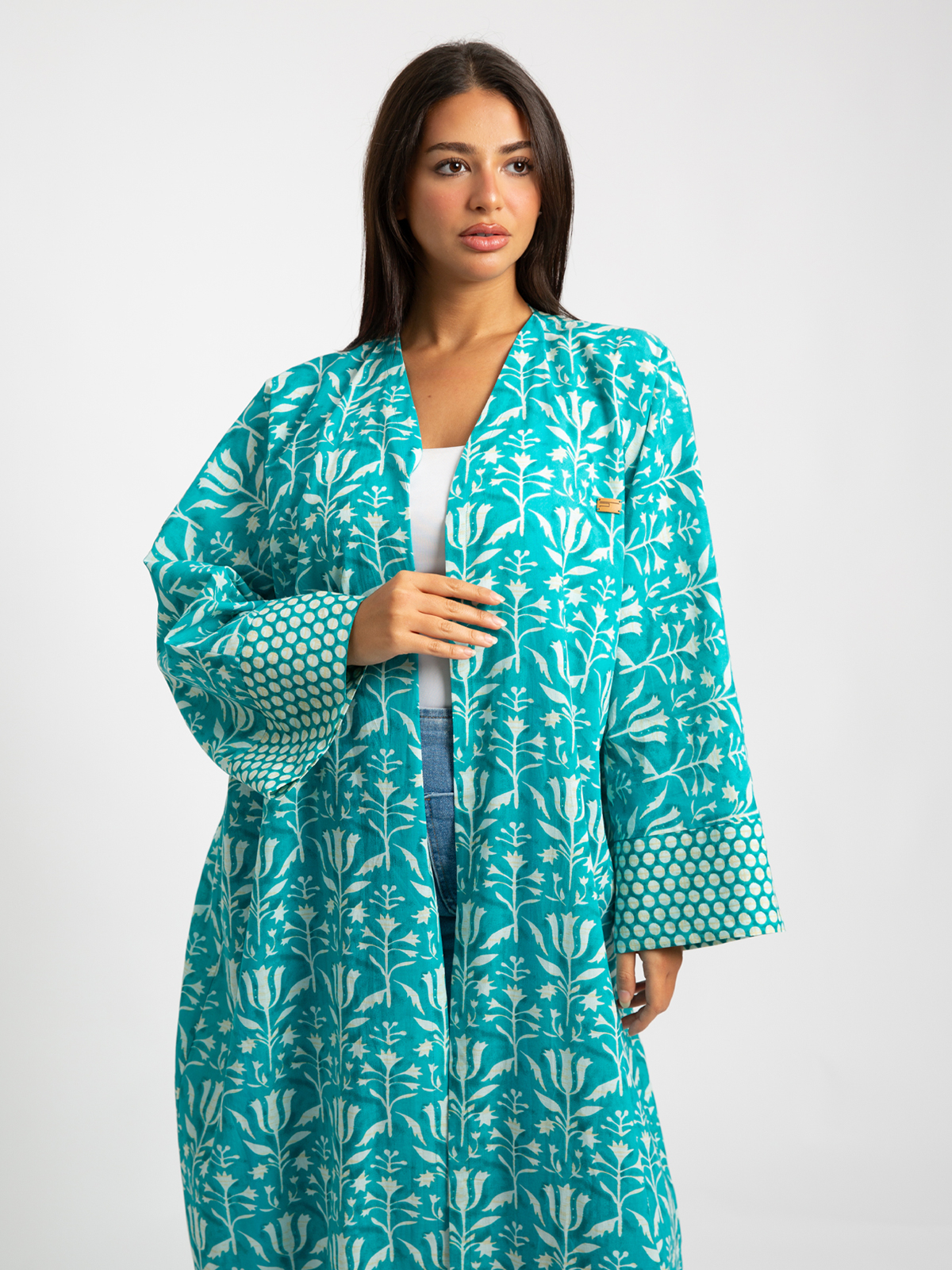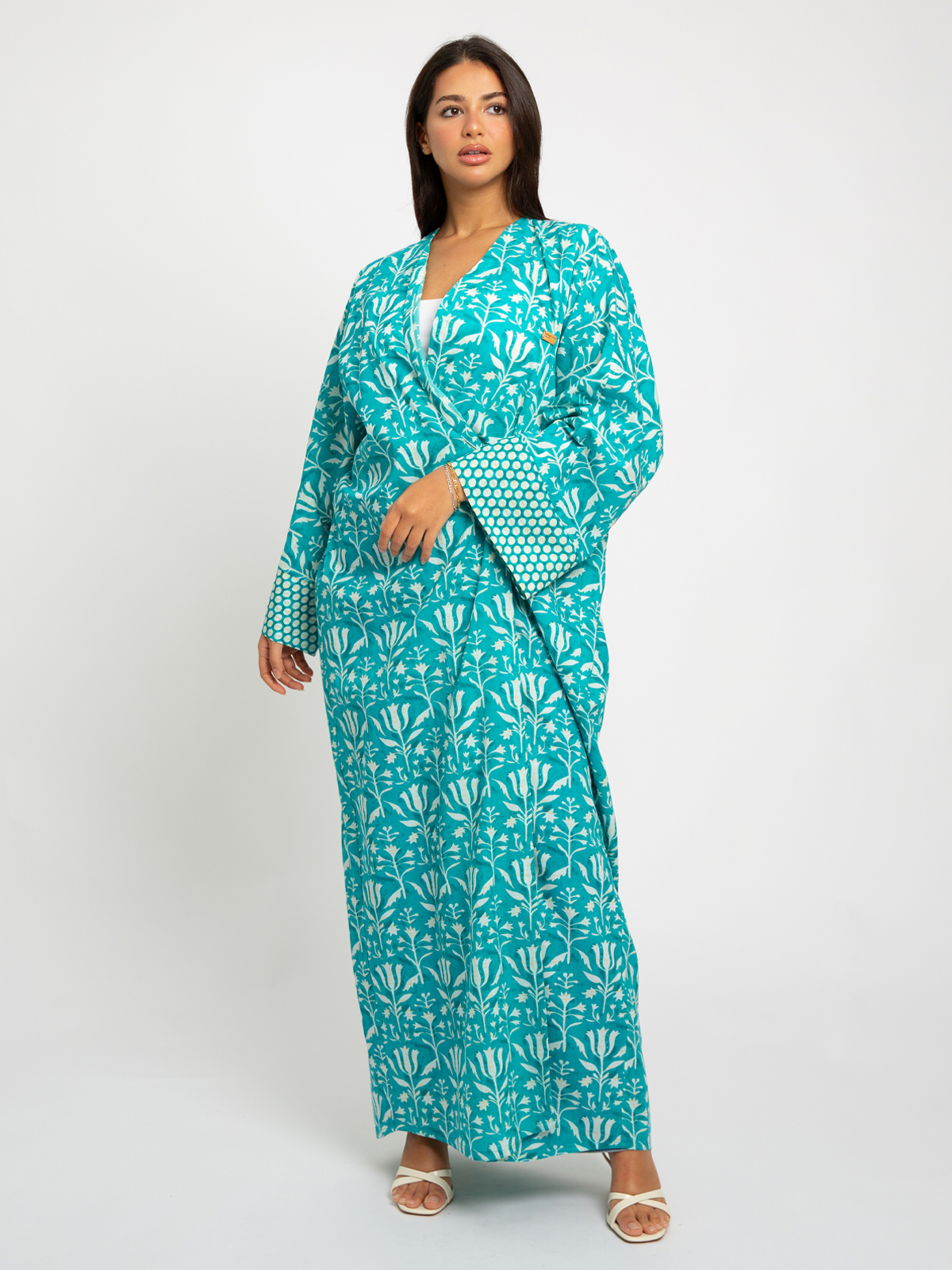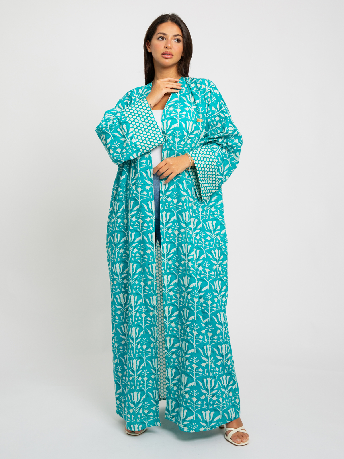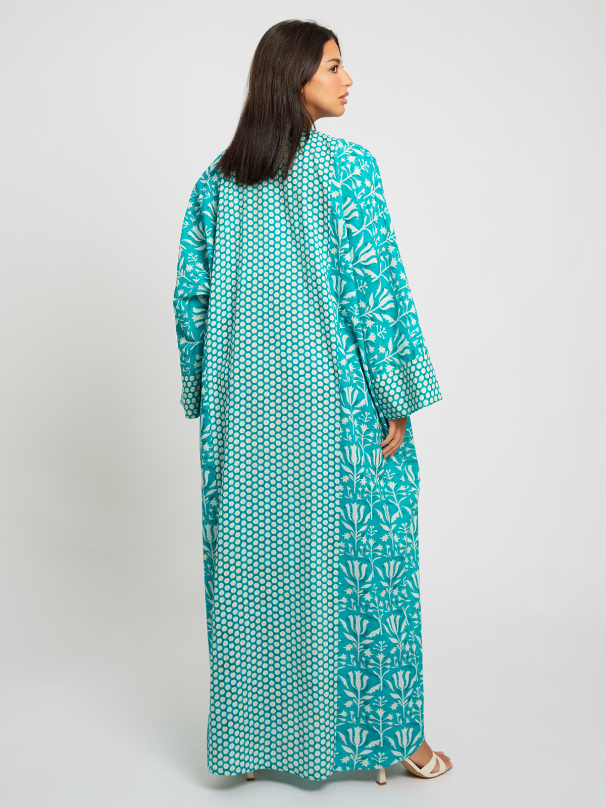 Wide-fit Long Open Abaya in Printed Cotton Fabric
