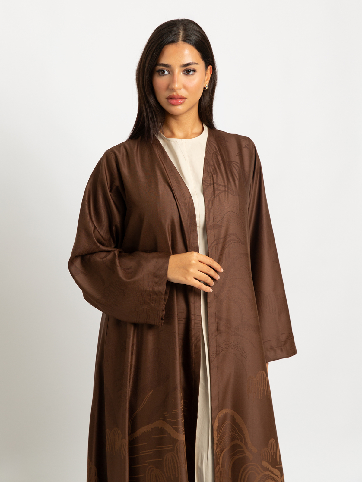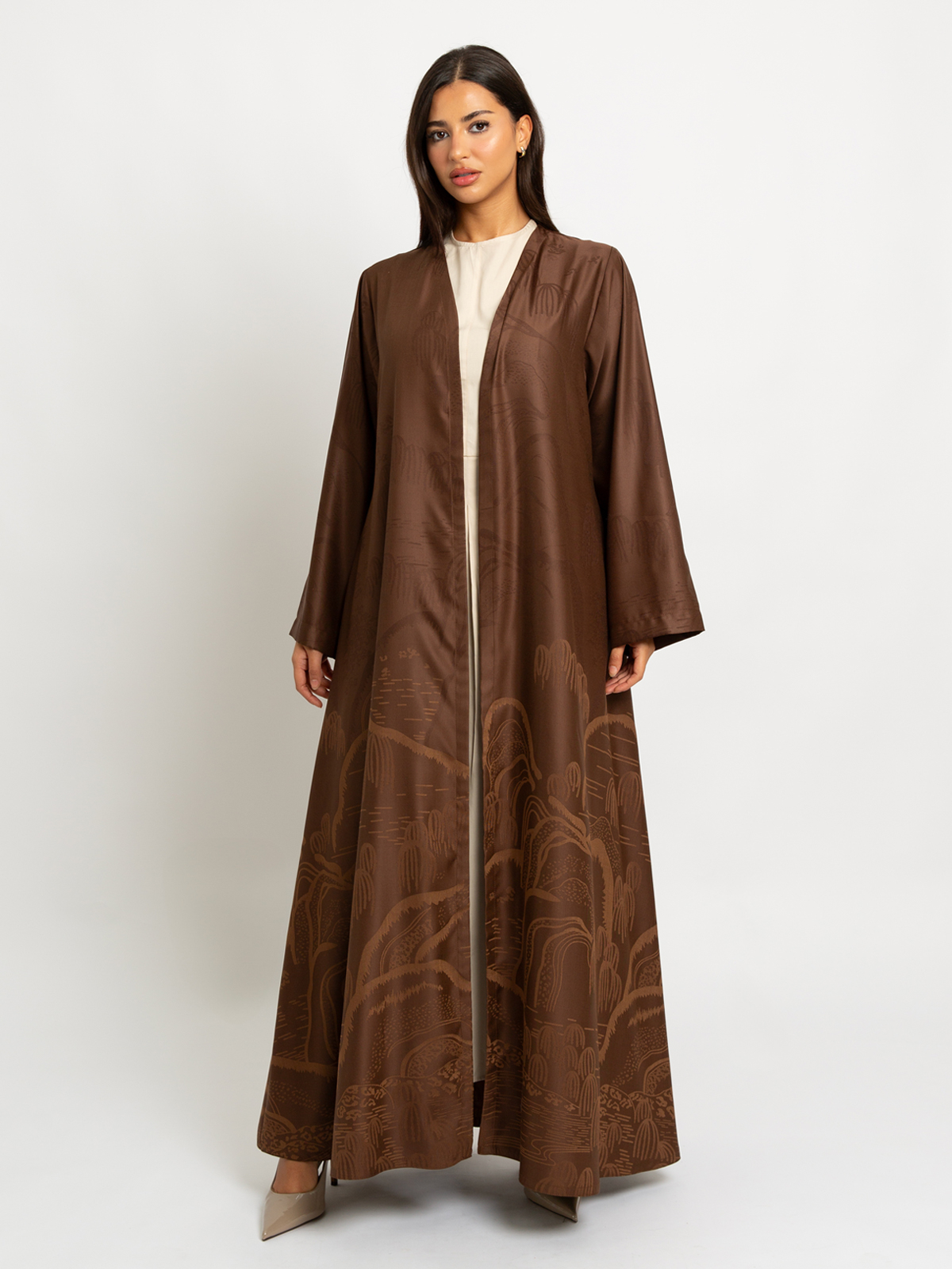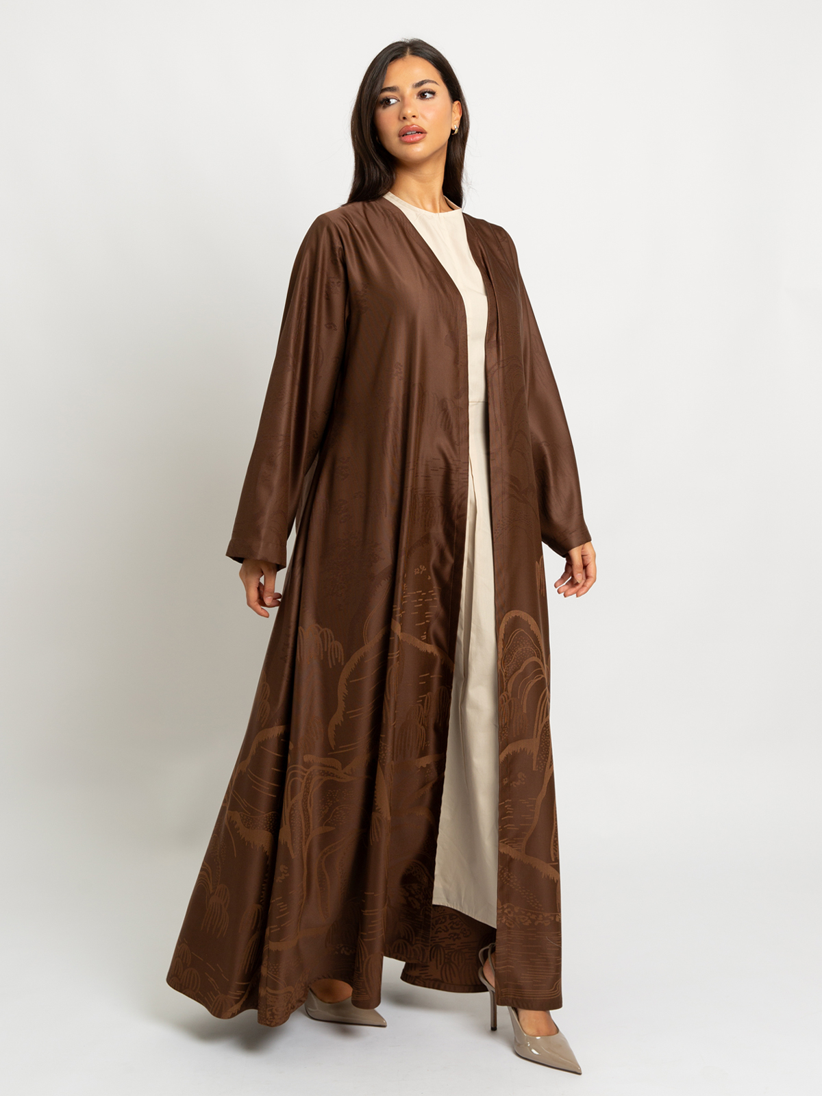 Half Cloche A-Cut Long Open Abaya in Mixed Woven Fabric