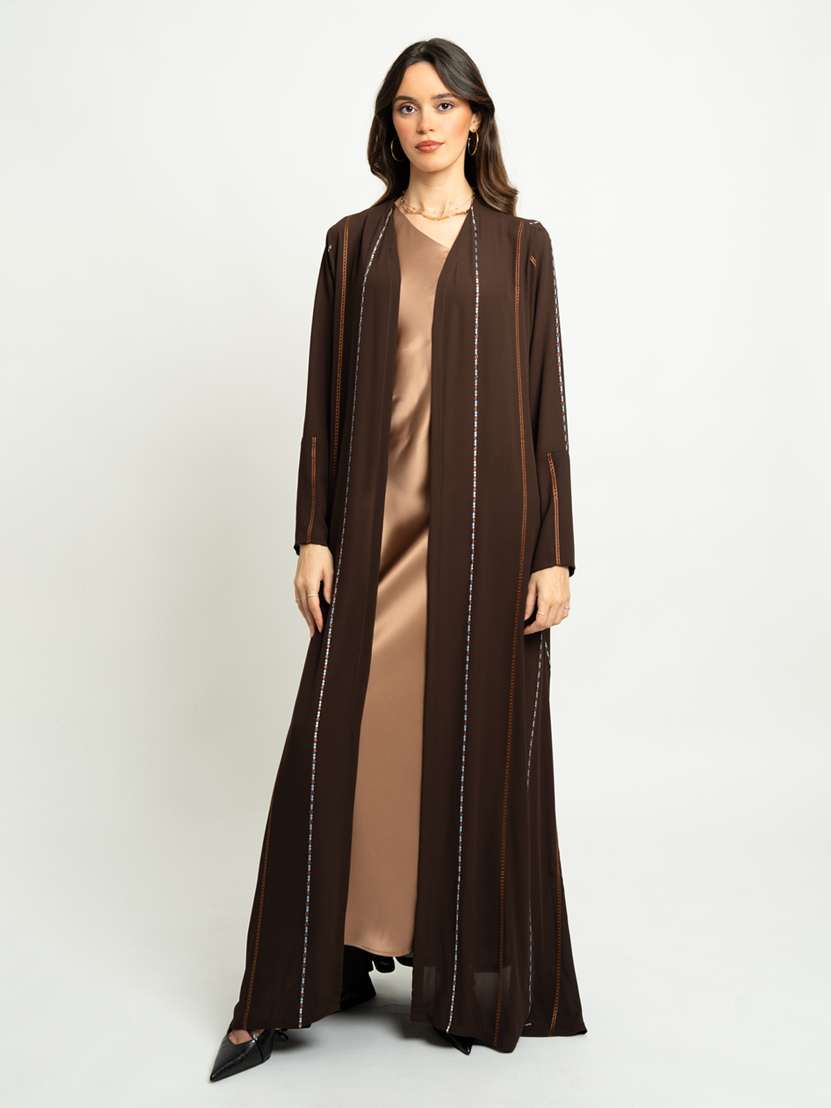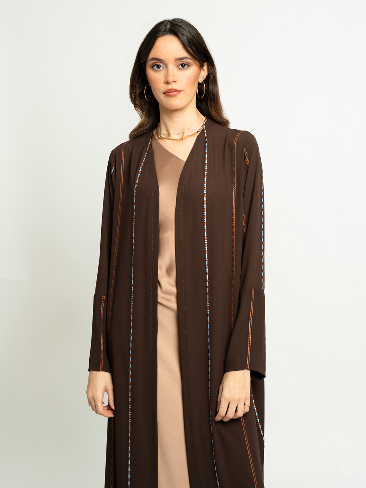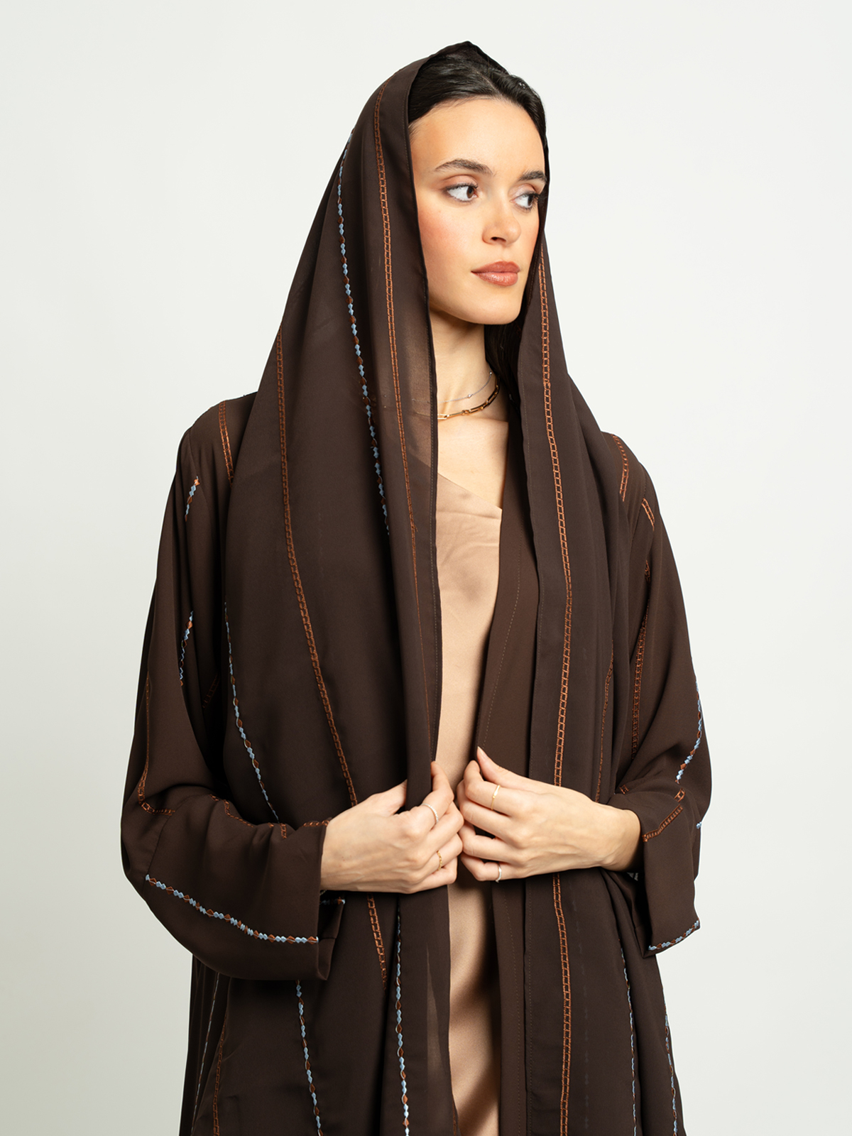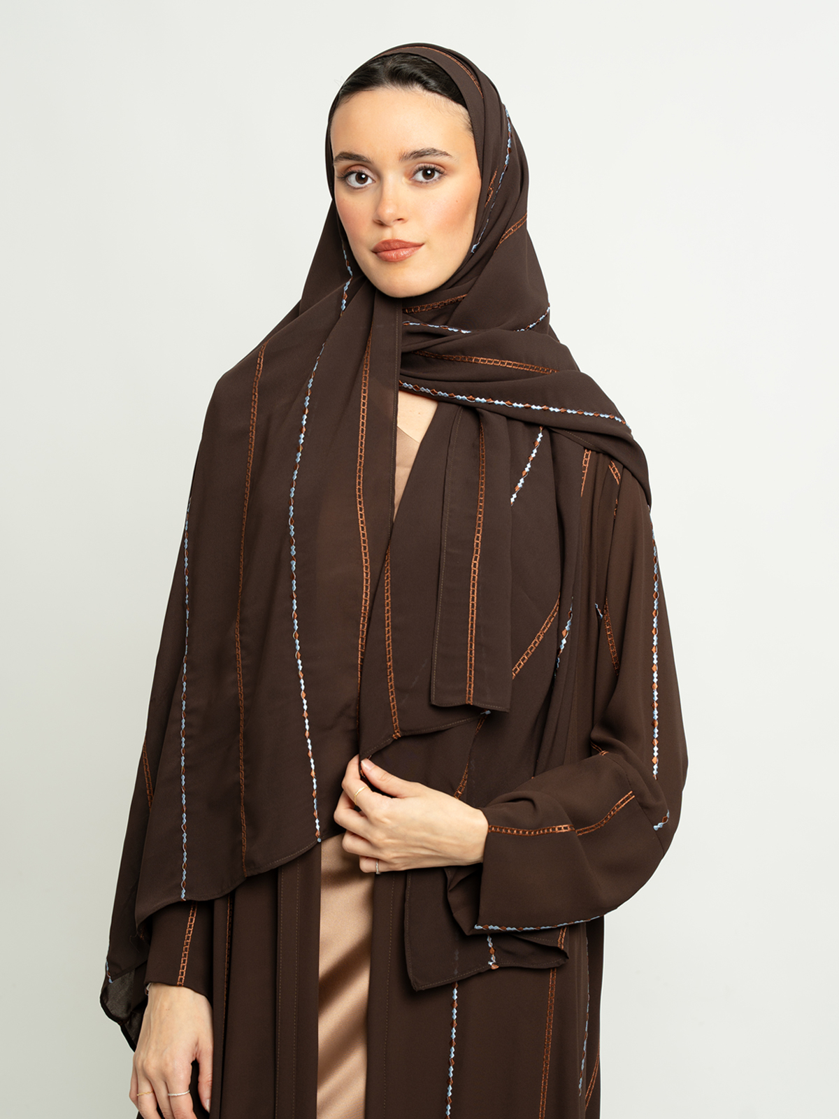 Abaya Color: Dark Brown Abaya with Chained Lines Embroidery.