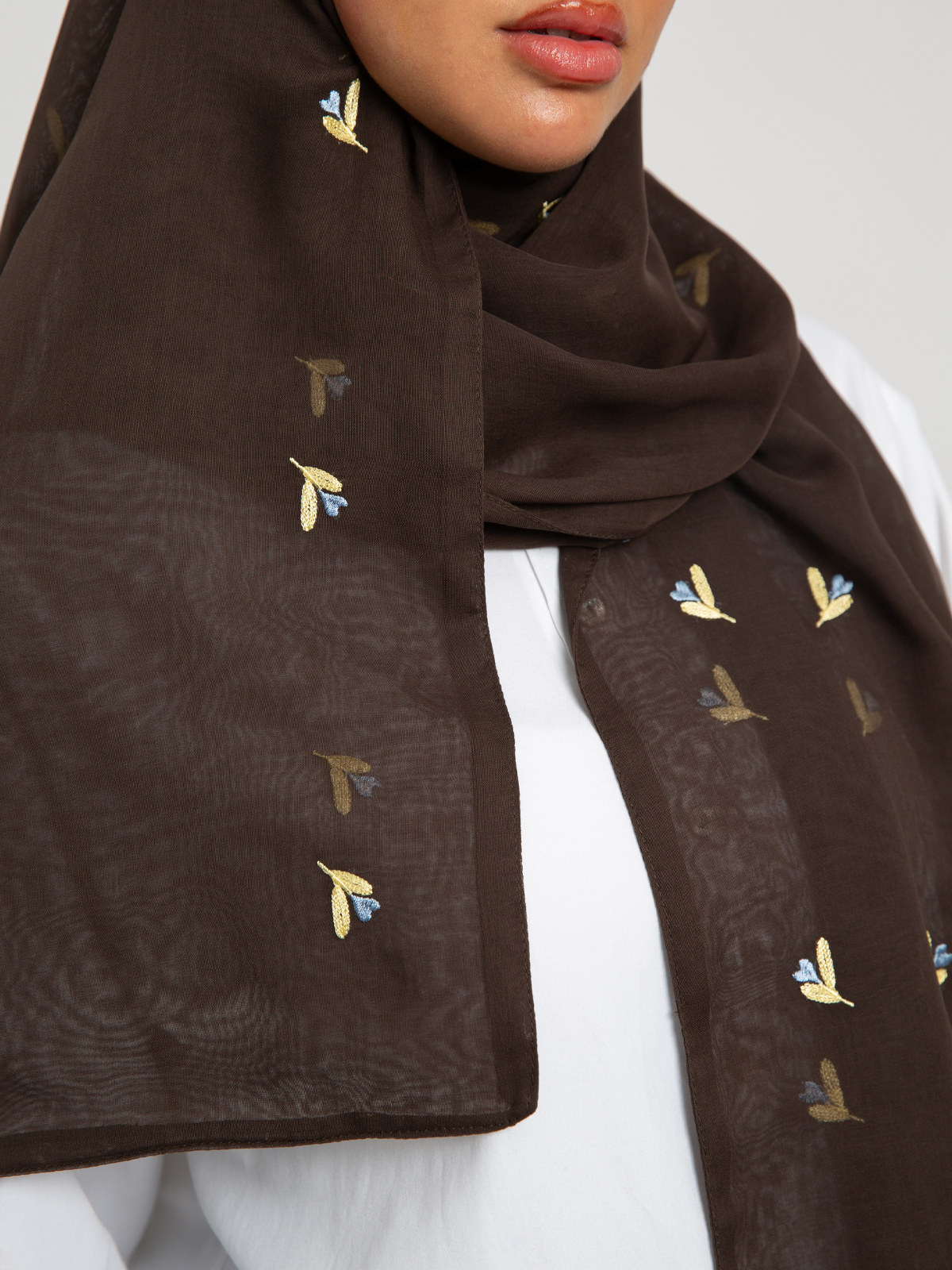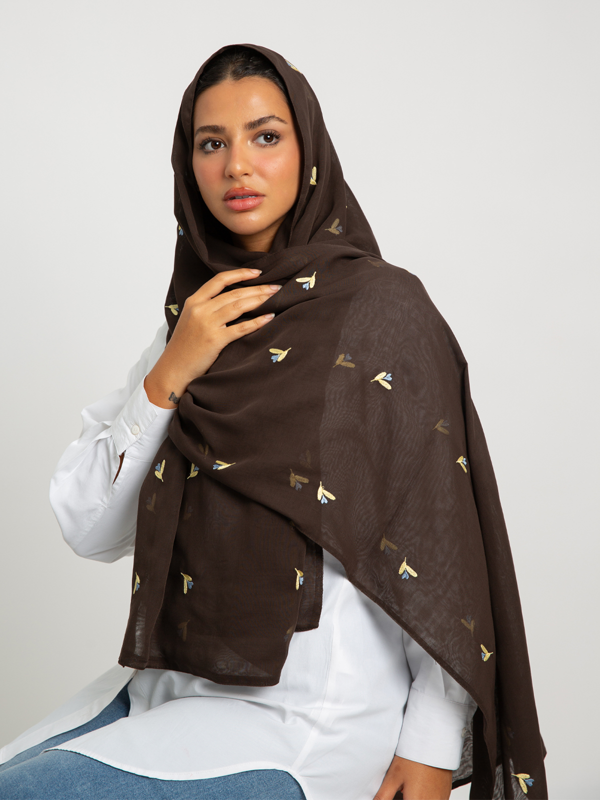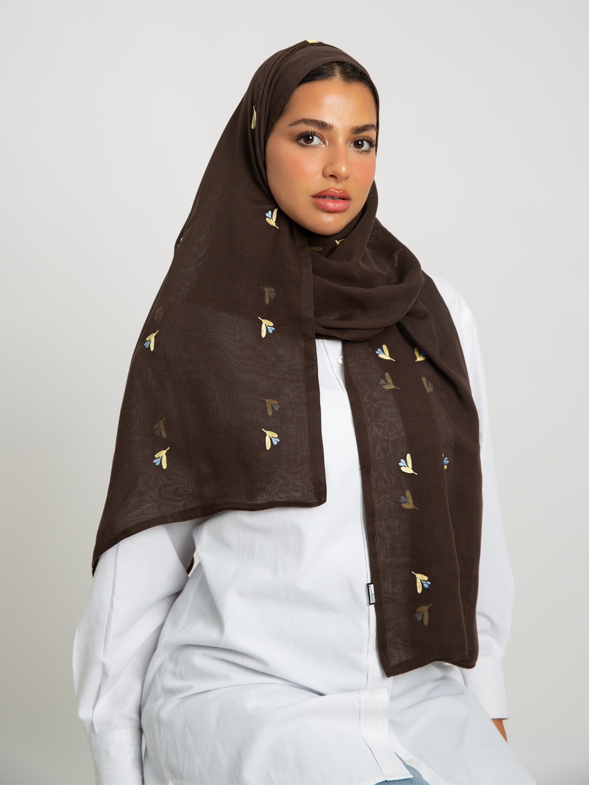 Hijab color: Dark Brown Tarha with Heart Flower Embroidery.