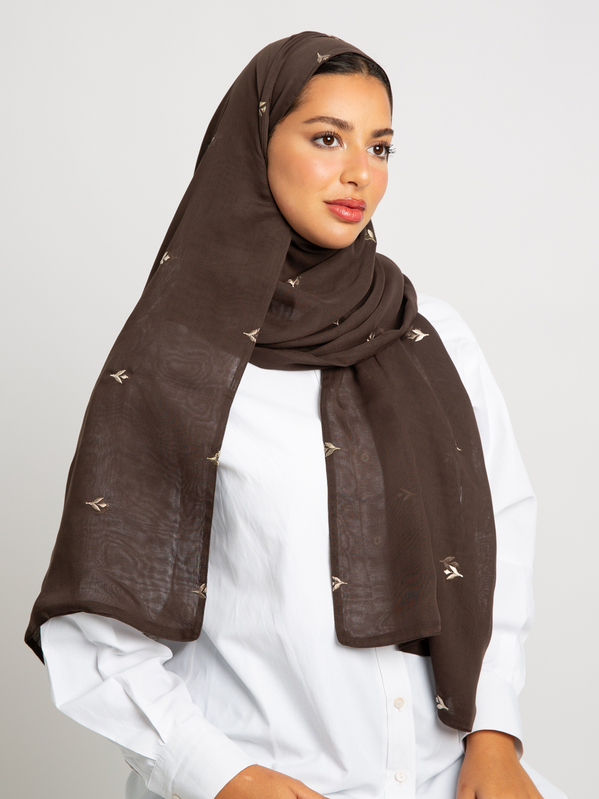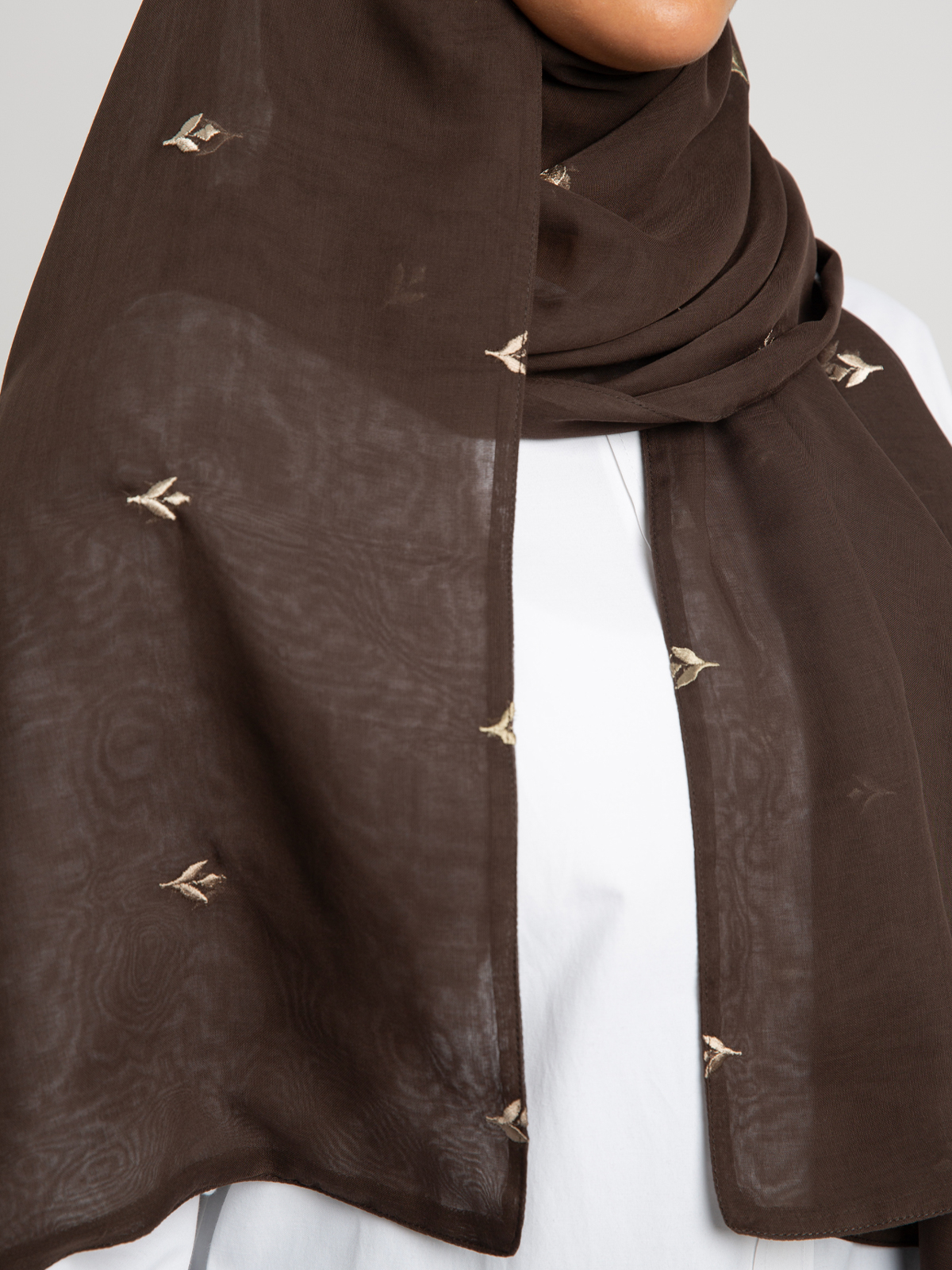 Hijab color: Dark Brown hijab with Flowers Embroidery.