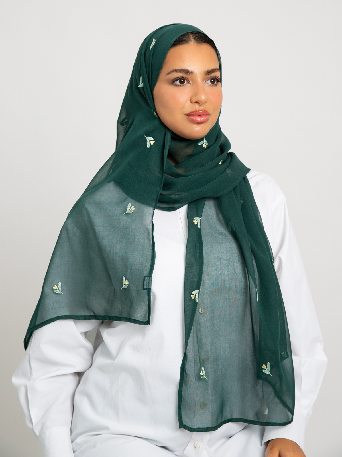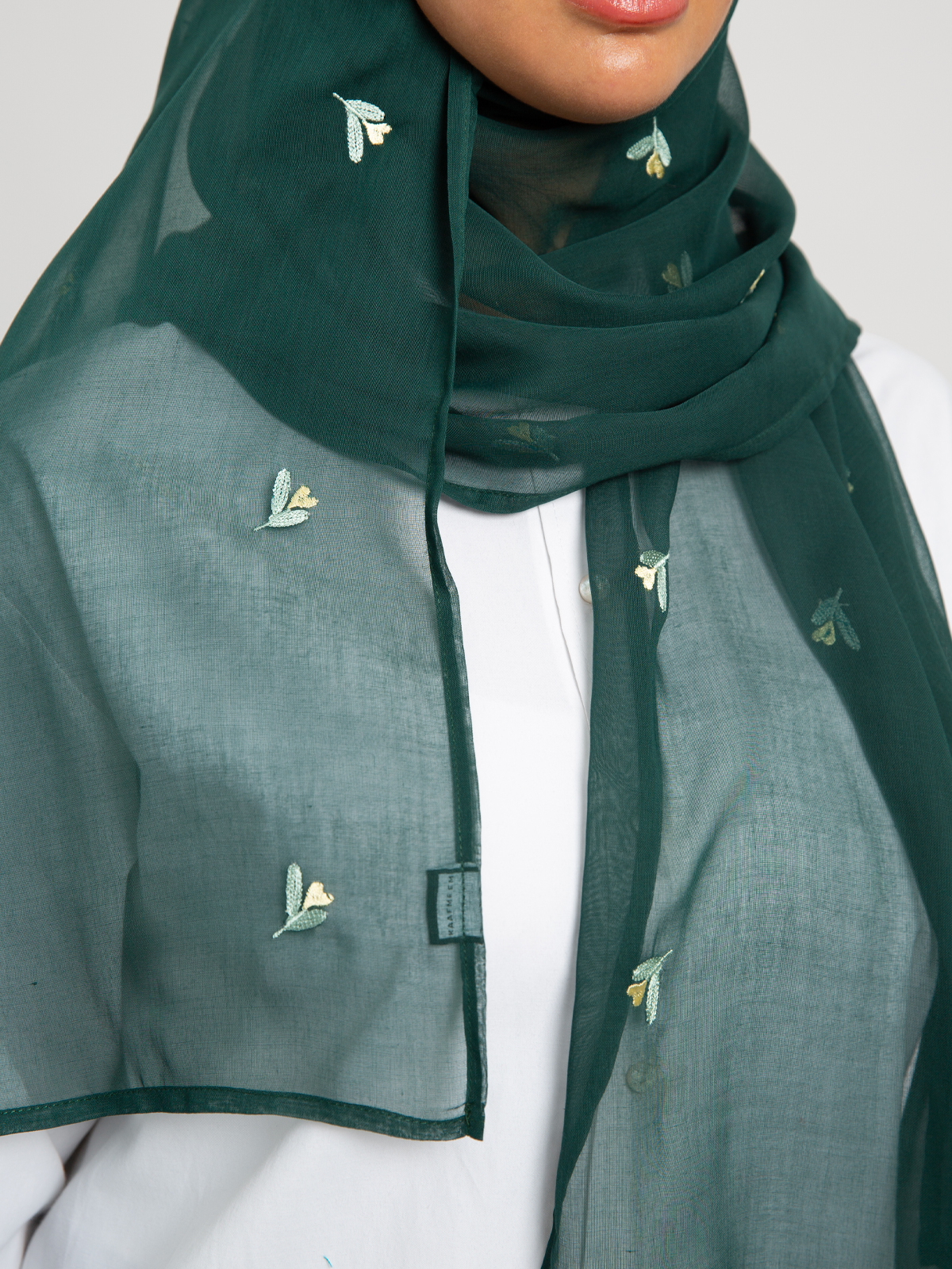 Hijab color: Dark Green Tarha with Heart Flower Embroidery.