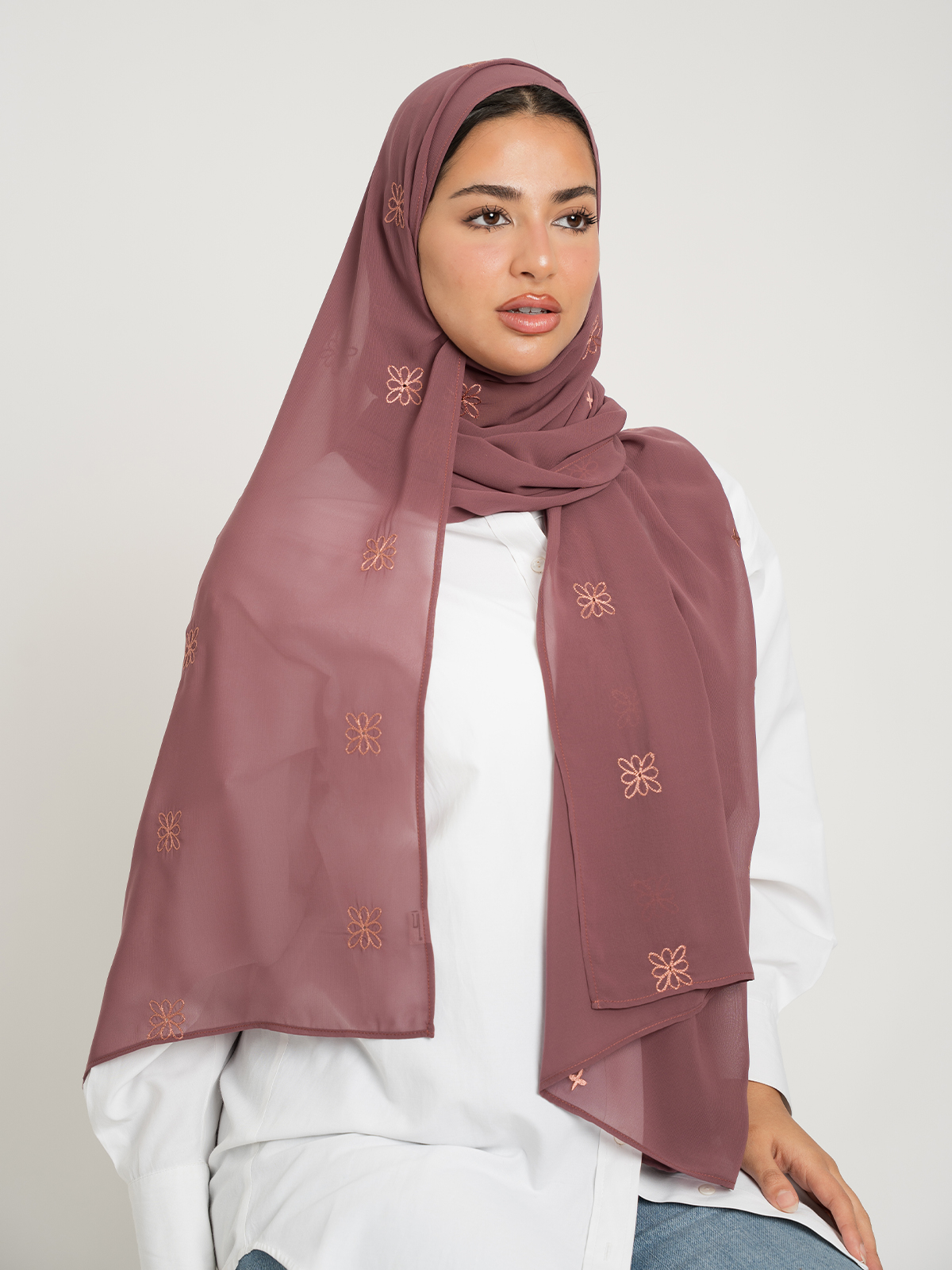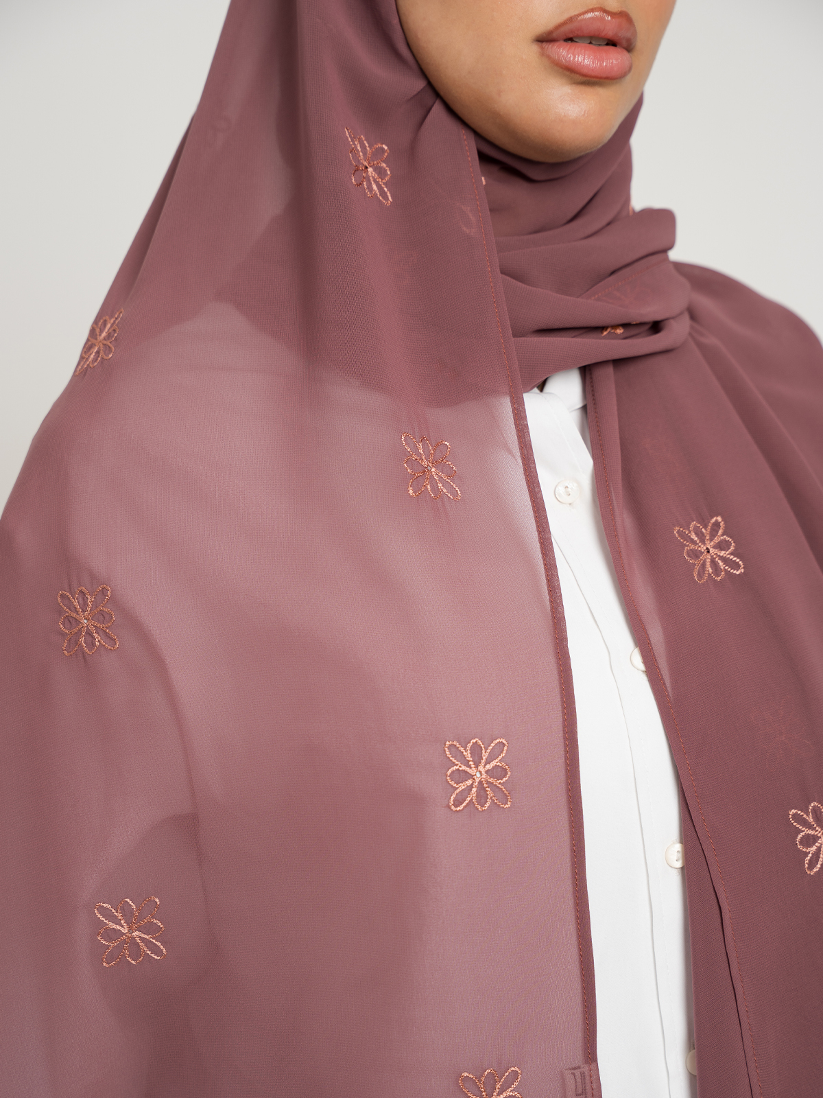 Hijab color: Dusty Rose Tarha with Powder Flower Embroidery.