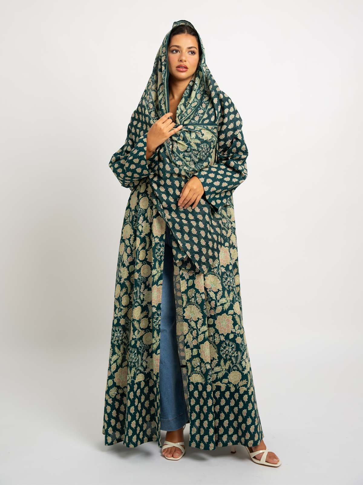 Half Cloche A-Cut Long Open Abaya in Printed Cotton Fabric