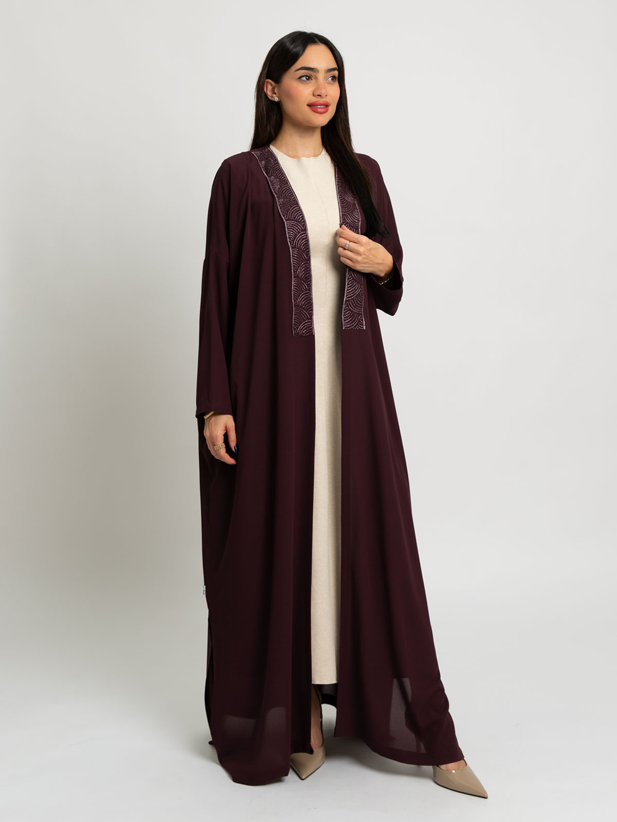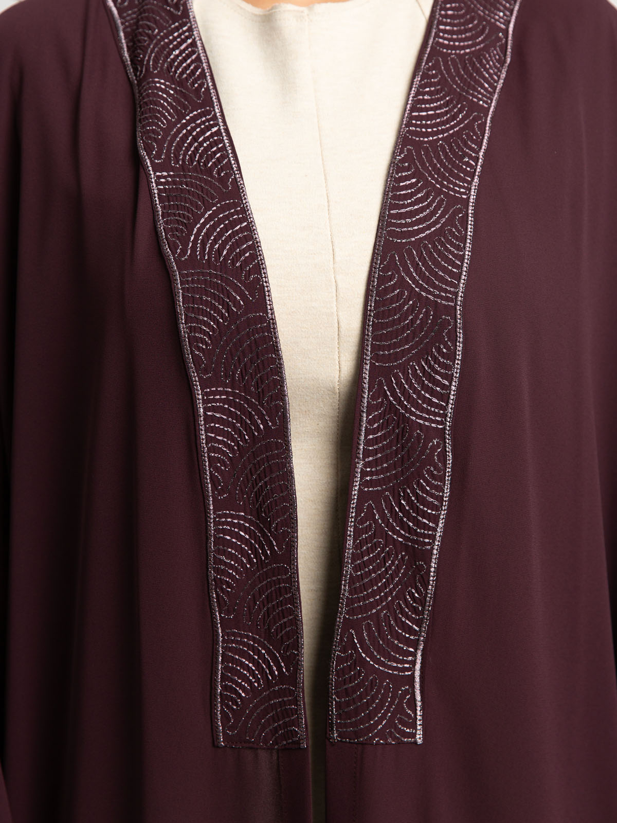 Wide-fit Tight Sleeves Long Open Abaya in Embroidered Light Crepe Fabric