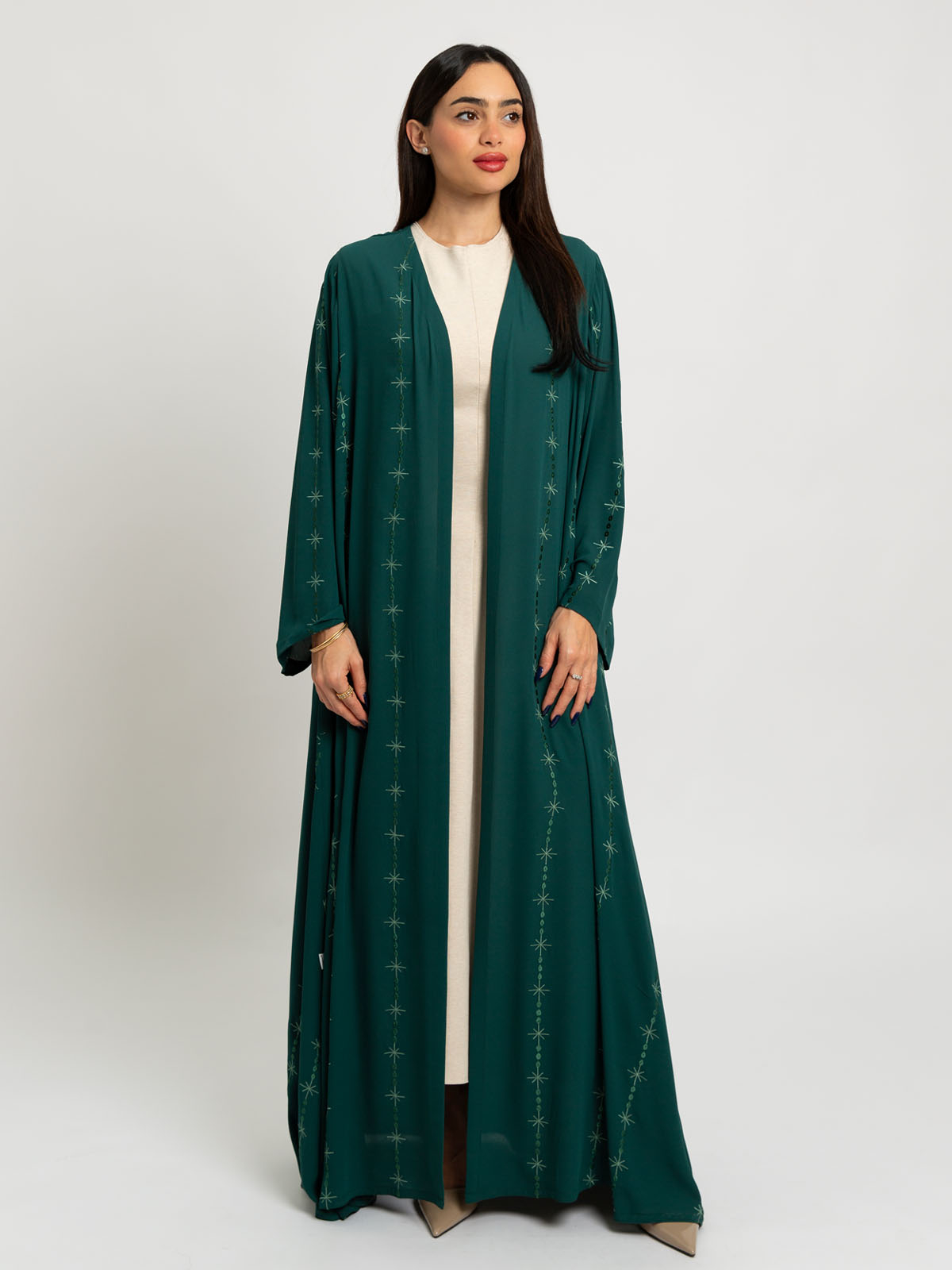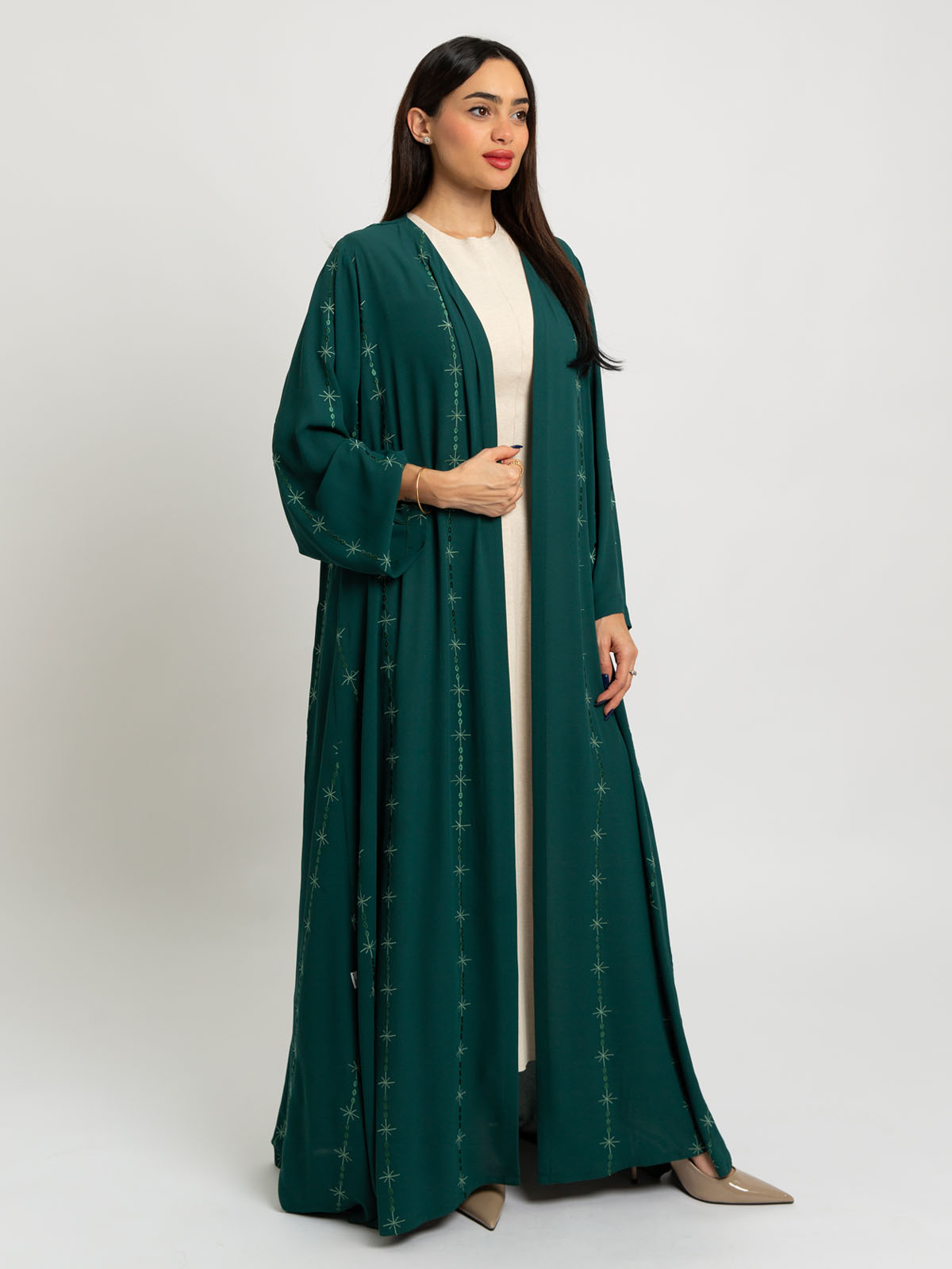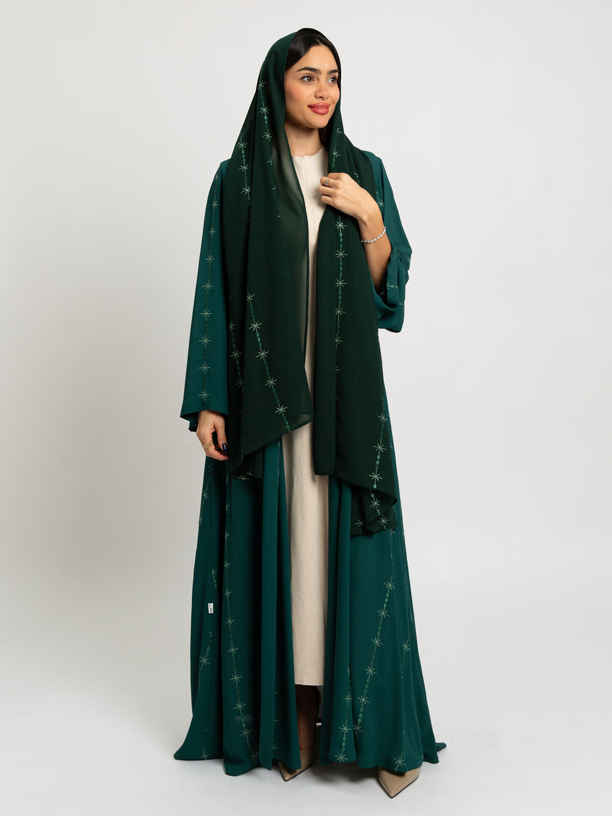 Half Cloche A-Cut Long Open Abaya in Embroidered Light Crepe Fabric