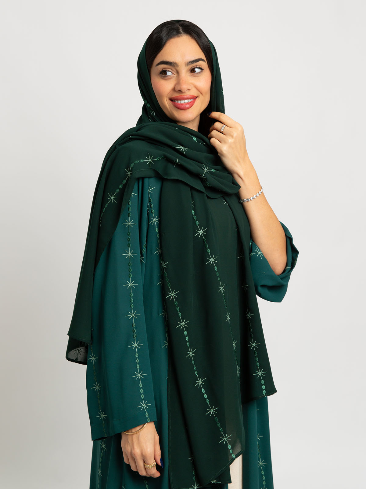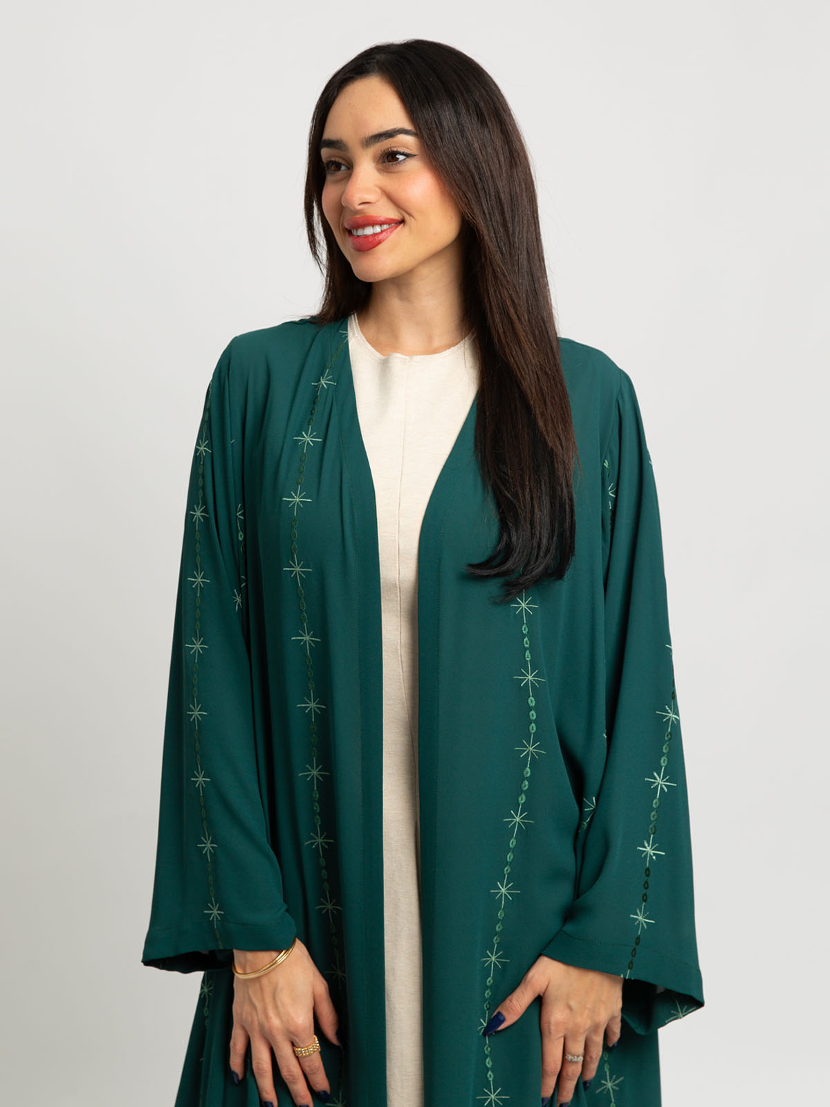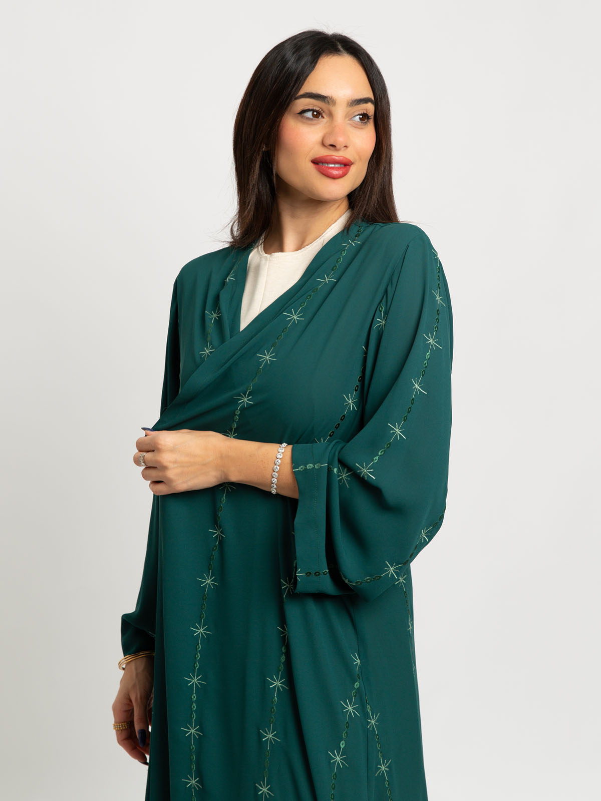 Half Cloche A-Cut Long Open Abaya in Embroidered Light Crepe Fabric