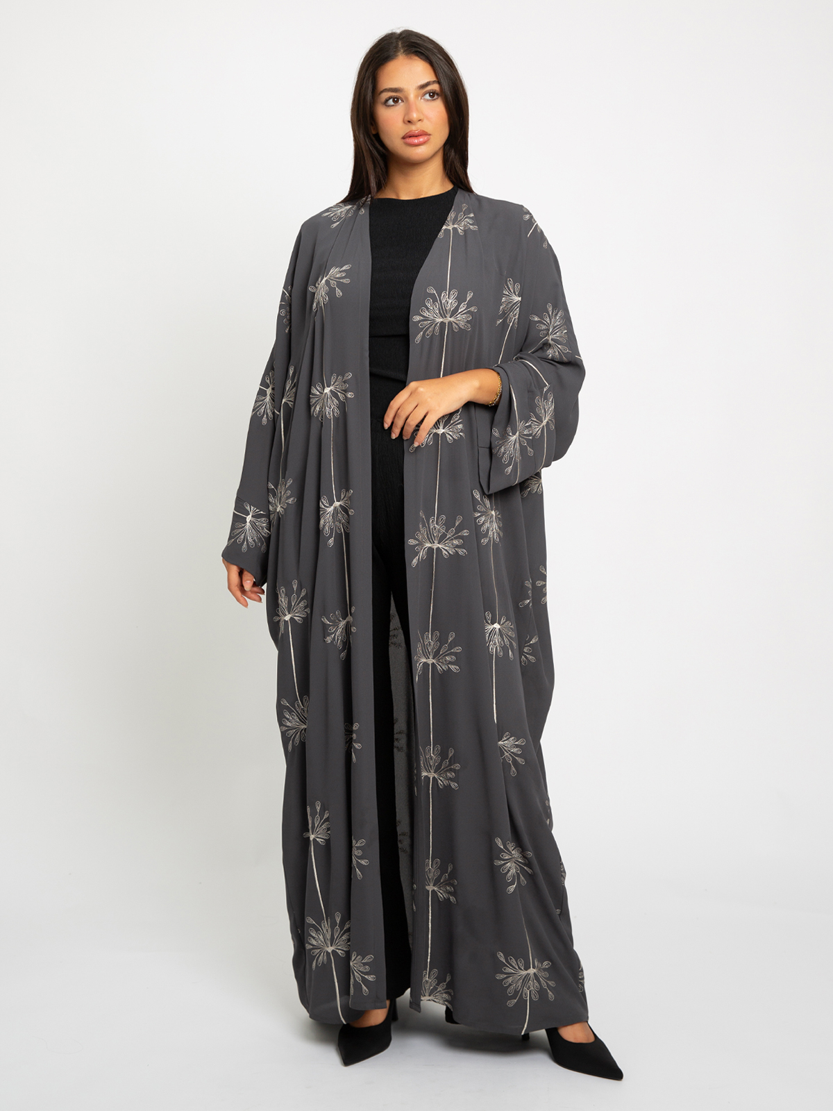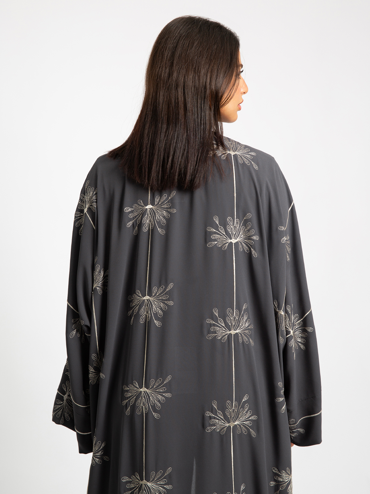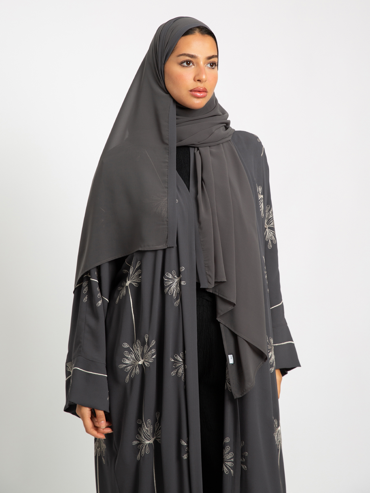 Wide-fit Long Open Abaya in ِِEmbroidered Light Crepe Fabric