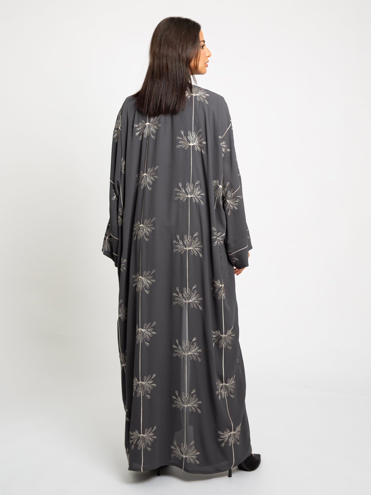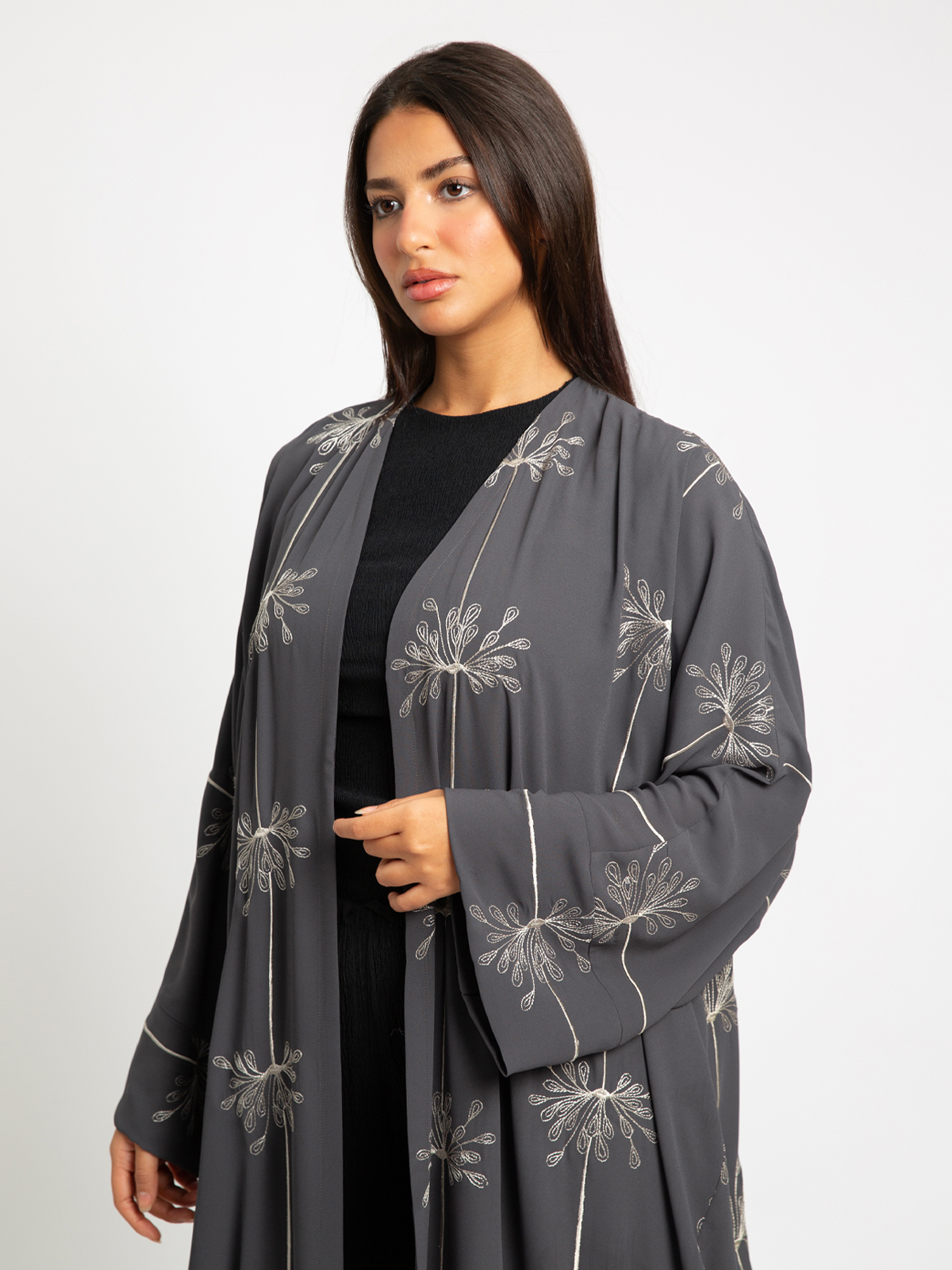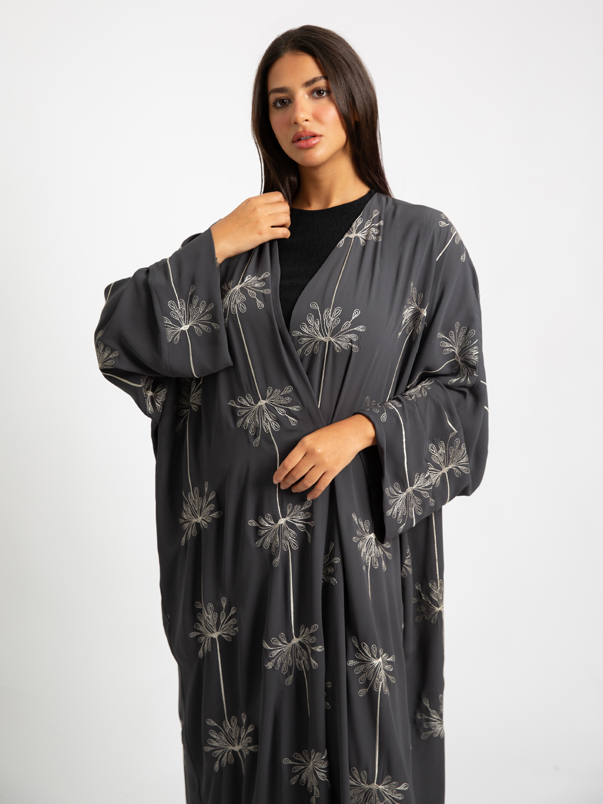 Wide-fit Long Open Abaya in ِِEmbroidered Light Crepe Fabric