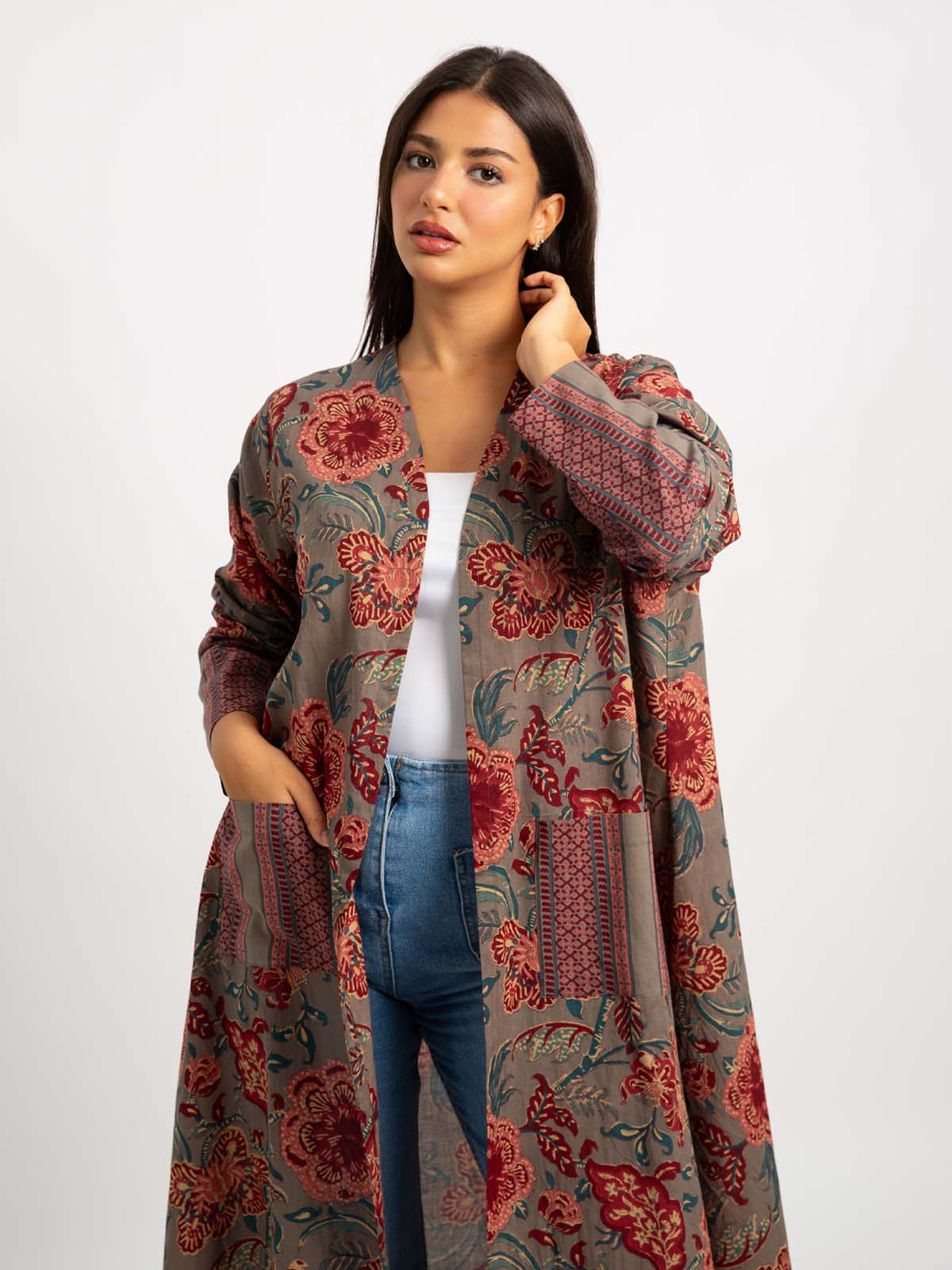 Half Cloche A-Cut Long Open Abaya in Printed Cotton Fabric