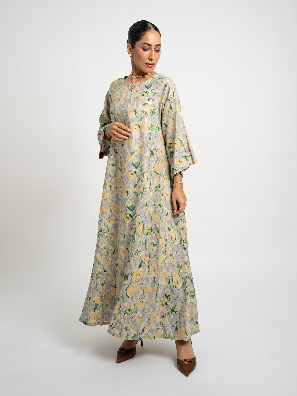 Half Cloche Midi Sleeves Jalabiya Ankle Length in Printed Linen Fabric