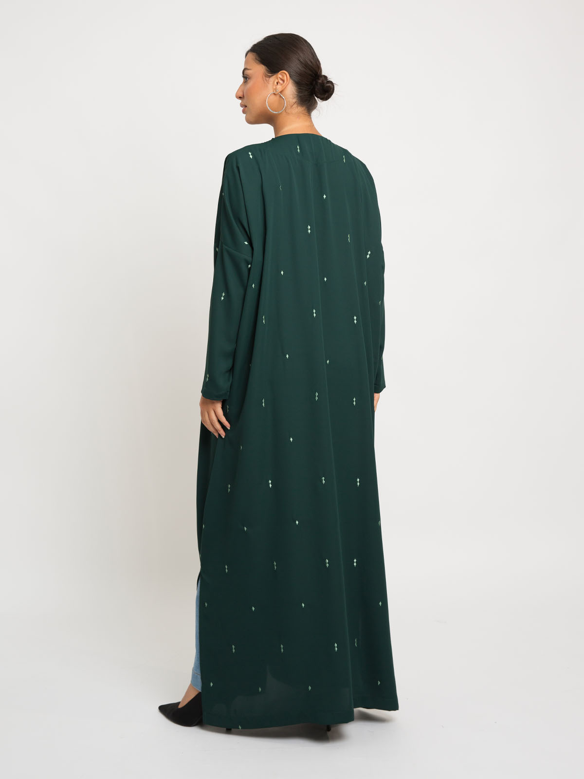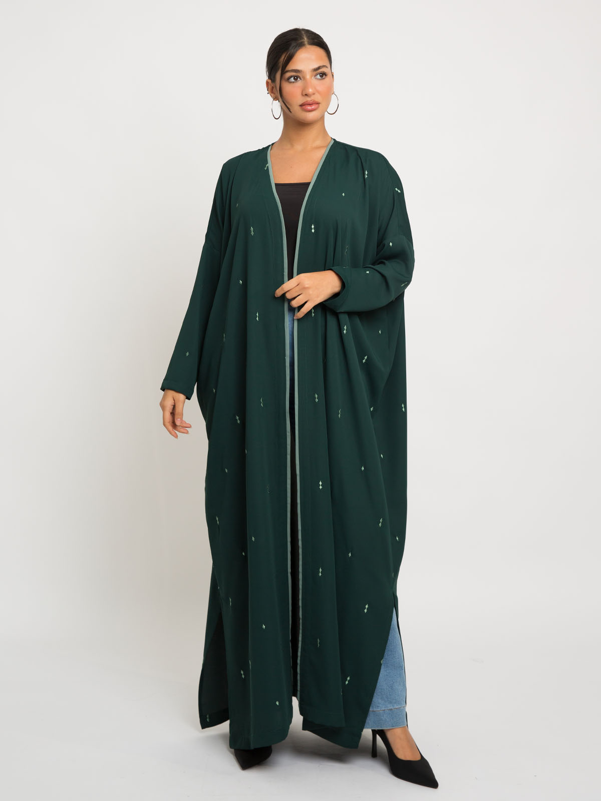Wide-fit Tight Sleeves Long Open Abaya in Embroidered Crepe Fabric