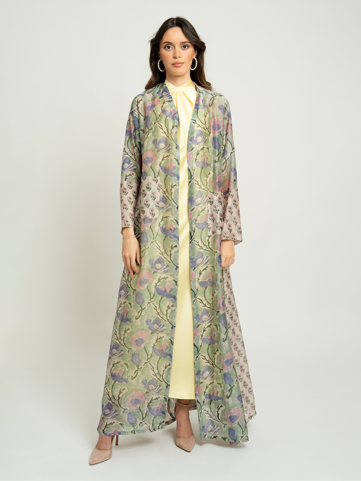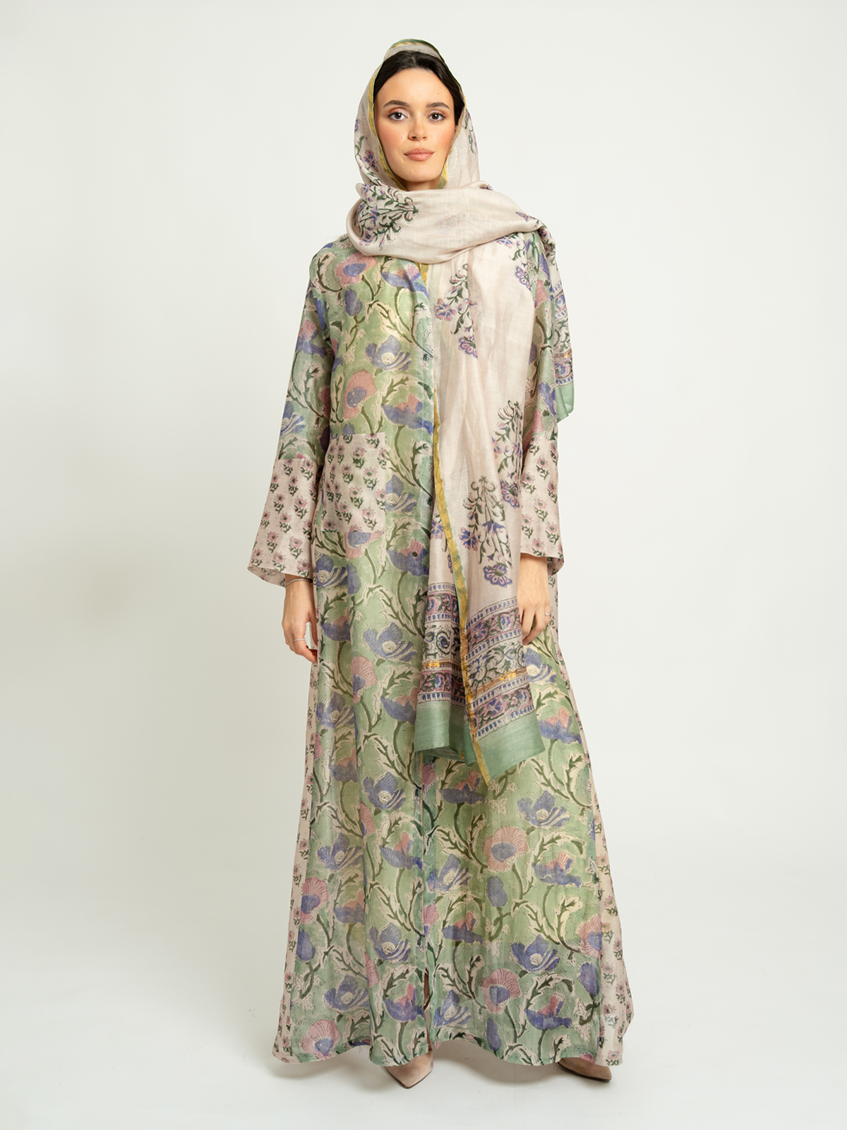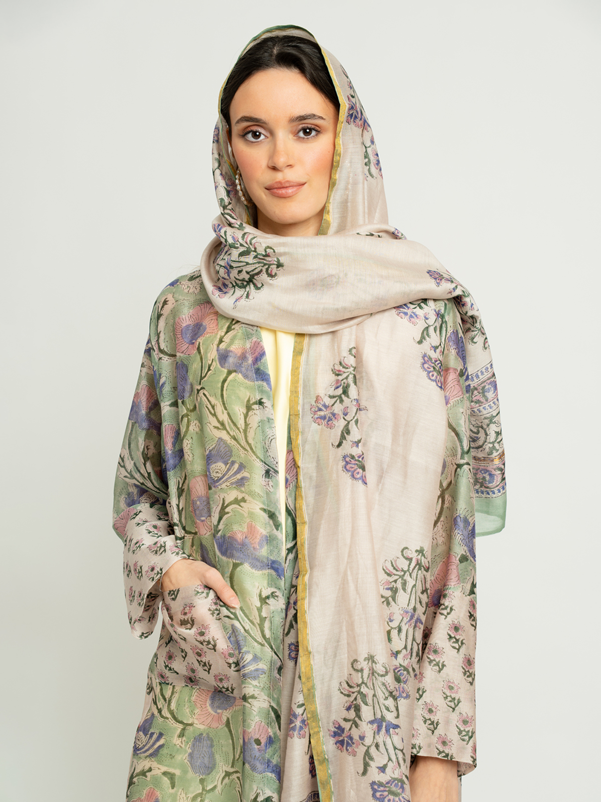 A new A-cut half cloche printed abaya made from premium 100% stiff silk fabric, offering a soft, breathable feel you’ll appreciate all day long.