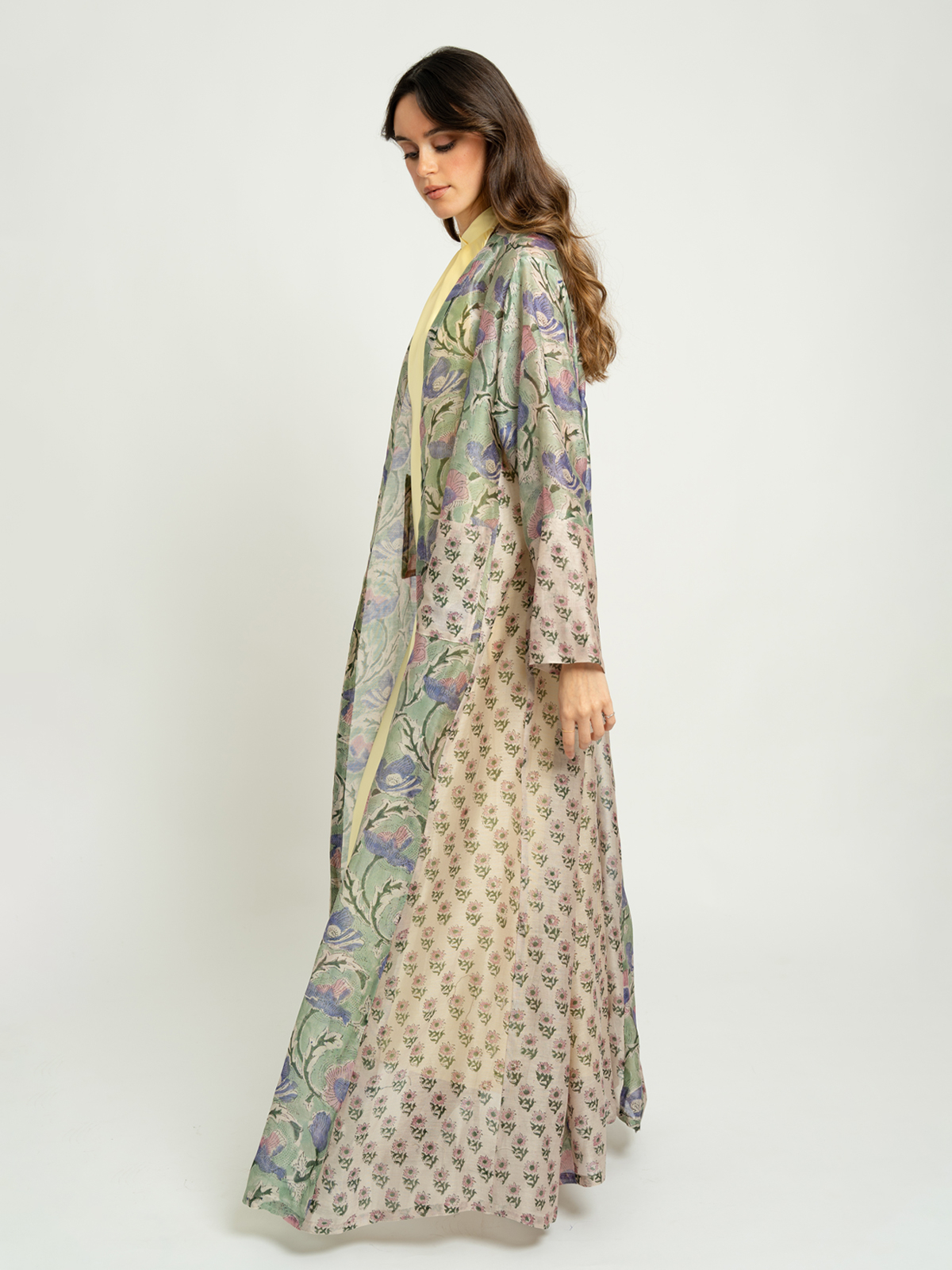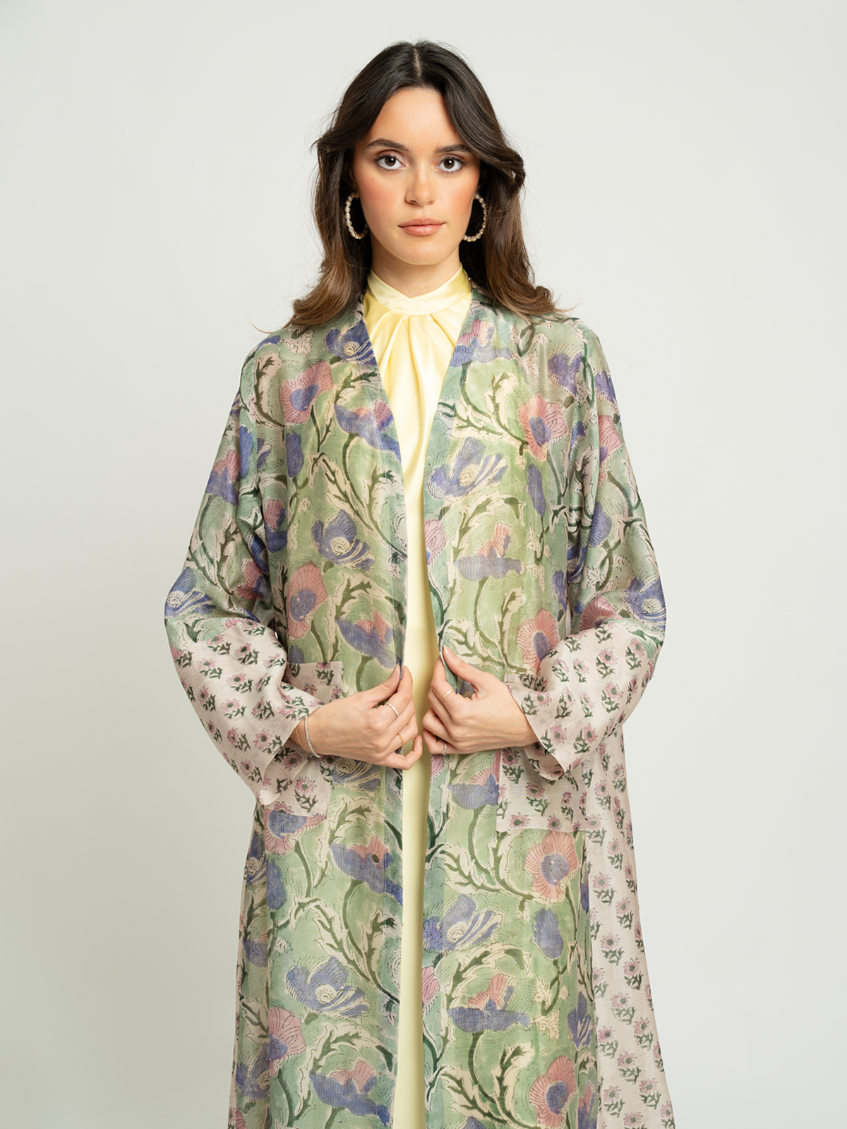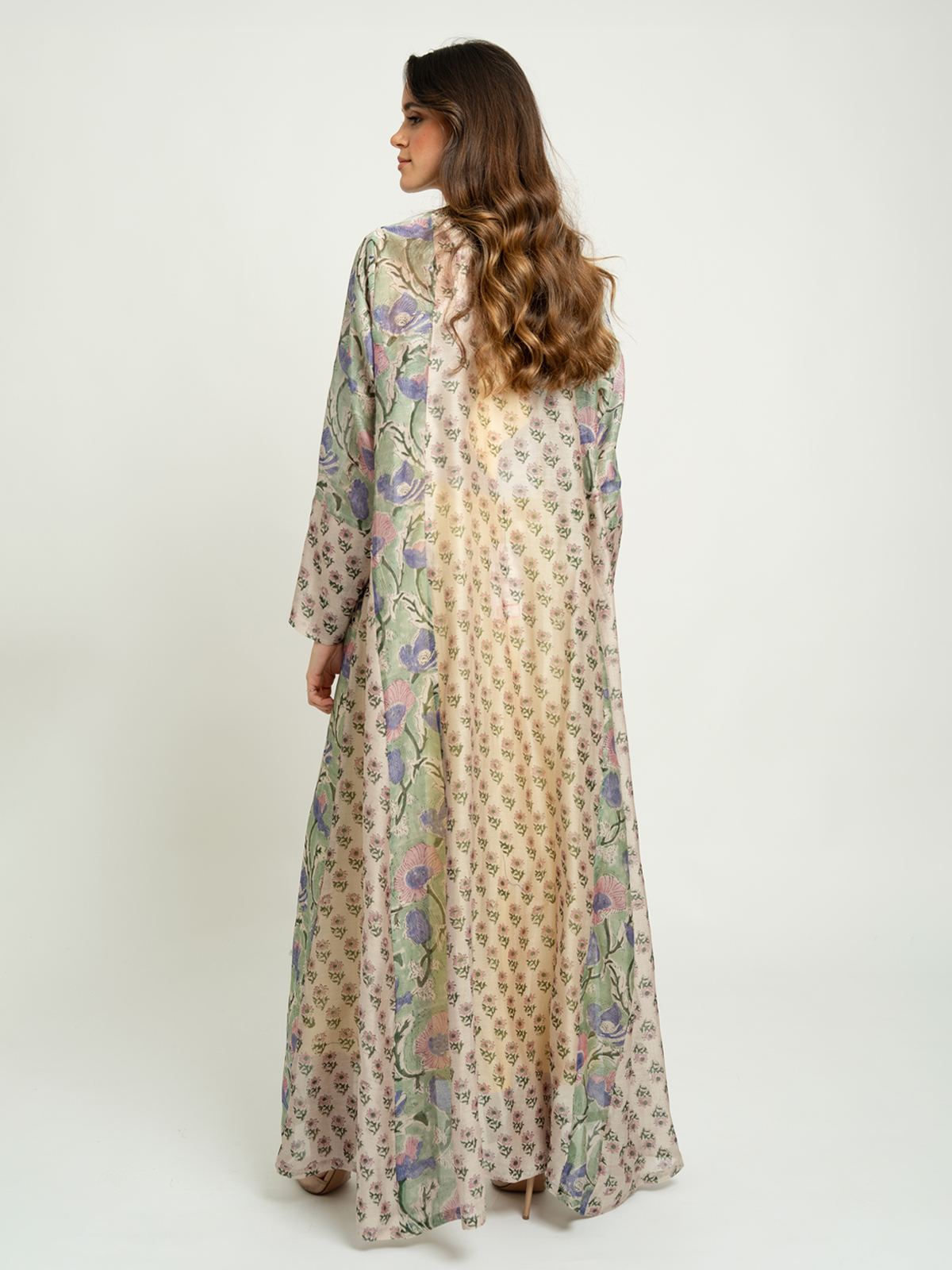 A new A-cut half cloche printed abaya made from premium 100% stiff silk fabric, offering a soft, breathable feel you’ll appreciate all day long.