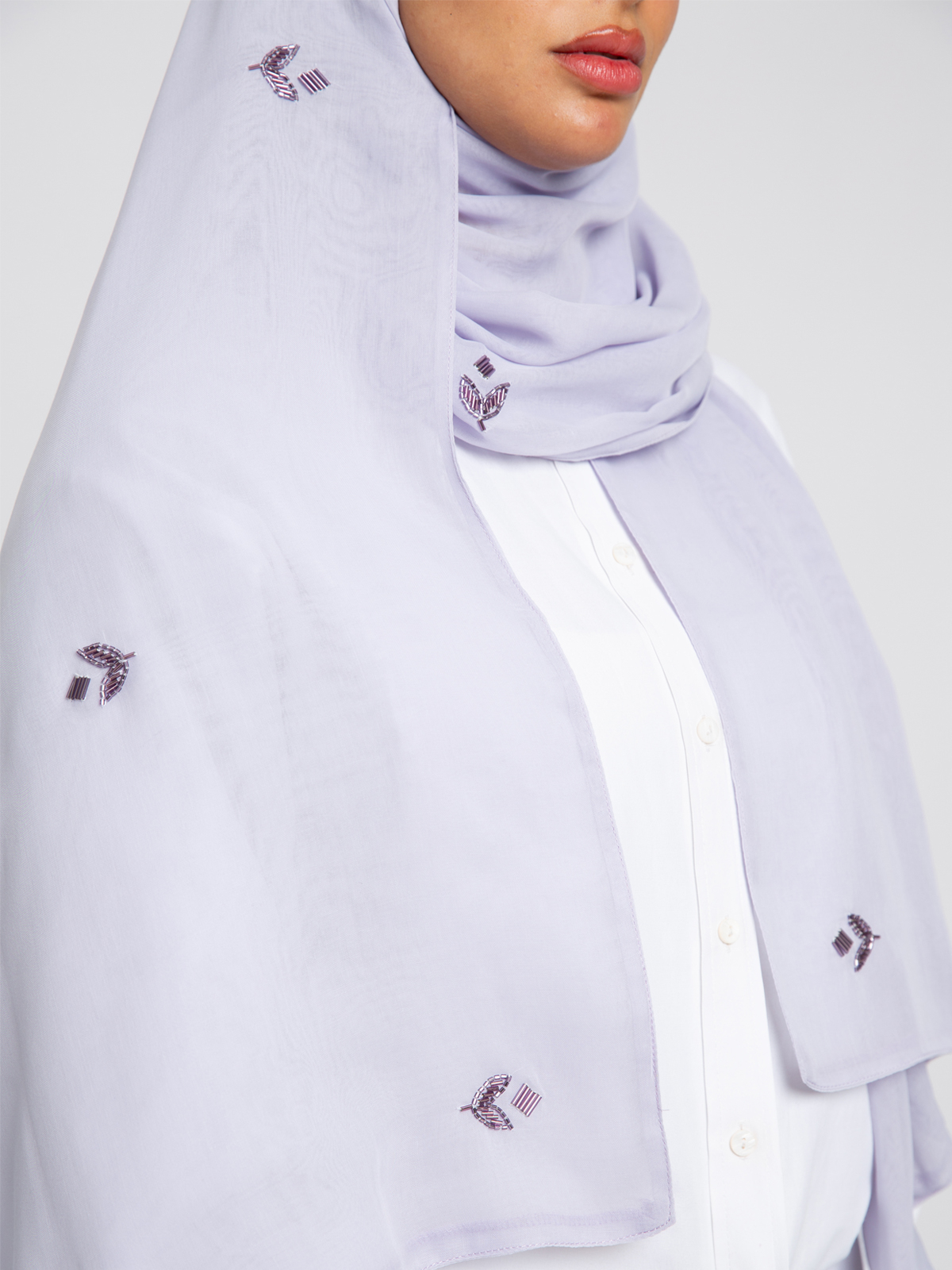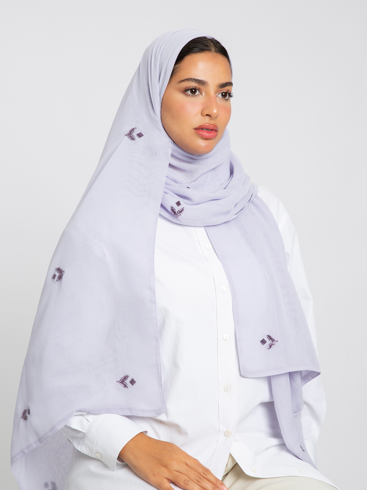 Hijab color: Lavender Tarha with Flowers Embroidery.