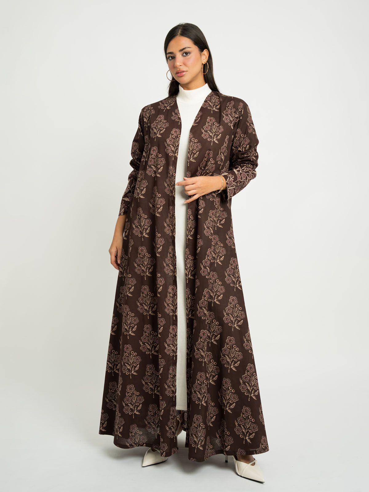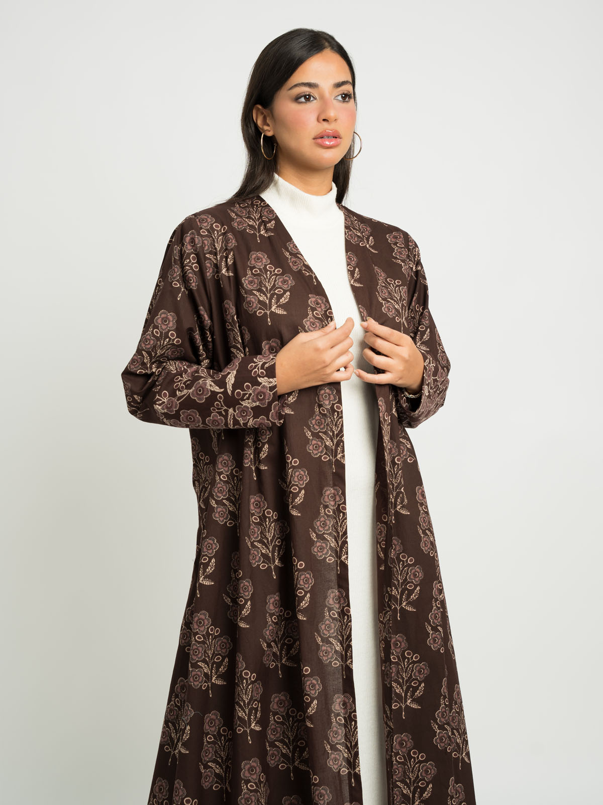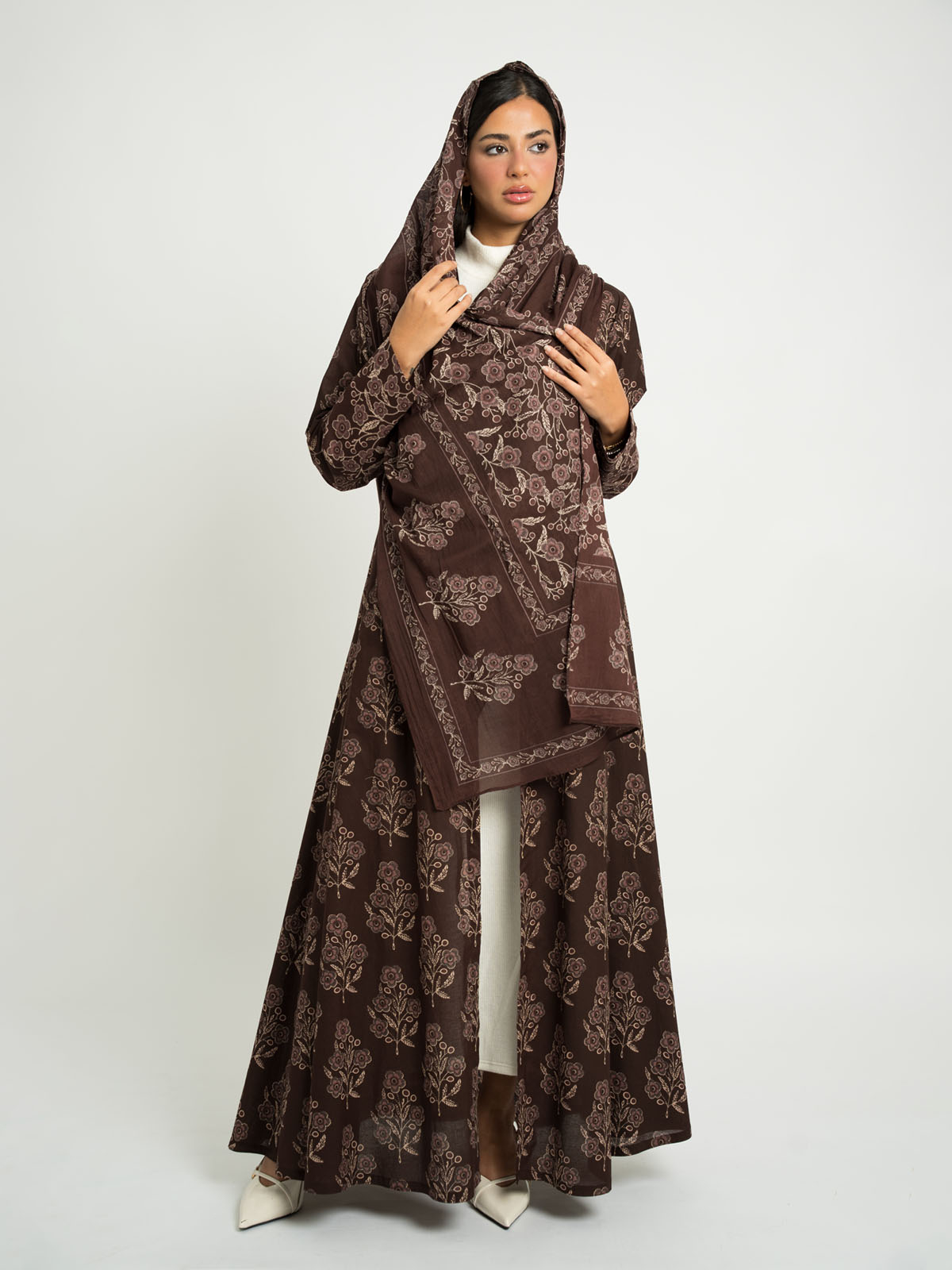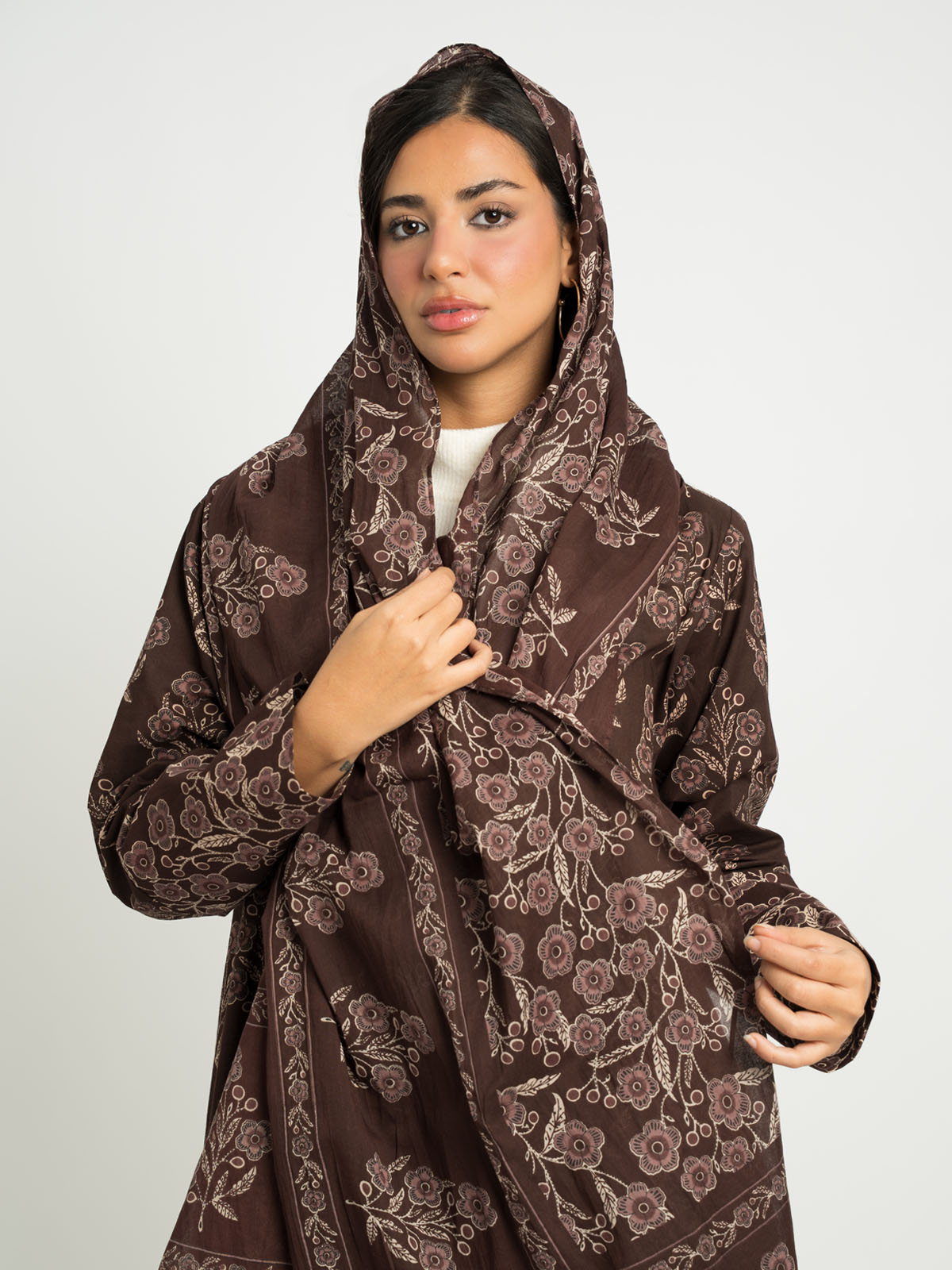 A breezy, relaxed-fit A-cut half cloche abaya made of 100% natural cotton, designed with comfort and attention to detail in mind.