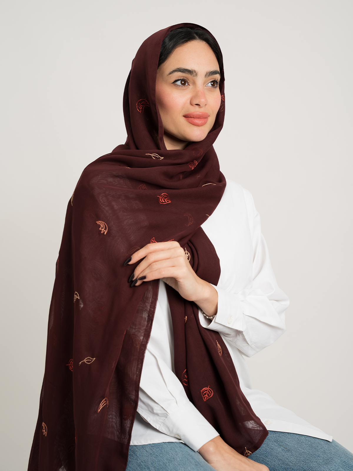 Hijab color: Maroon with Falling Leafs Embroidery.