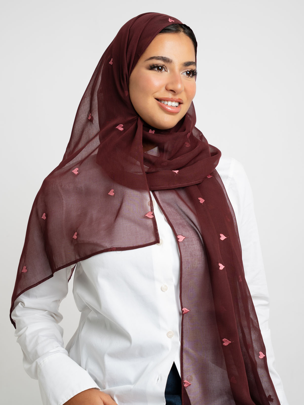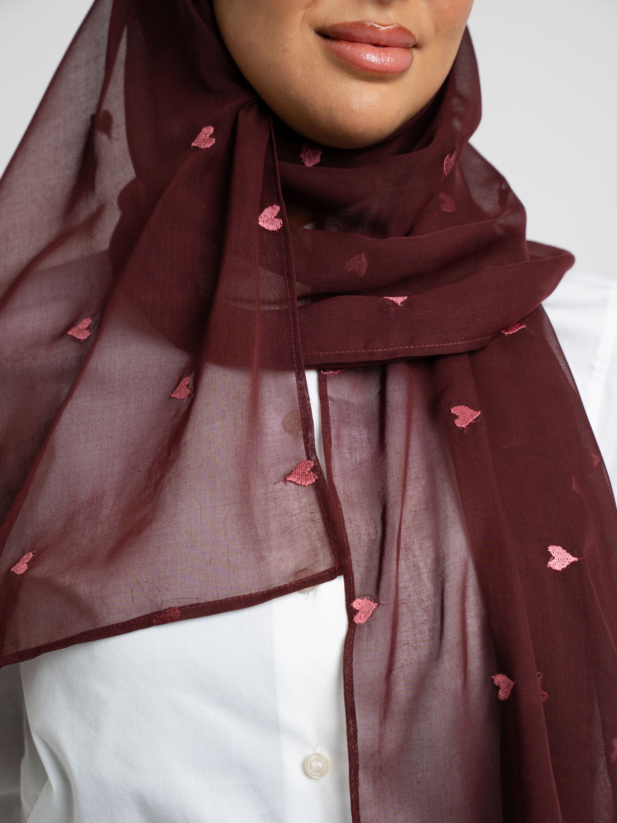 Hijab color: Maroon Tarha with Hearts Embroidery.
