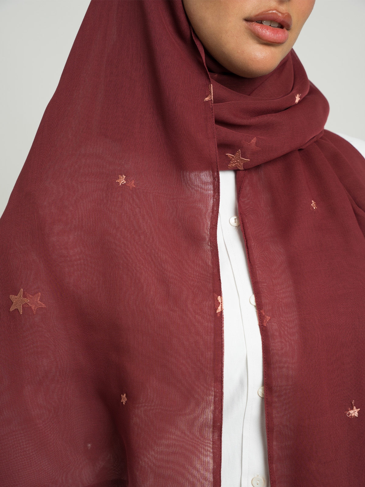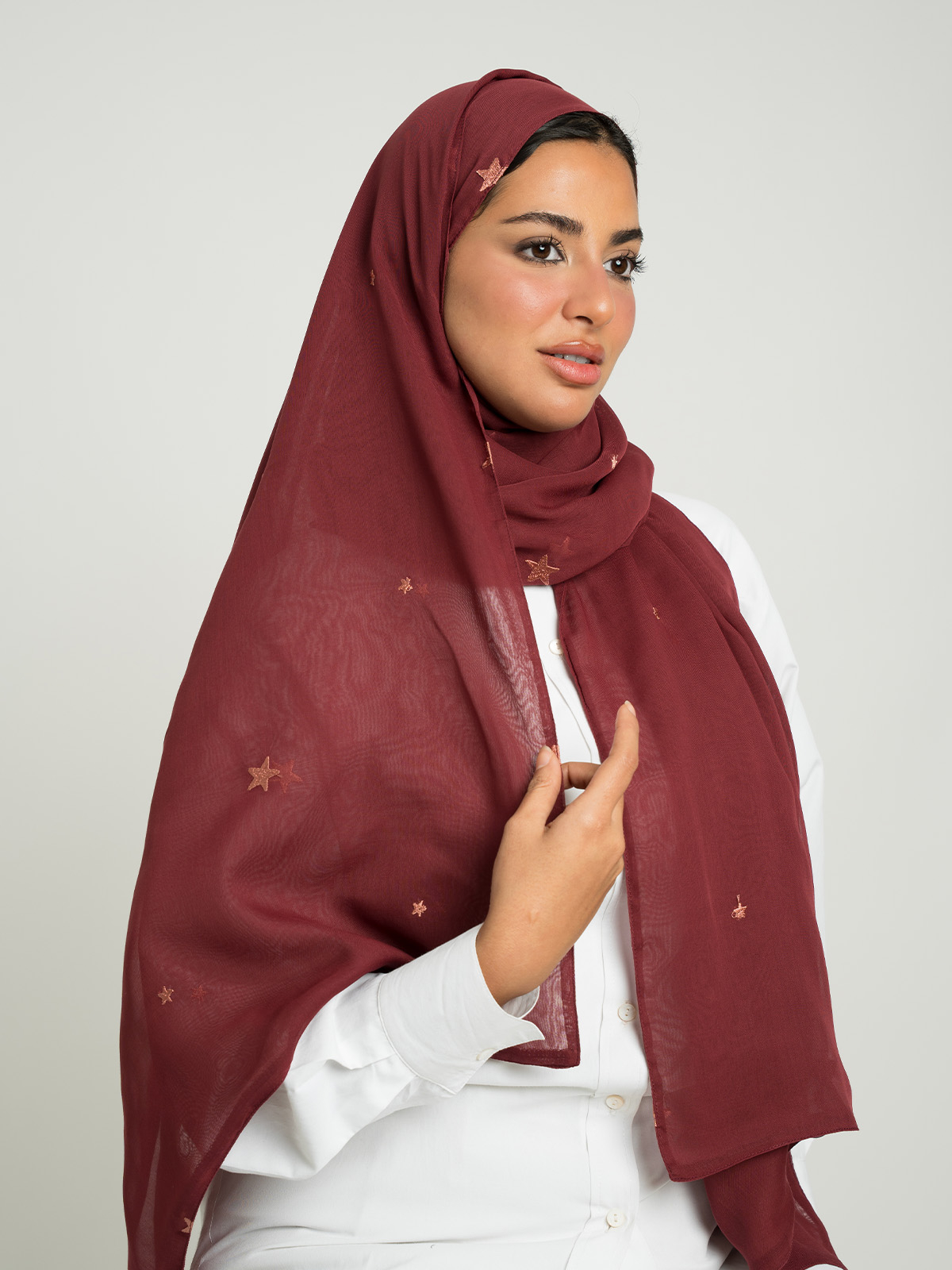 Discover the perfect blend of stability and sophistication with this Japanese voile hijab. Its breathable fabric keeps you comfortable all day, while the stars embroidery adds a soft feminine charm to your look!