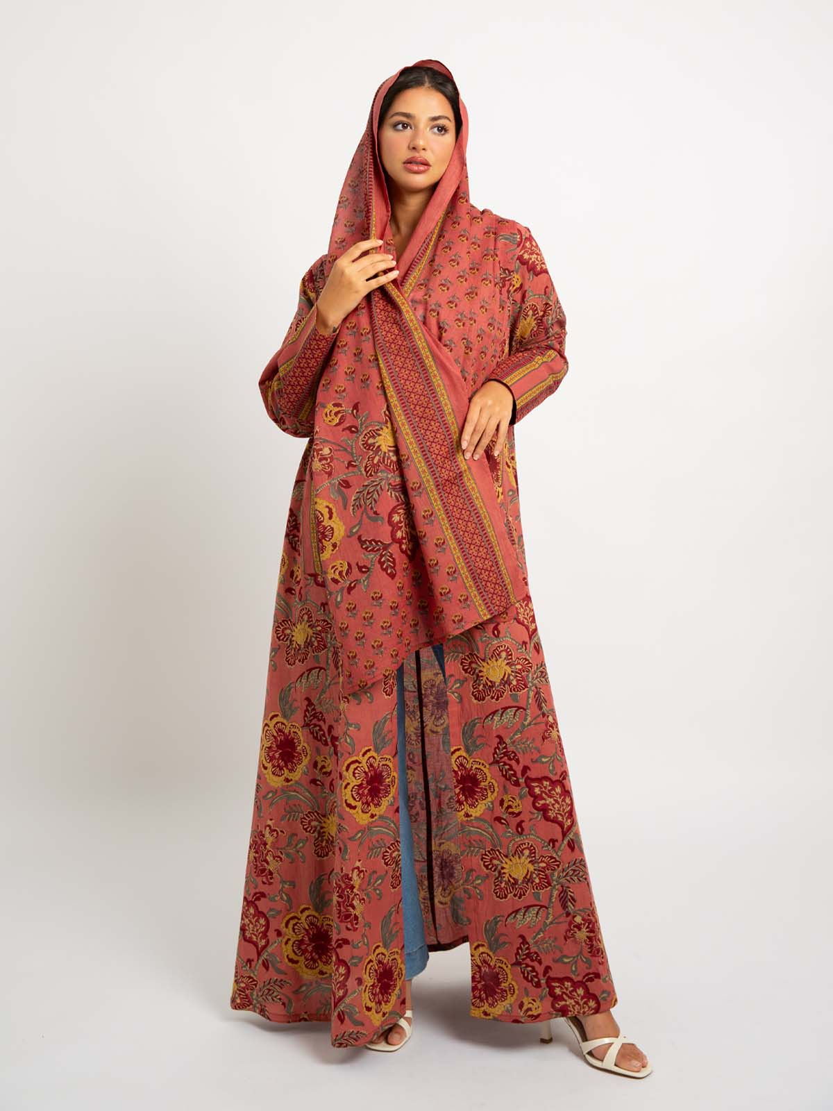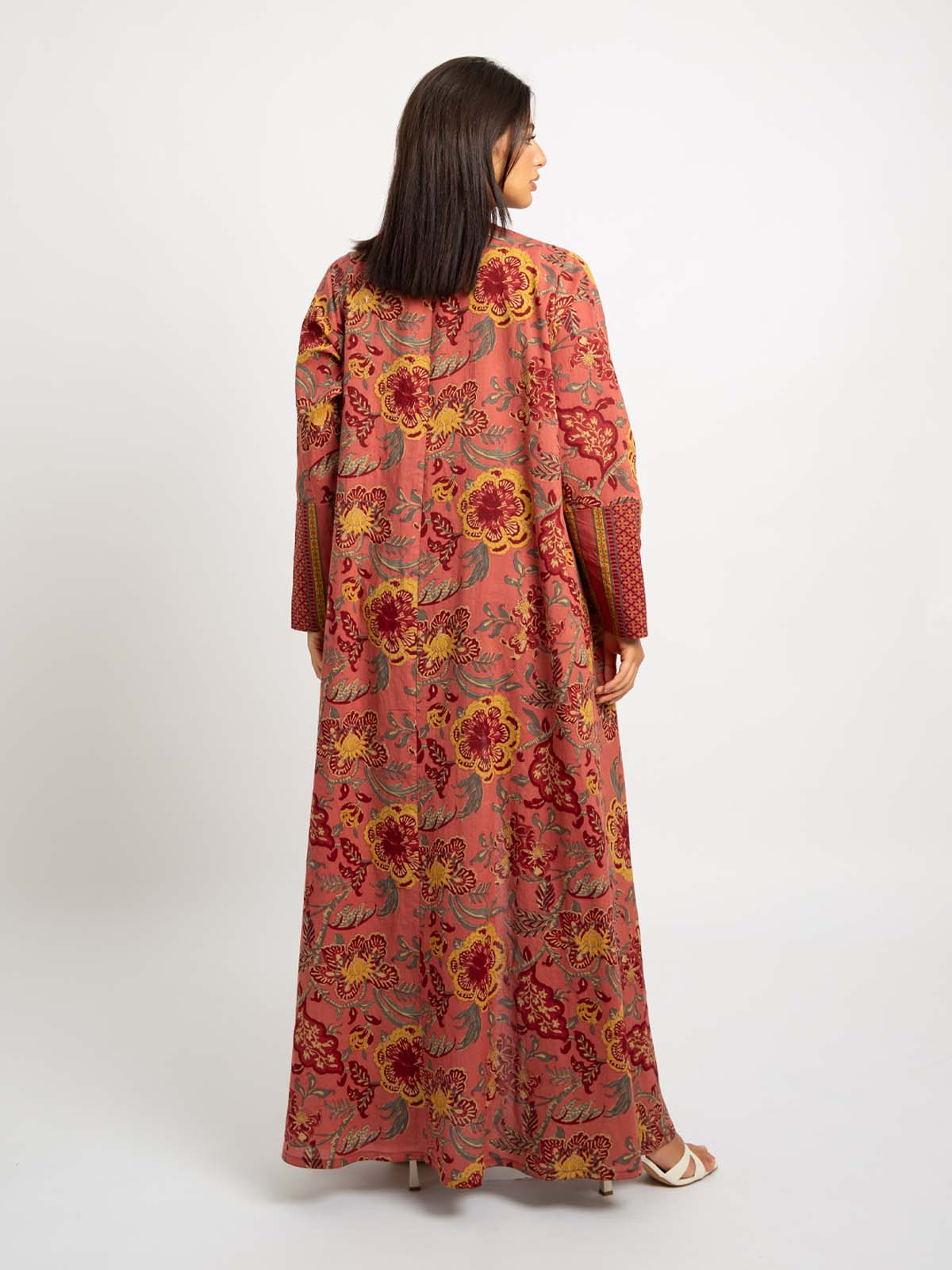 Half Cloche A-Cut Long Open Abaya in Printed Cotton Fabric