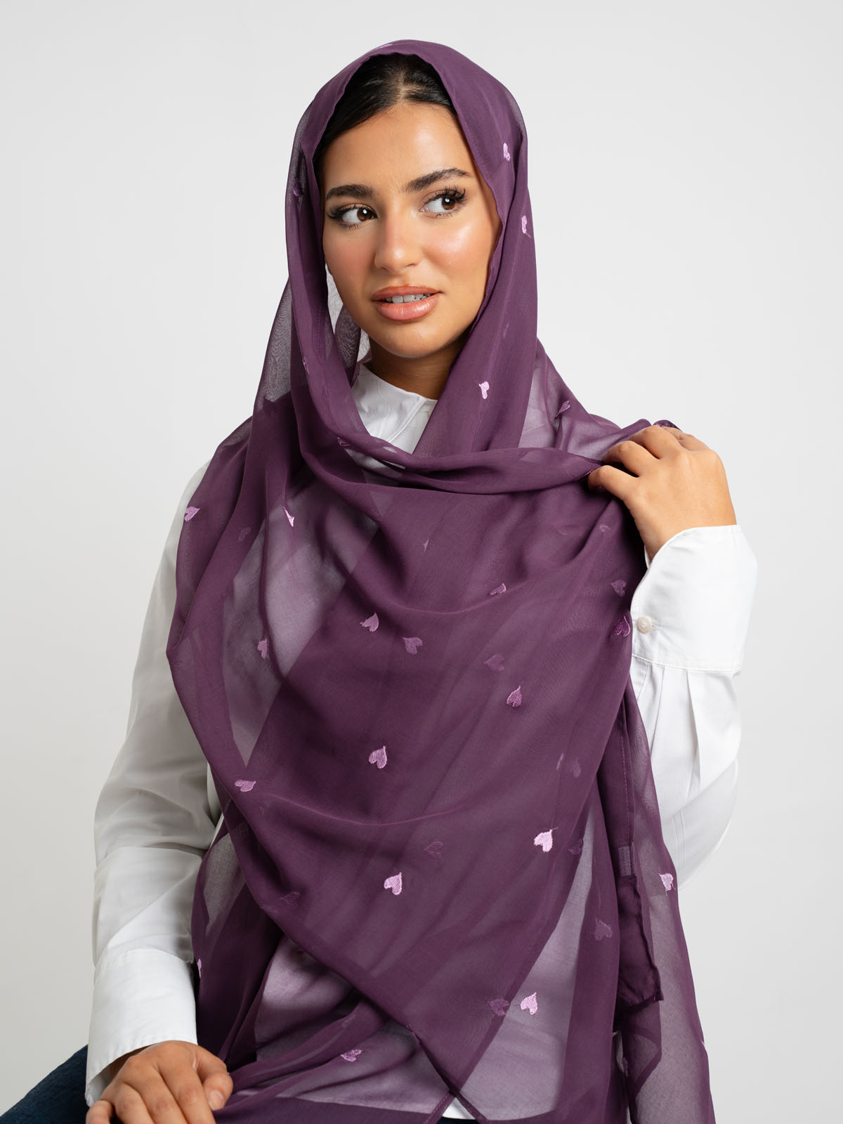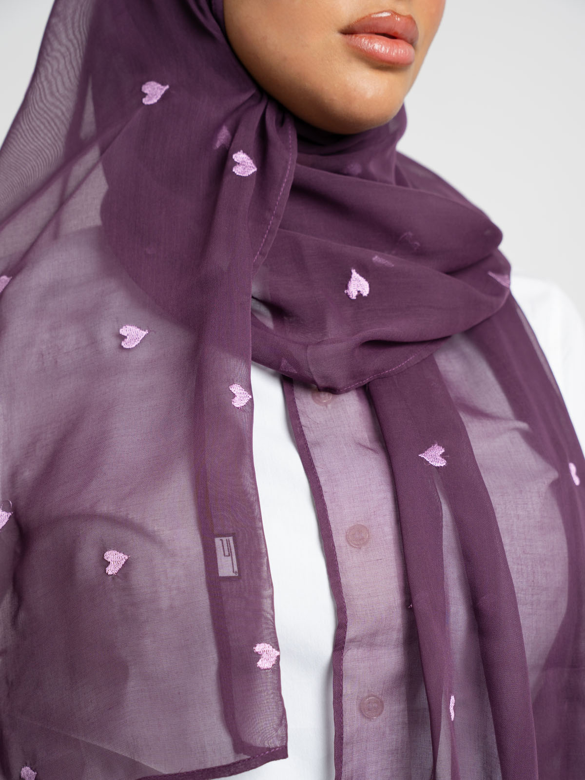 Hijab color: Mauve Tarha with Hearts Embroidery.