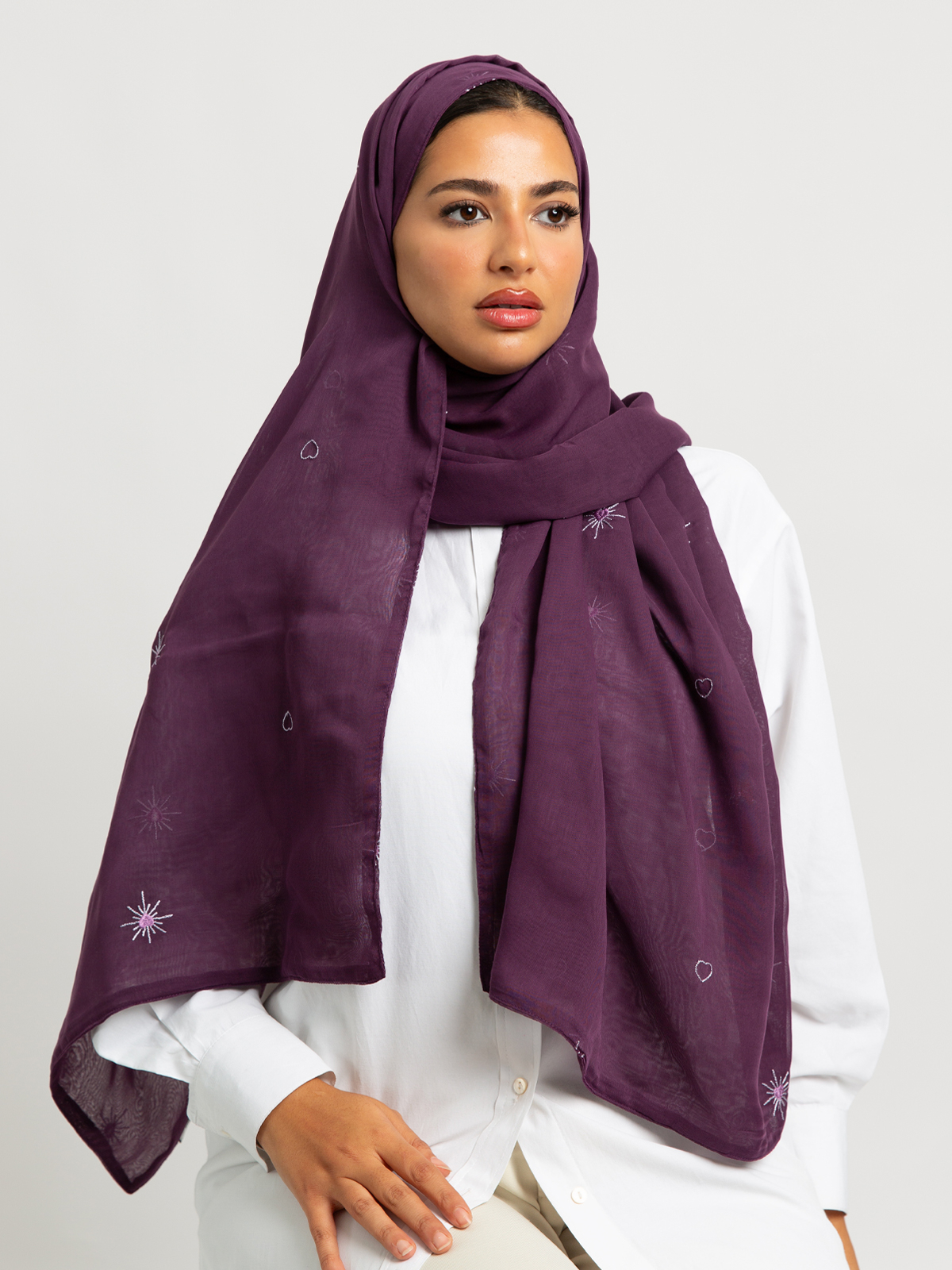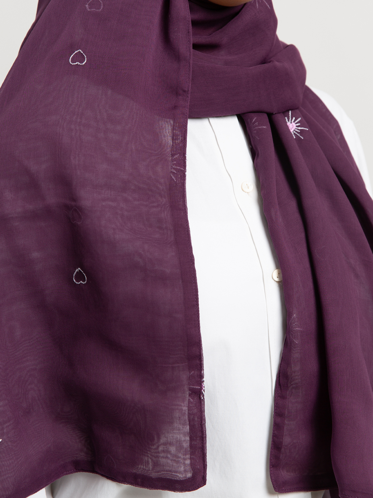 Hijab color: Mauve with Shining Hearts Embroidery.