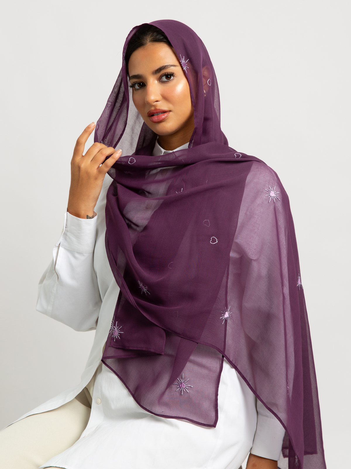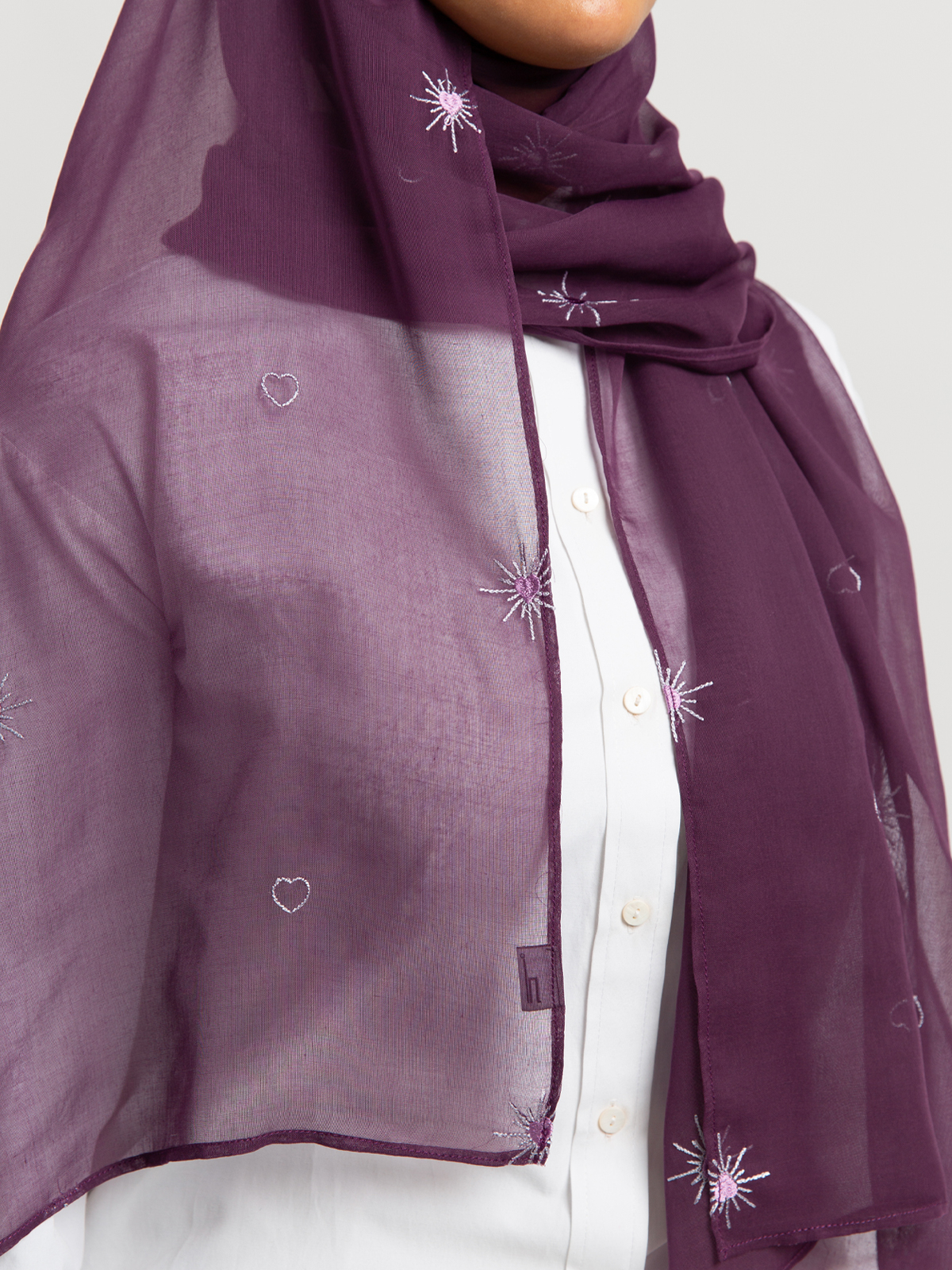 Hijab color: Mauve with Shining Hearts Embroidery.