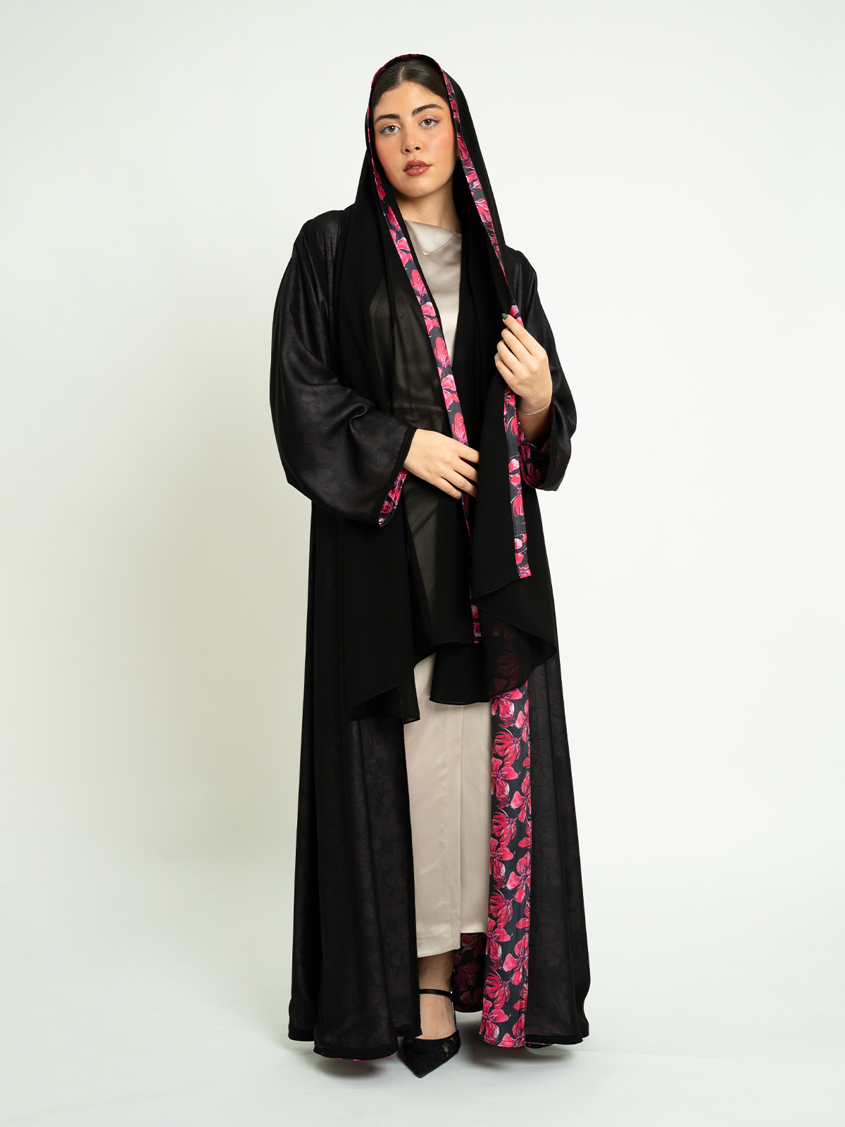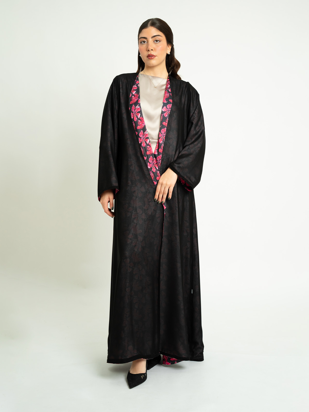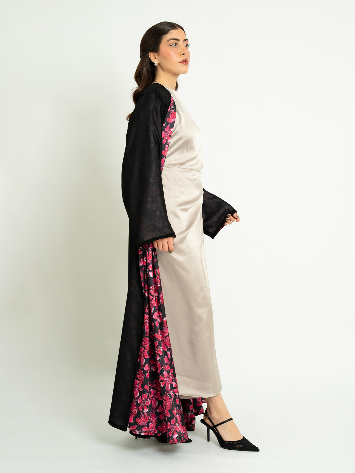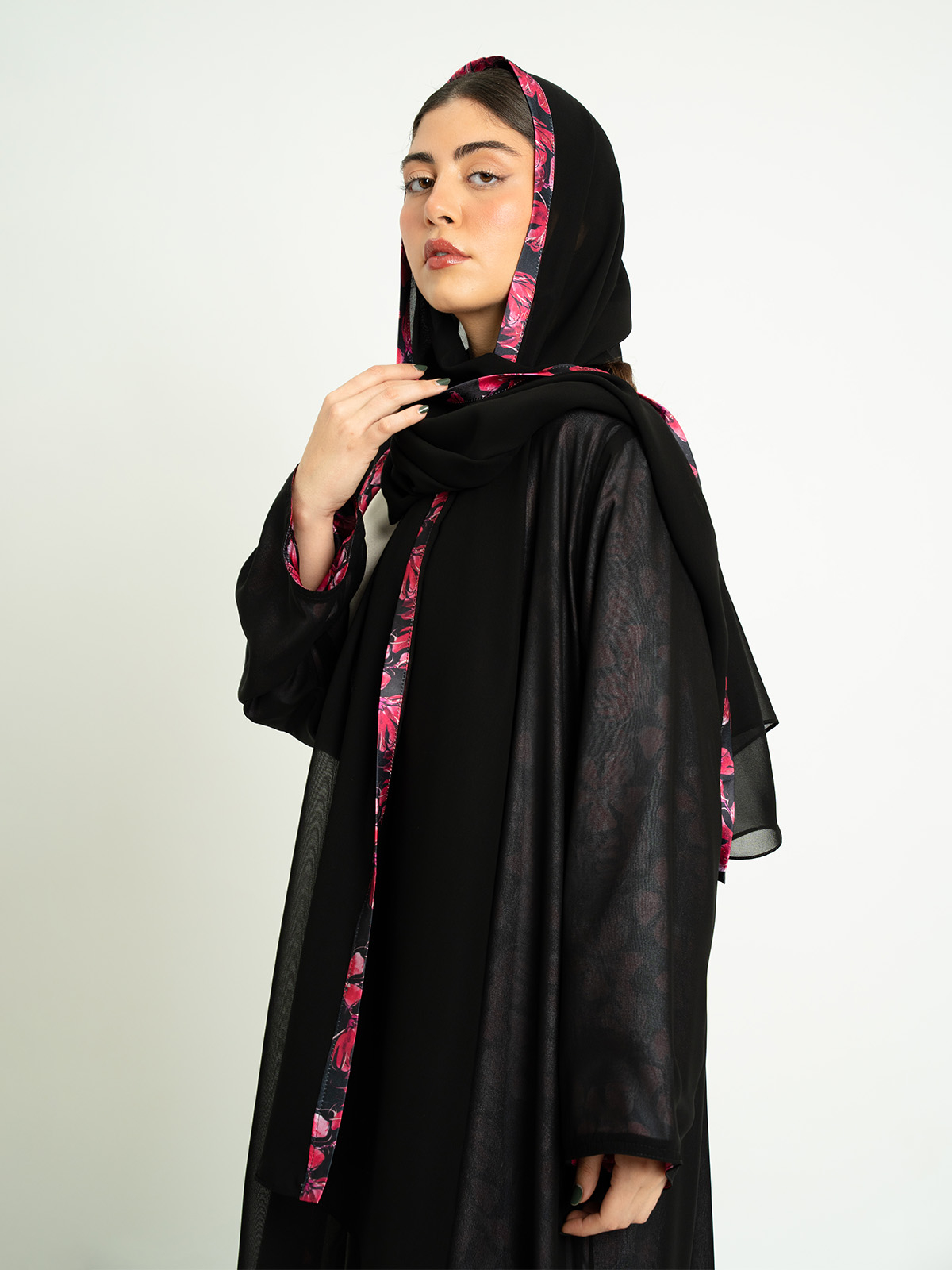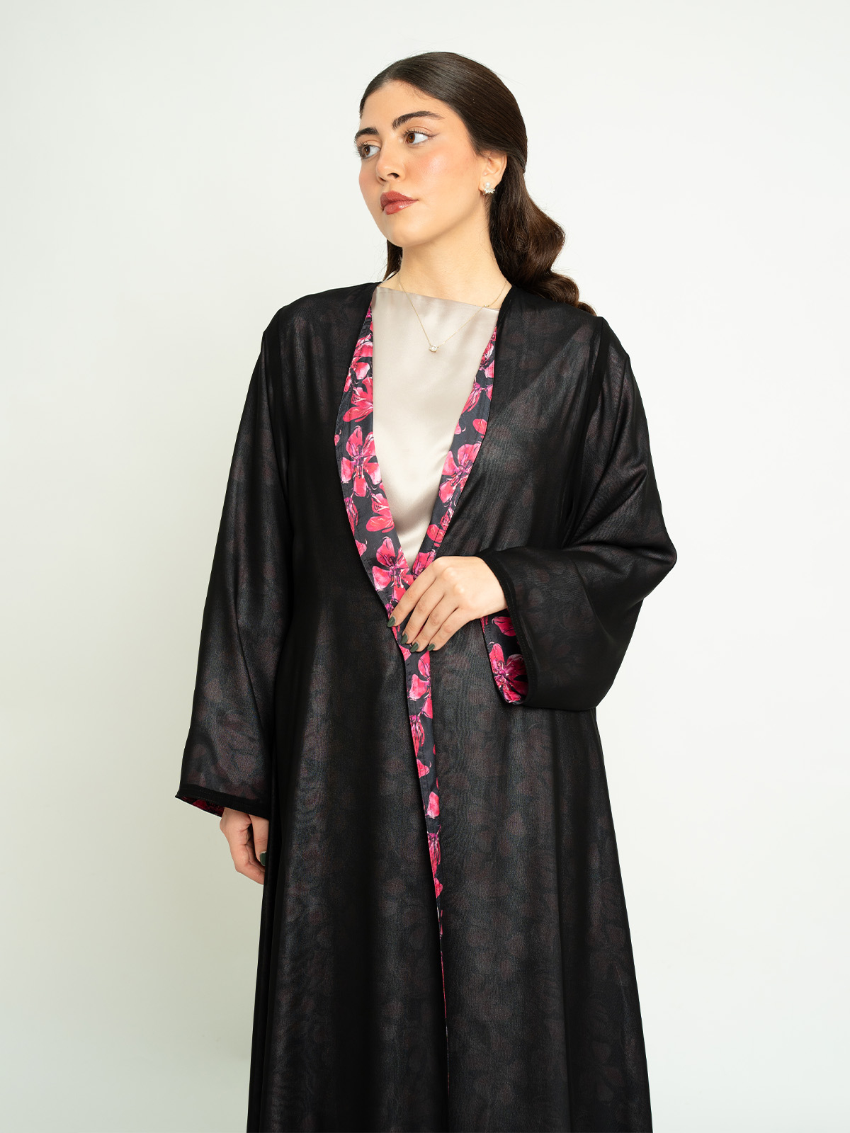 A new Eid A-cut half cloche double-face abaya made from high-quality satin fabric, offering a soft, breathable feel you’ll appreciate all day long. The reversible design offers versatile styling options; a plain side for a soft daytime look, and a floral-printed side for elegant evenings.