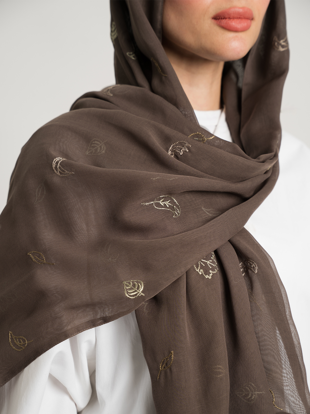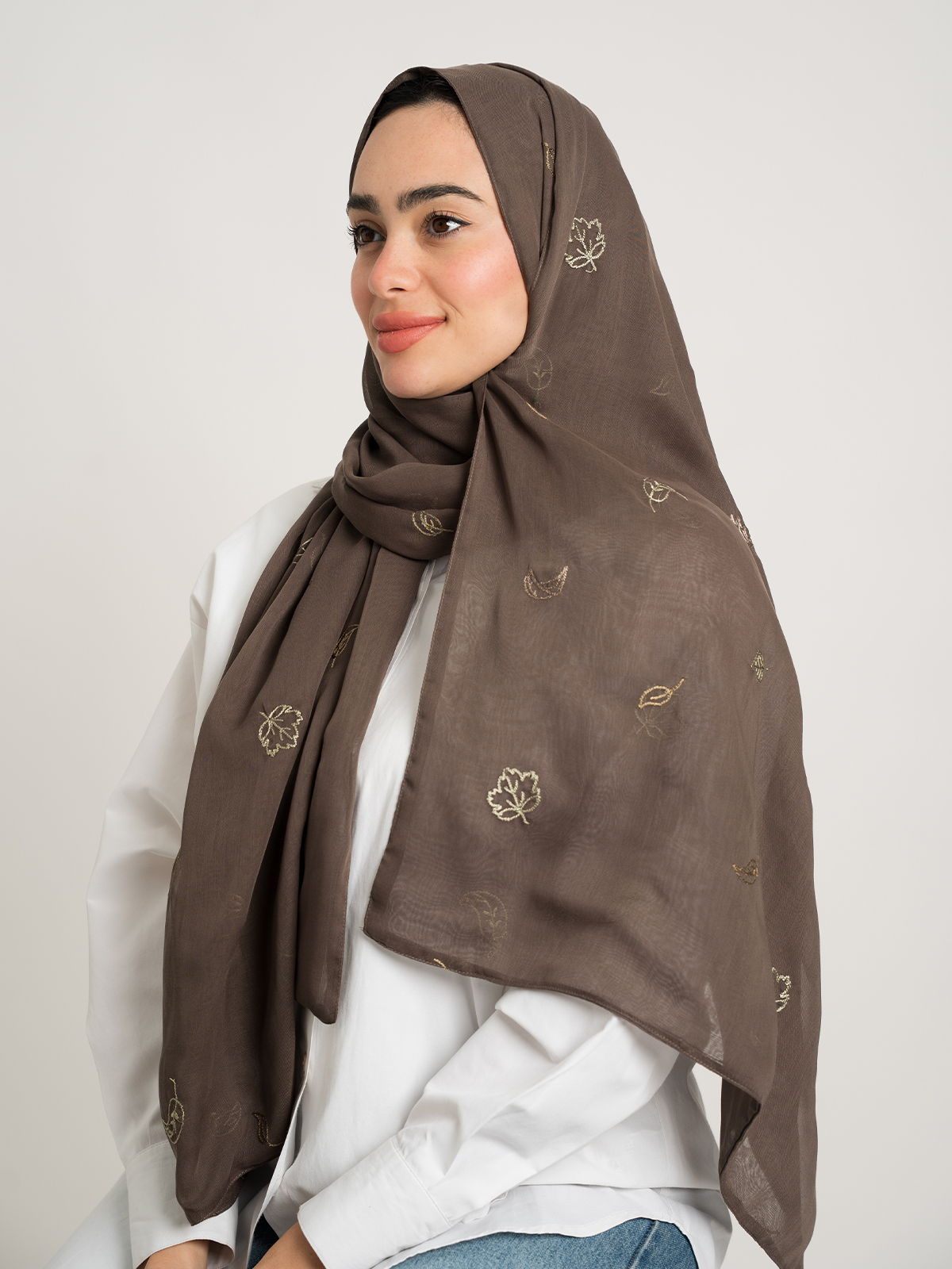 Hijab color: Mocha with Falling Leafs Embroidery.
