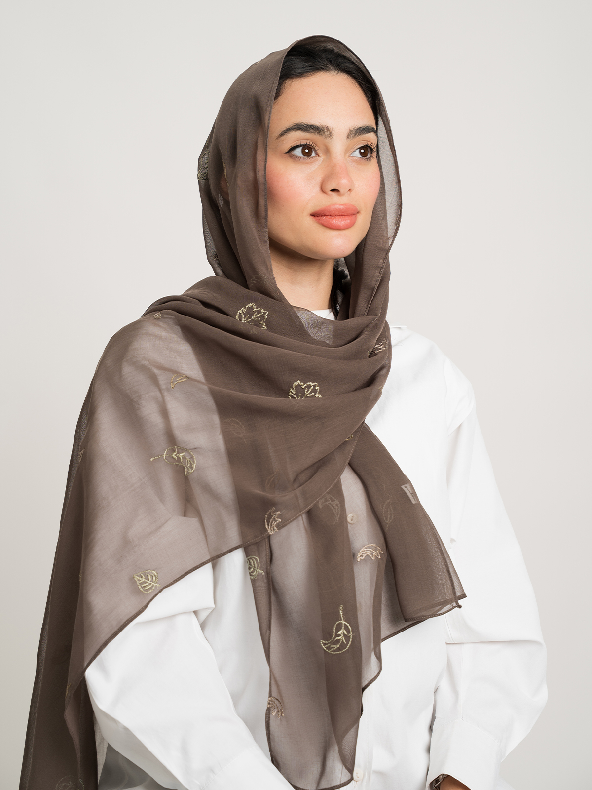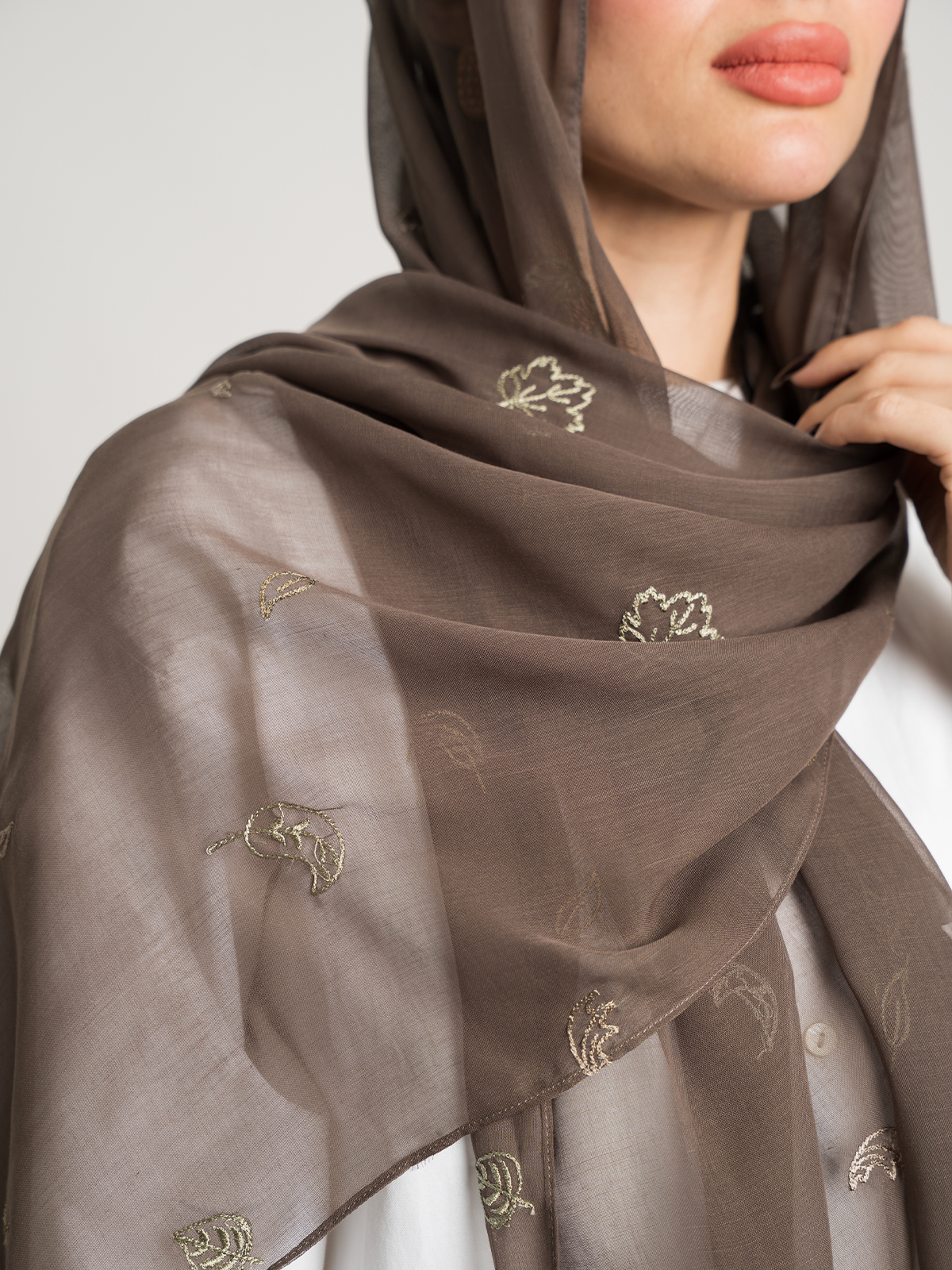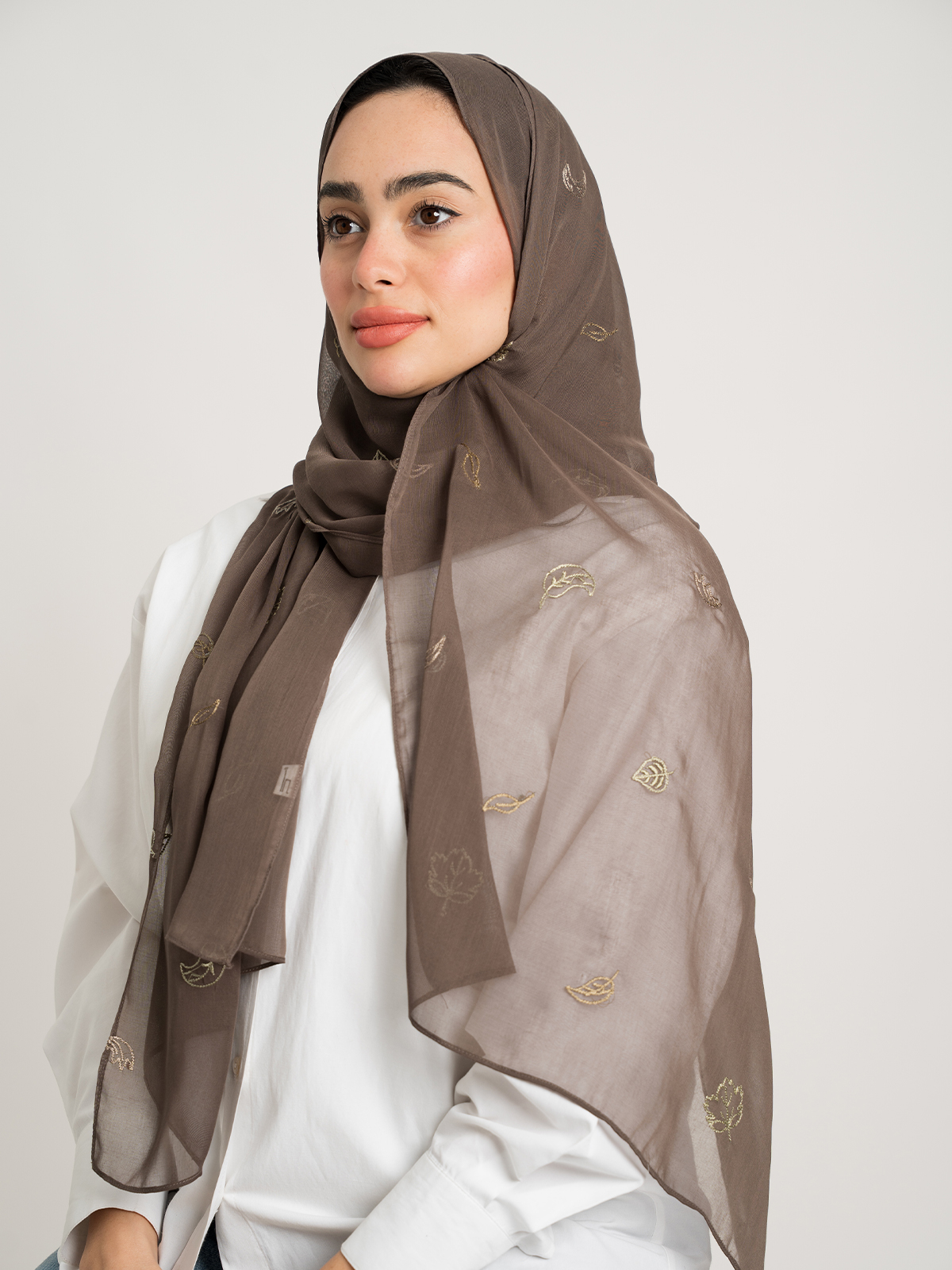 Hijab color: Mocha with Falling Leafs Embroidery.