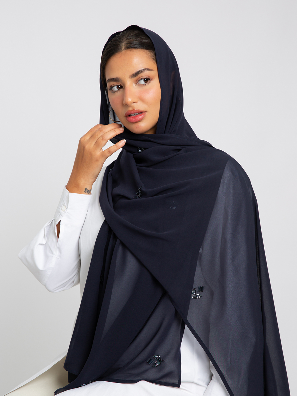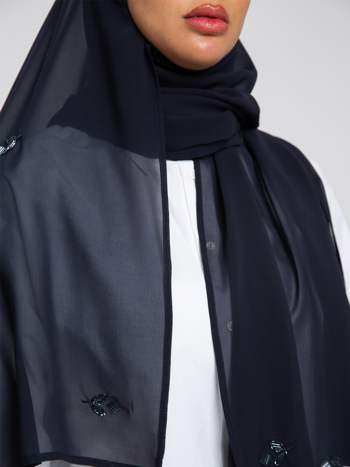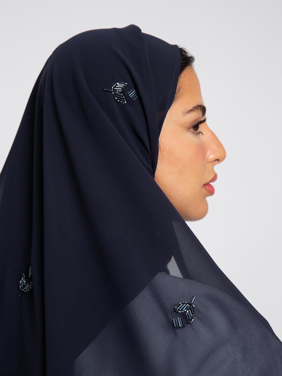 Hijab color: Navy Tarha with Flower Petals Embroidery.