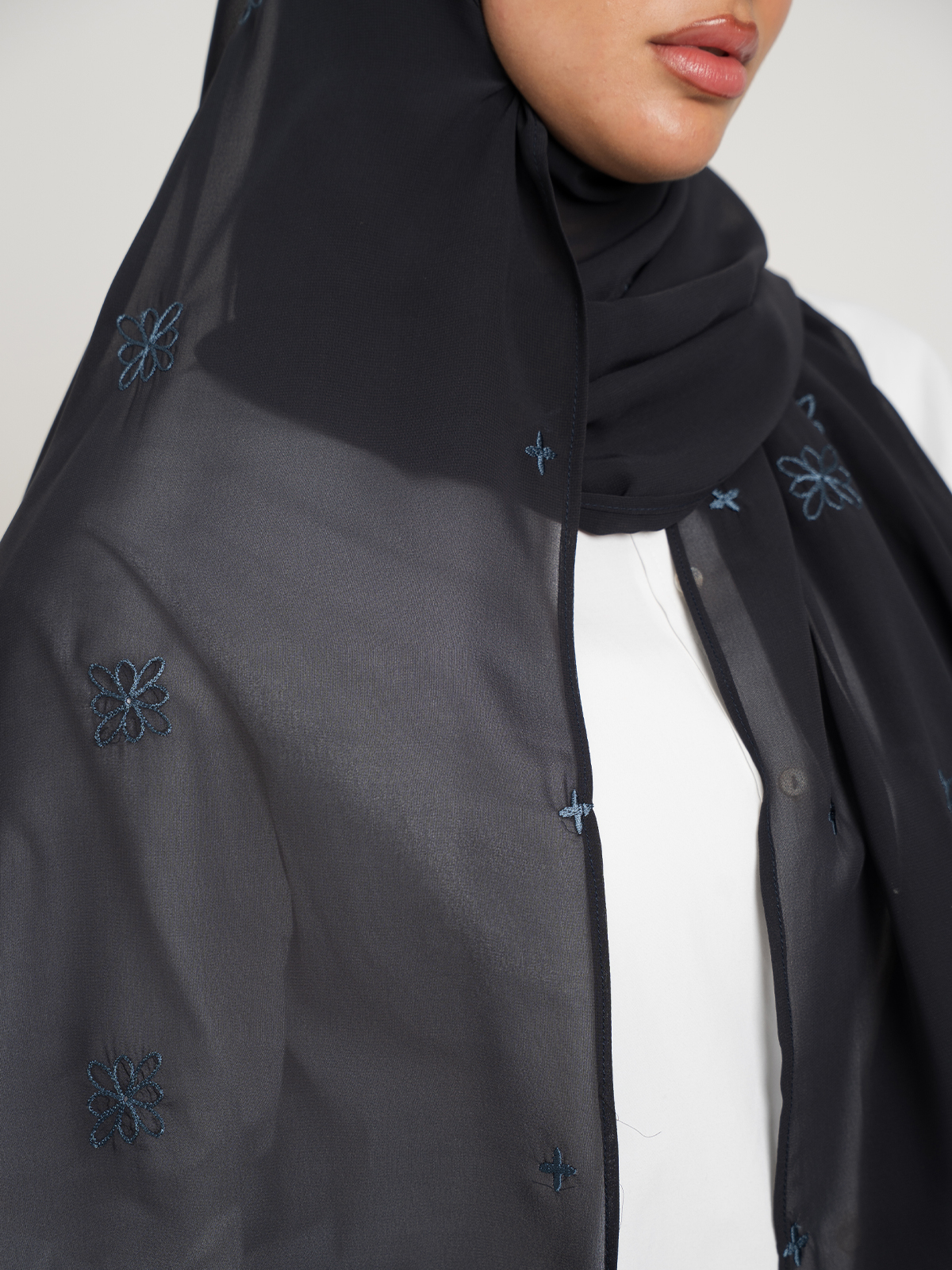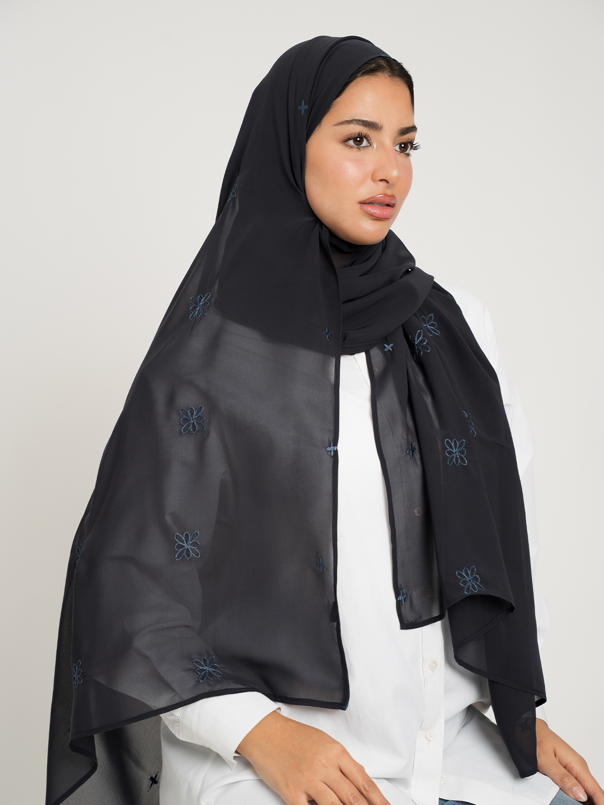 Hijab color: Navy Tarha with Powder Flower Embroidery.