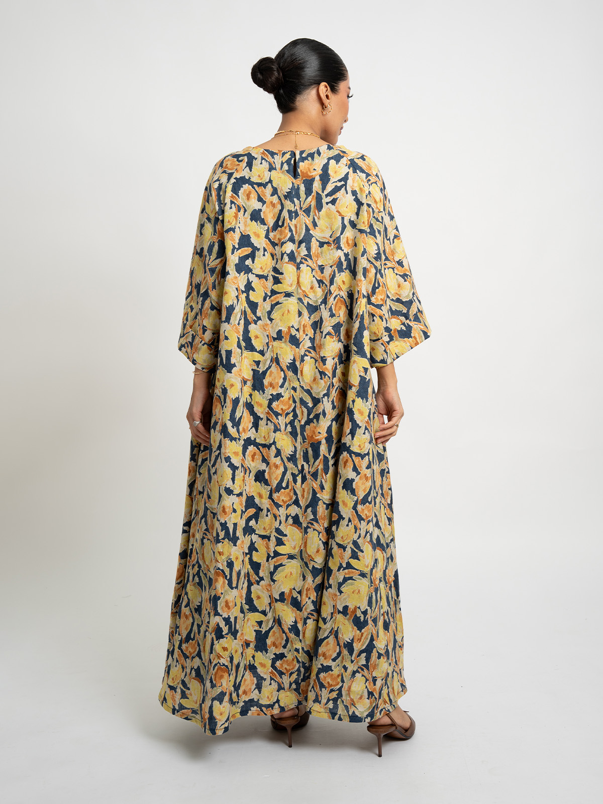 Half Cloche Midi Sleeves Jalabiya Ankle Length in Printed Linen Fabric