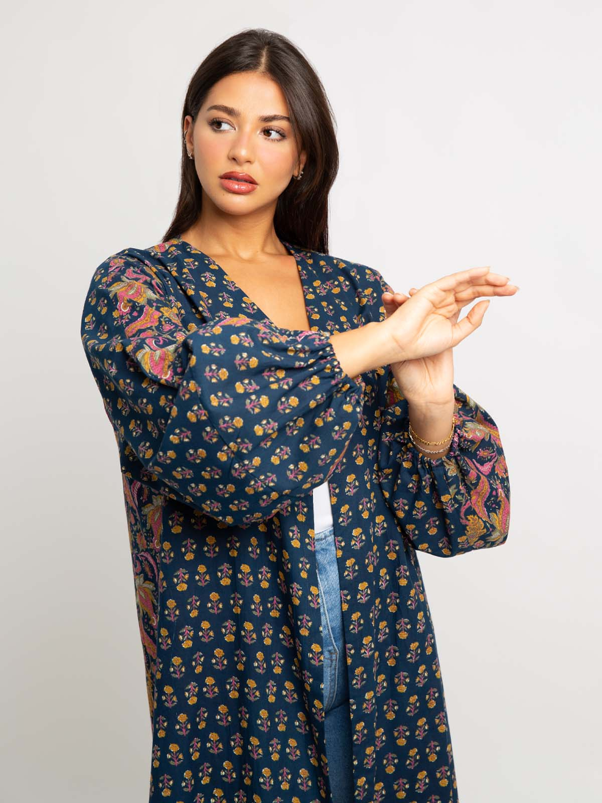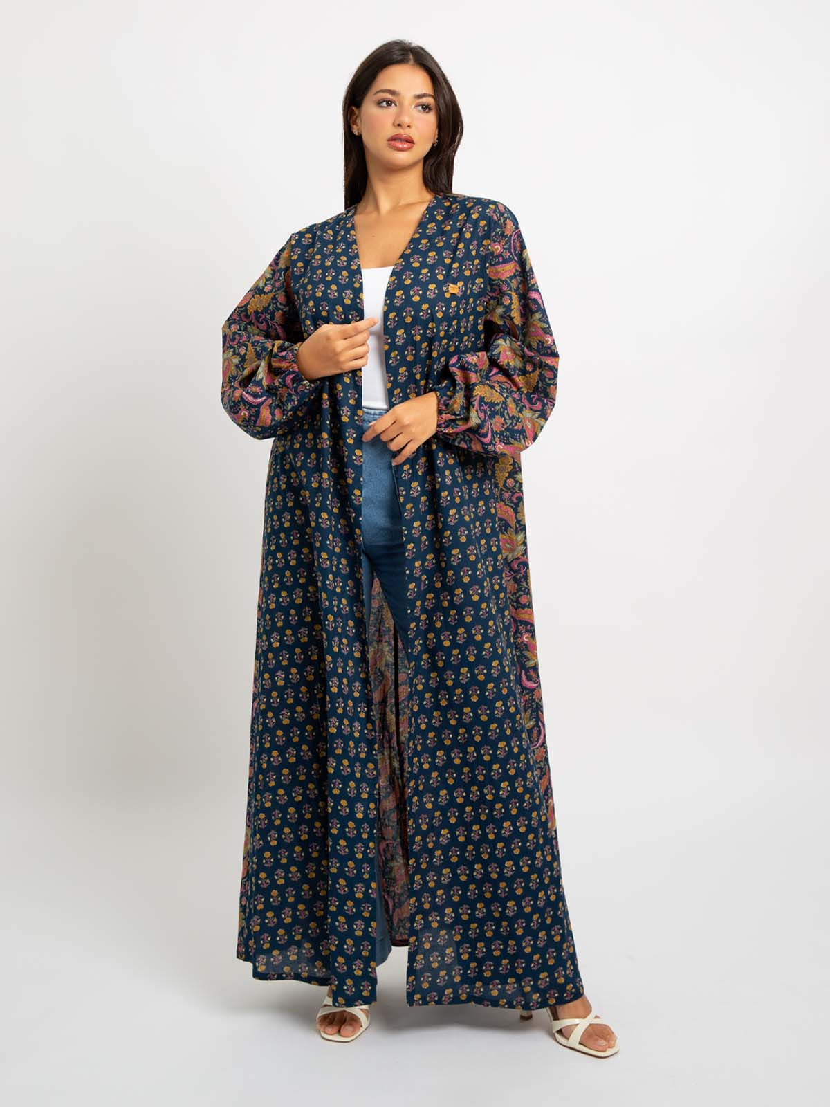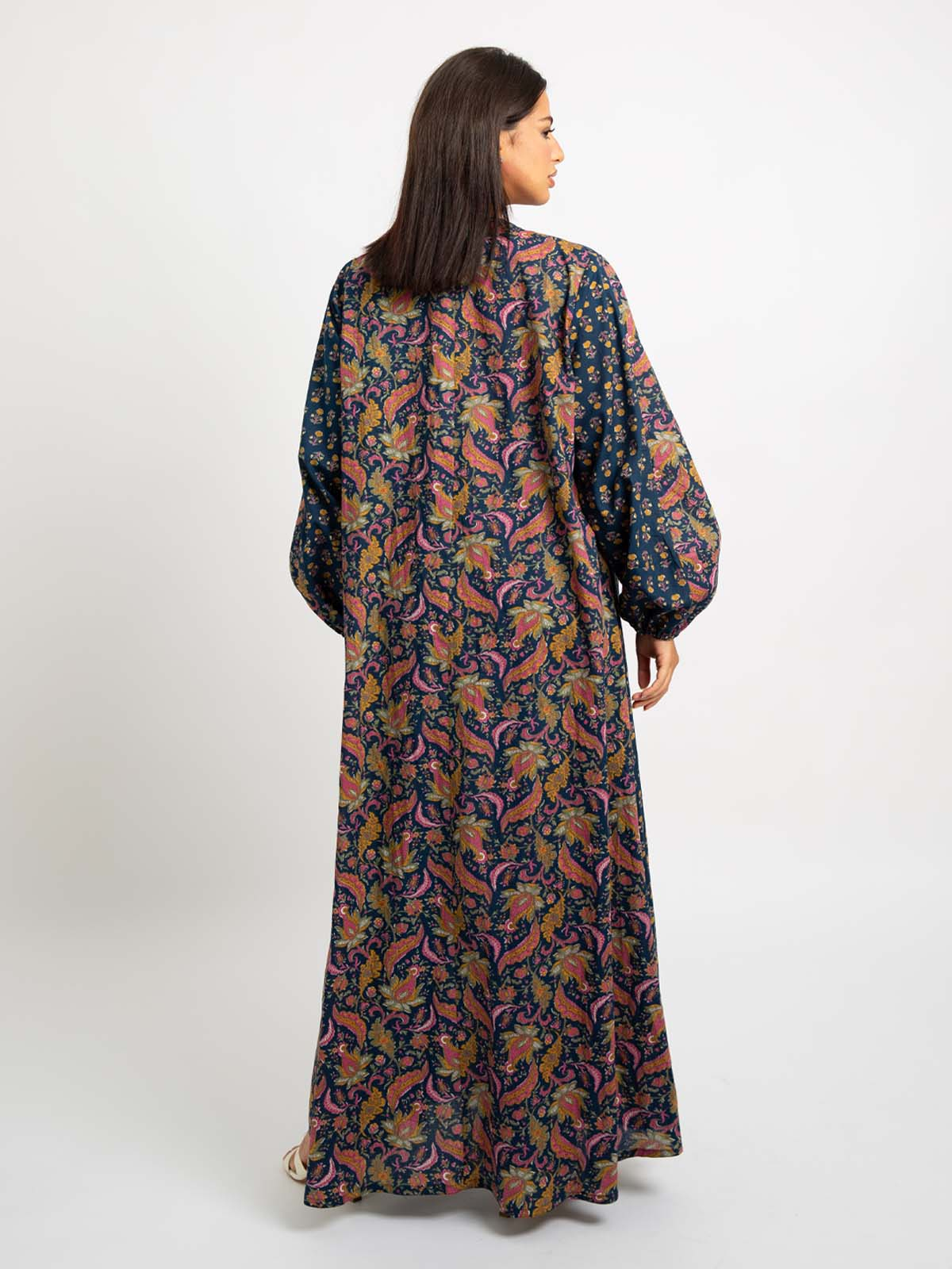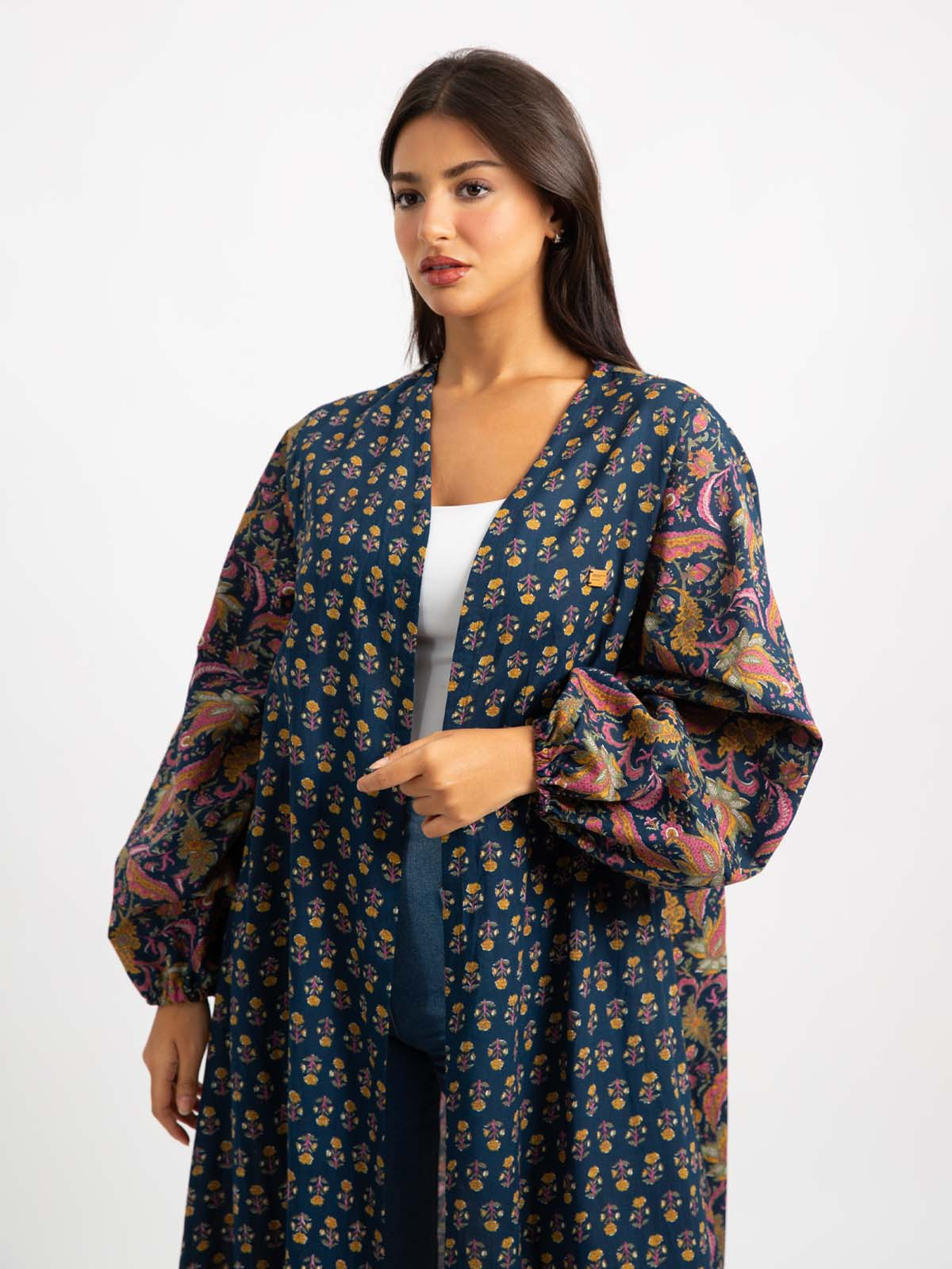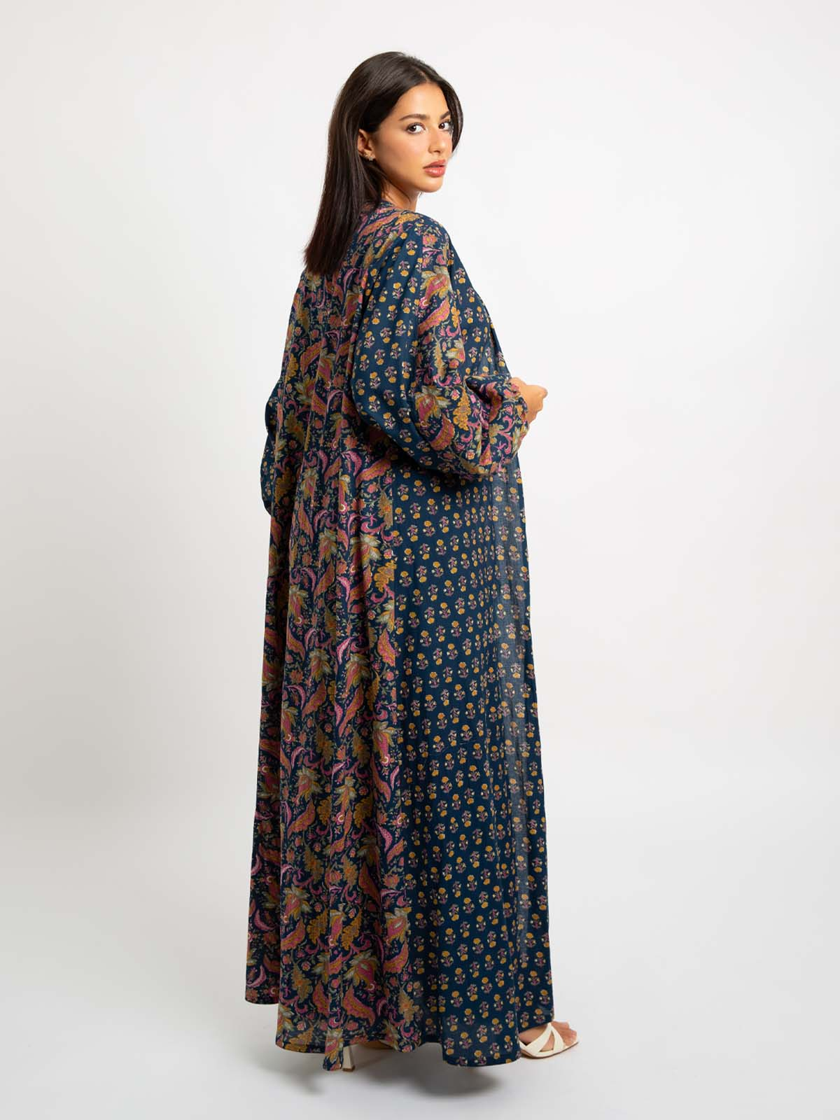 Half Cloche A-Cut Long Open Abaya with Puffed Sleeves in Printed Cotton Fabric