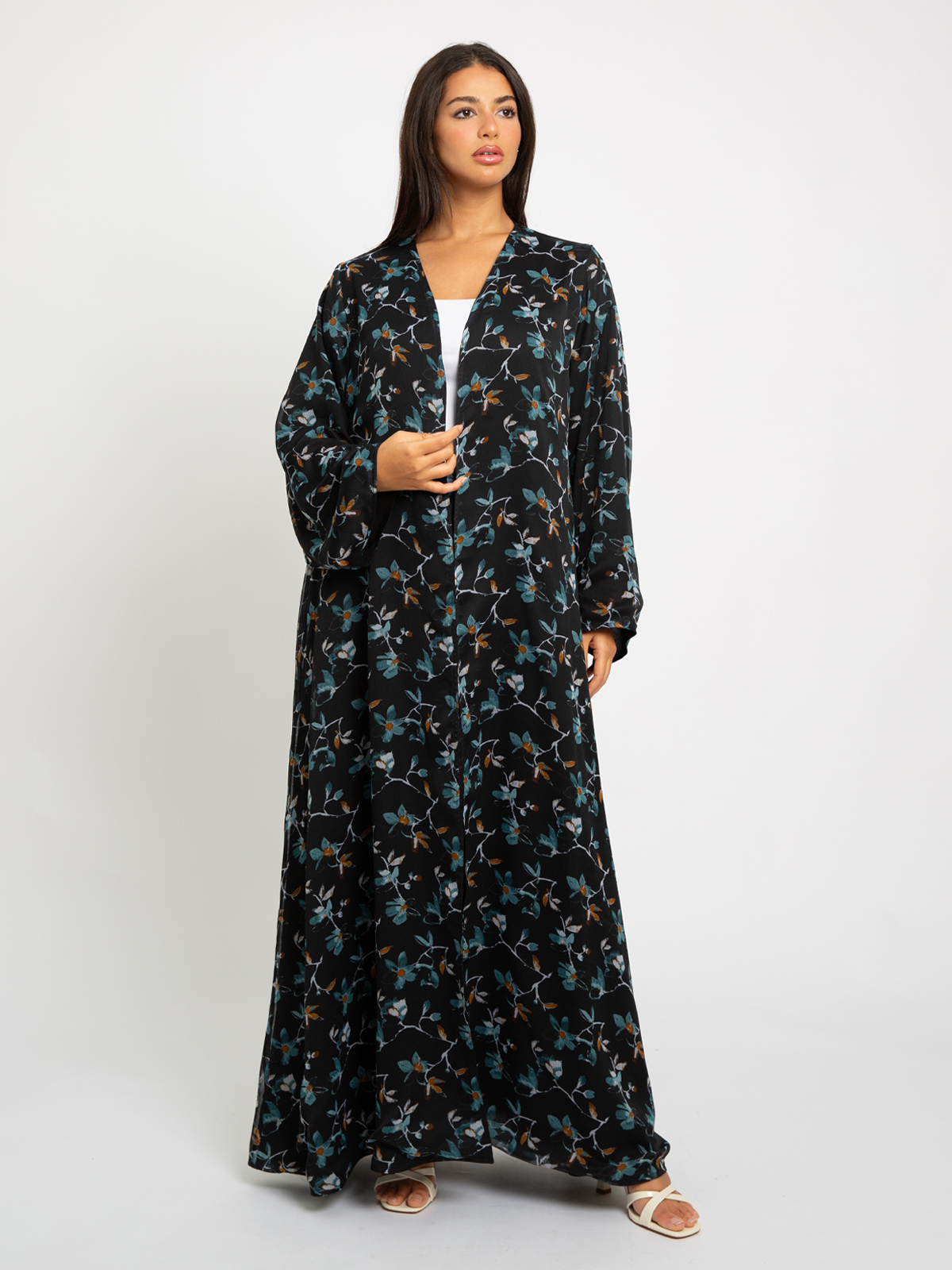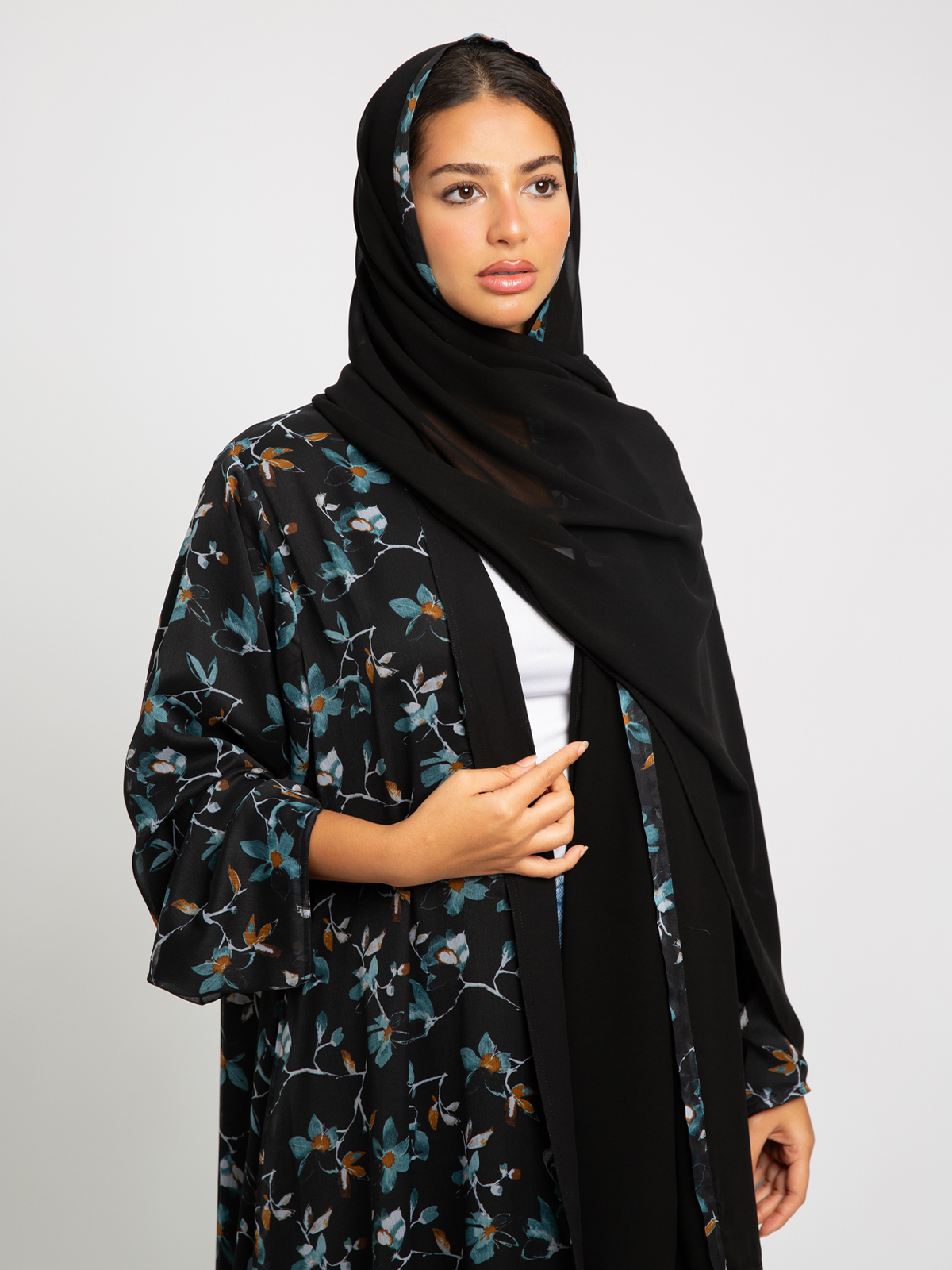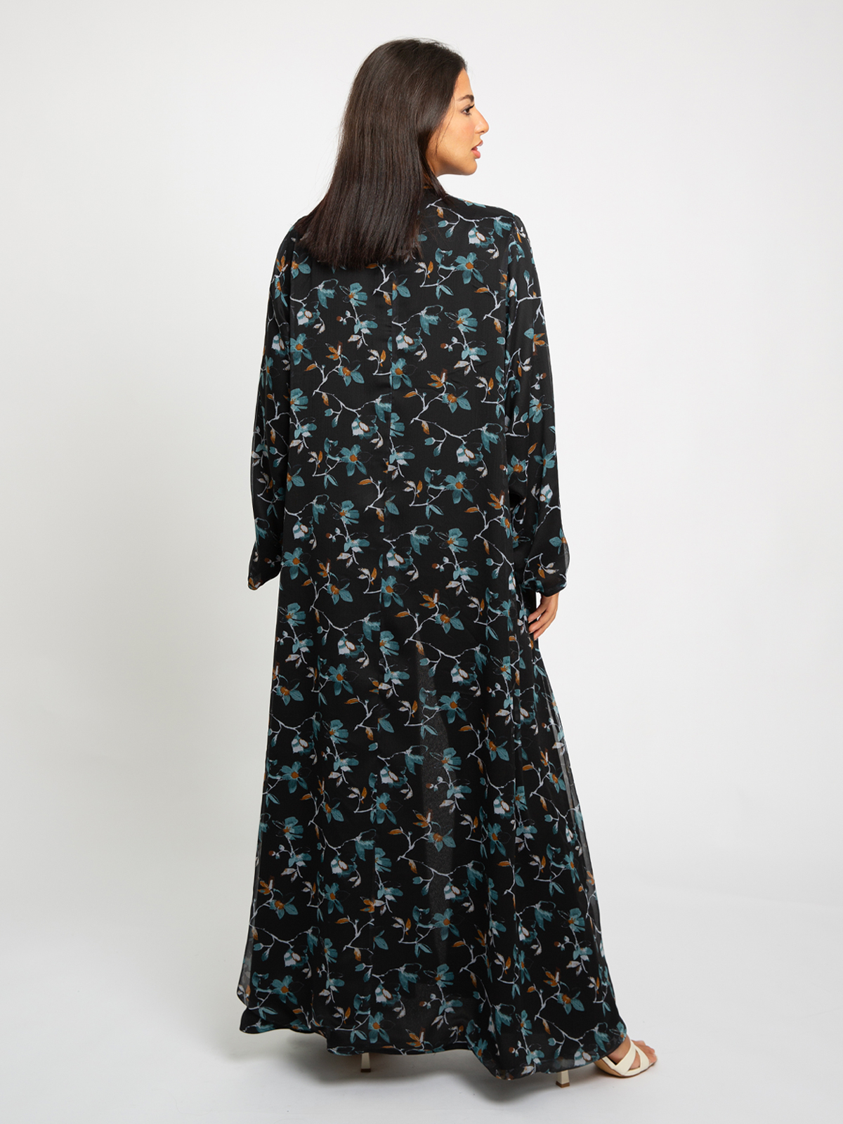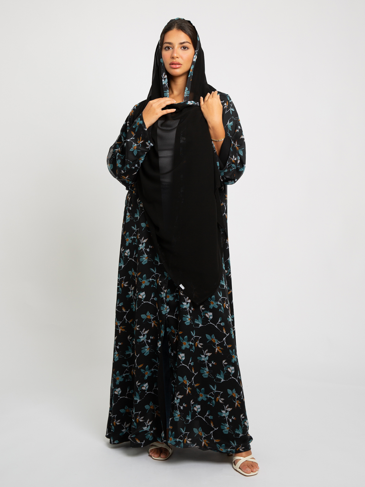 Double Face Half Cloche A-Cut Long Open Abaya in Printed Chiffon Fabric