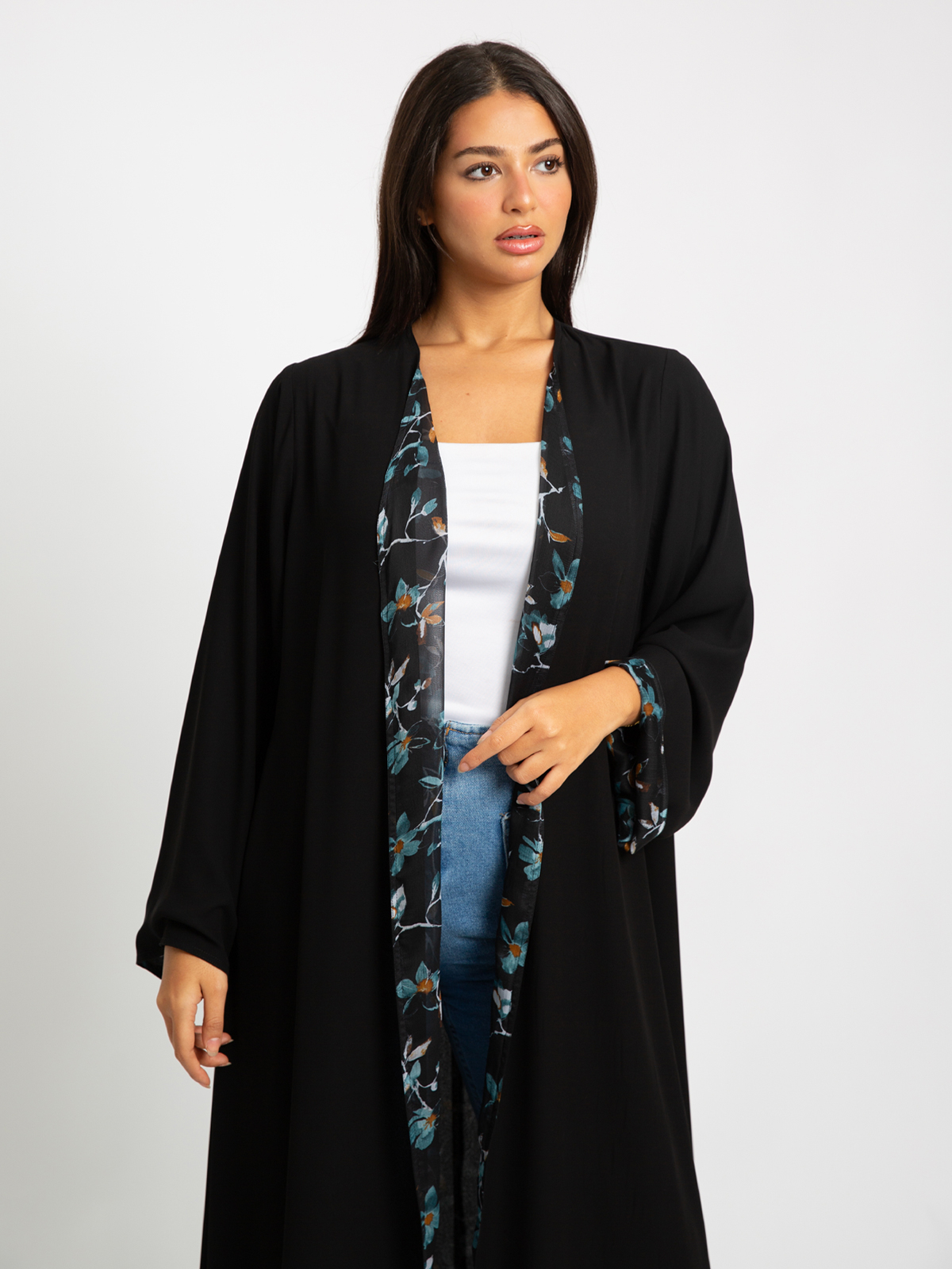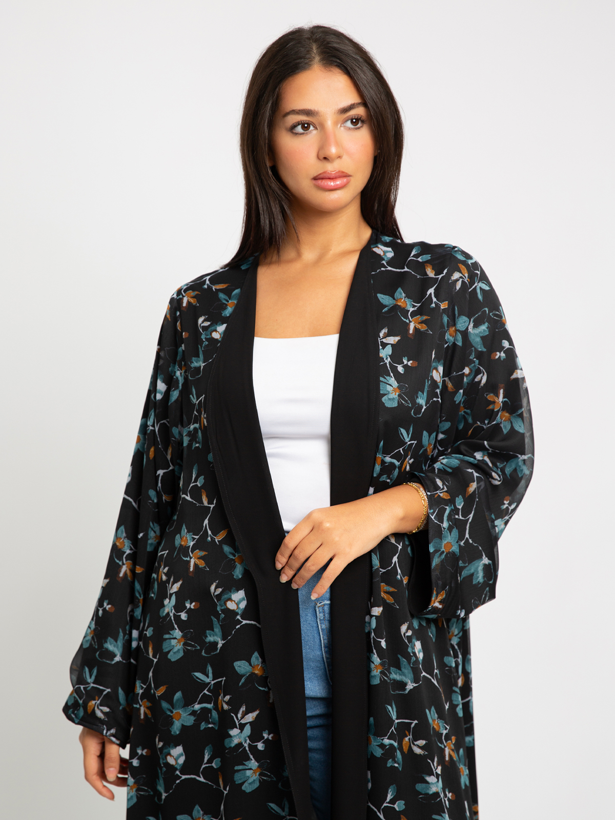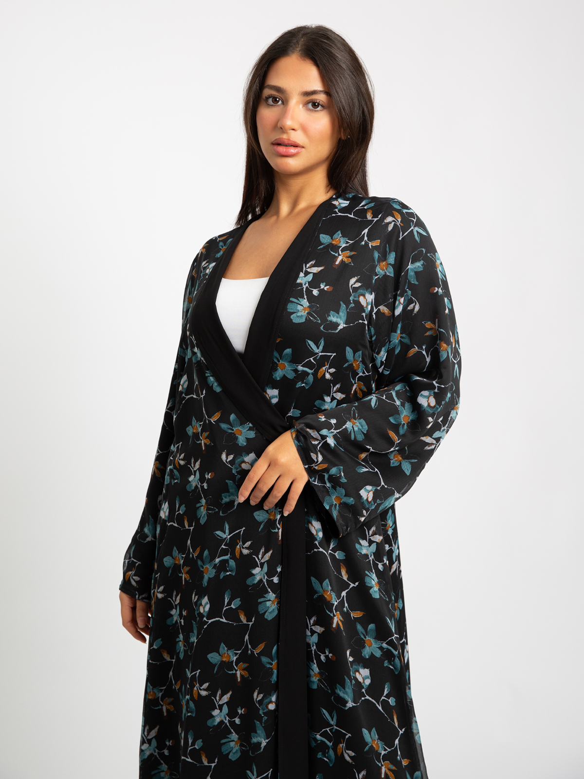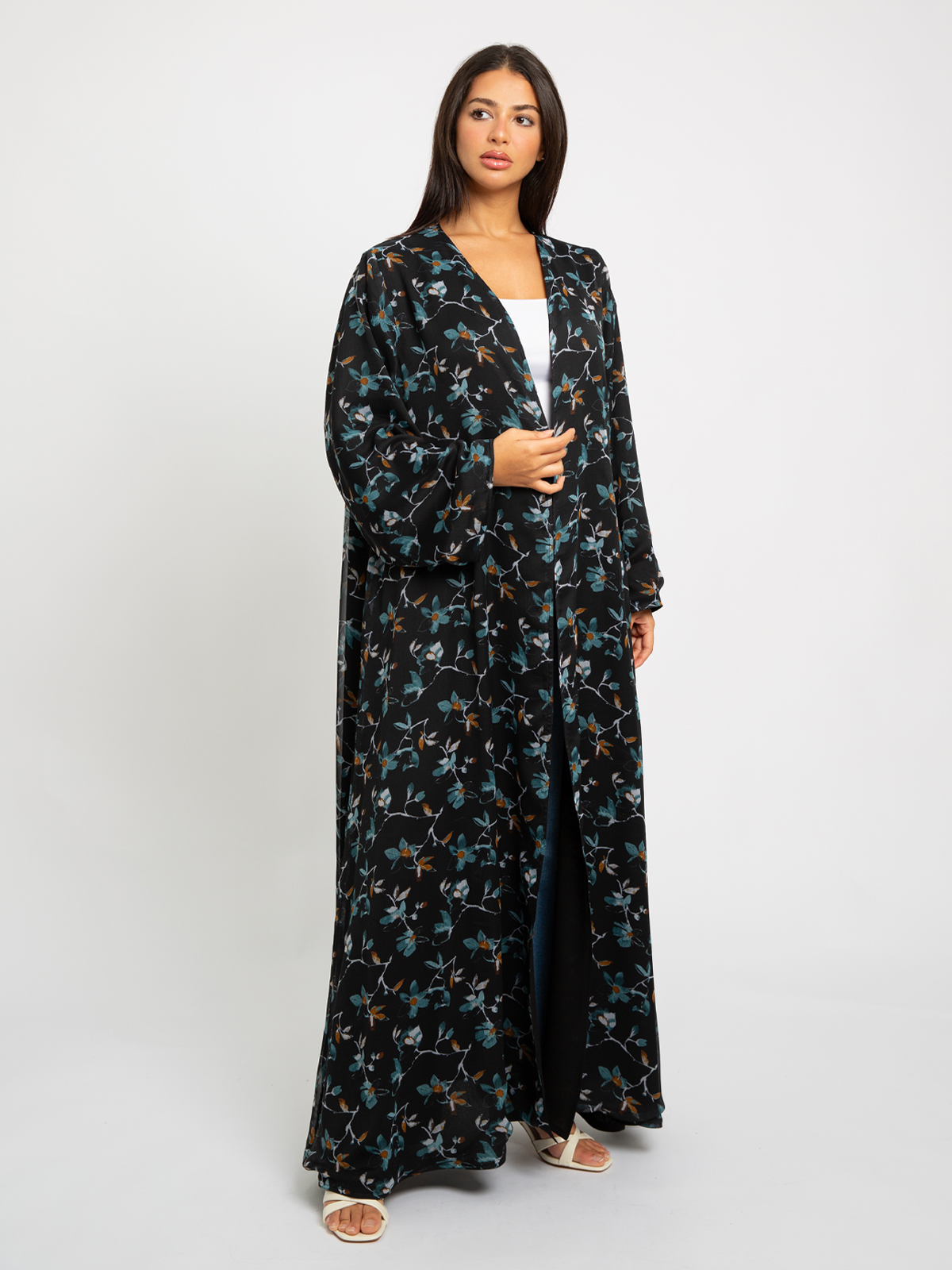 Double Face Half Cloche A-Cut Long Open Abaya in Printed Chiffon Fabric