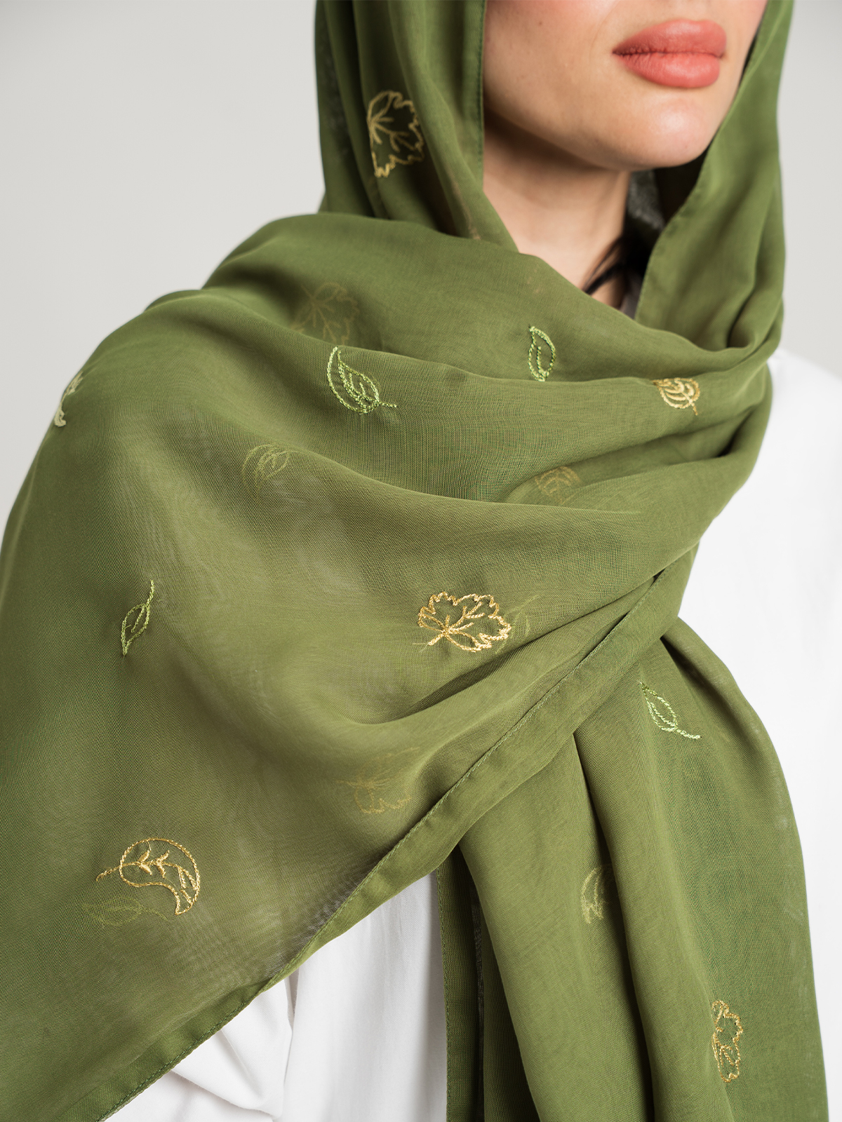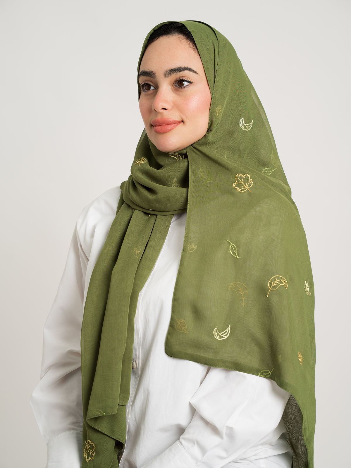 Voile Hijab with Falling Leaf Embroidery by Kaafmeem – Effortless Grace, All Day Long